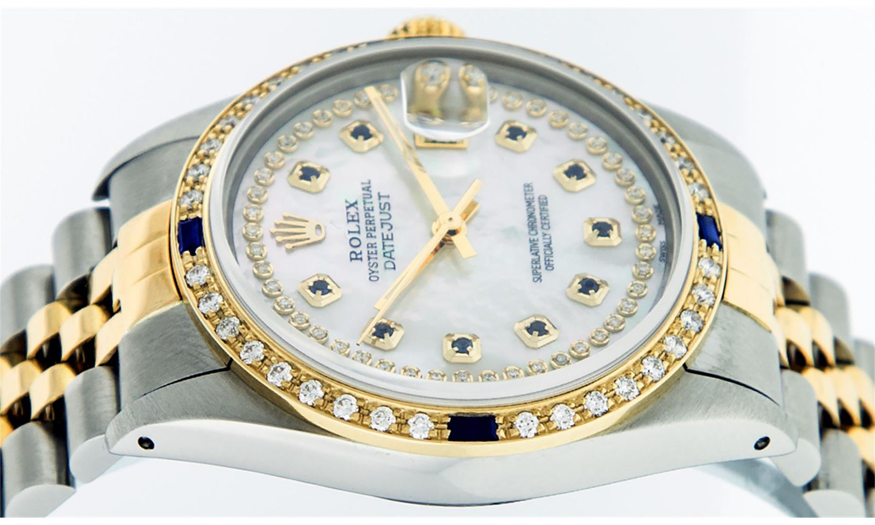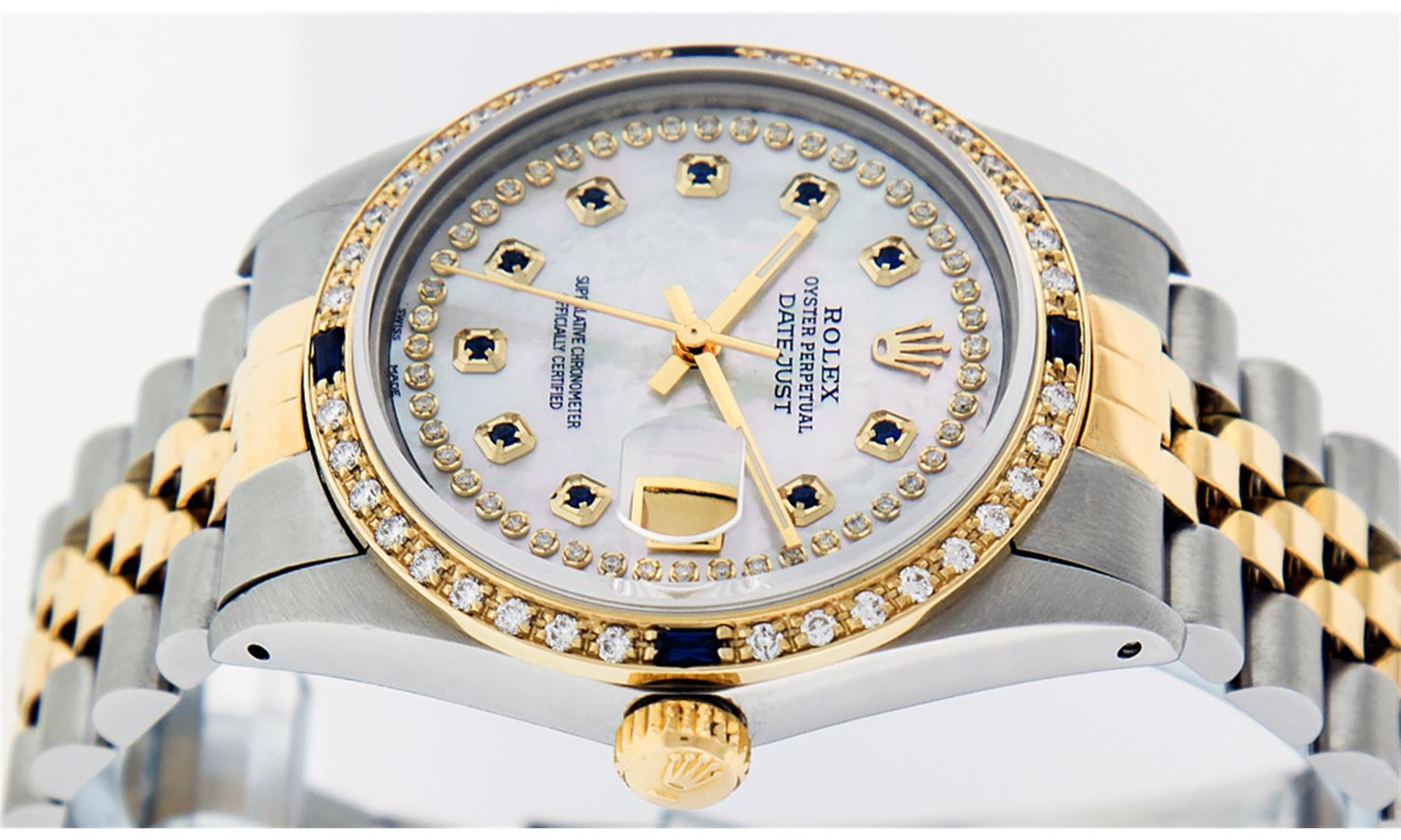 One Men's 14K Yellow Gold Two Tone Rolex Datejust Polished, Serviced & Electronically Tested, 14K Yellow Gold & Stainless Steel Case:36mm, 14K Yellow Gold Crown, Custom Bezel: New 18K Yellow Gold Sapphire Beadset Diamond Bezel, Diamond Count: 36 Diamonds + 4 Sapphires Total Weight 1.00 Carat, Clarity: SI-VS, Color: G to H. Custom Crystal: New Synthetic Sapphire Cyclops Lens. Custom Hands: New Luminescent Hands. Movement: Automatic Winding Movement Caliber 3035. Custom Dial: Mother Of Pearl Sapphire String Diamond Dial, Diamond + Gem Count: 10 Sapphires + 48 Diamonds in Dial G To H In Color, SI-VS Clarity. Date Window: 3 O'Clock Position Date Display, Quickset, Model: 16013 Condition: G-6 Extra Fine. Bracelet: Two Tone 14K Yellow Gold & Stainless Steel Jubilee. Bright Polish. 7.0 Inch Length, Adjustable. Standard Clasp, With Rolex Logo. This Watch Has Been Serviced Time Tested And Is In Excellent Condition It Is Free Of All Scratches And Dents.
