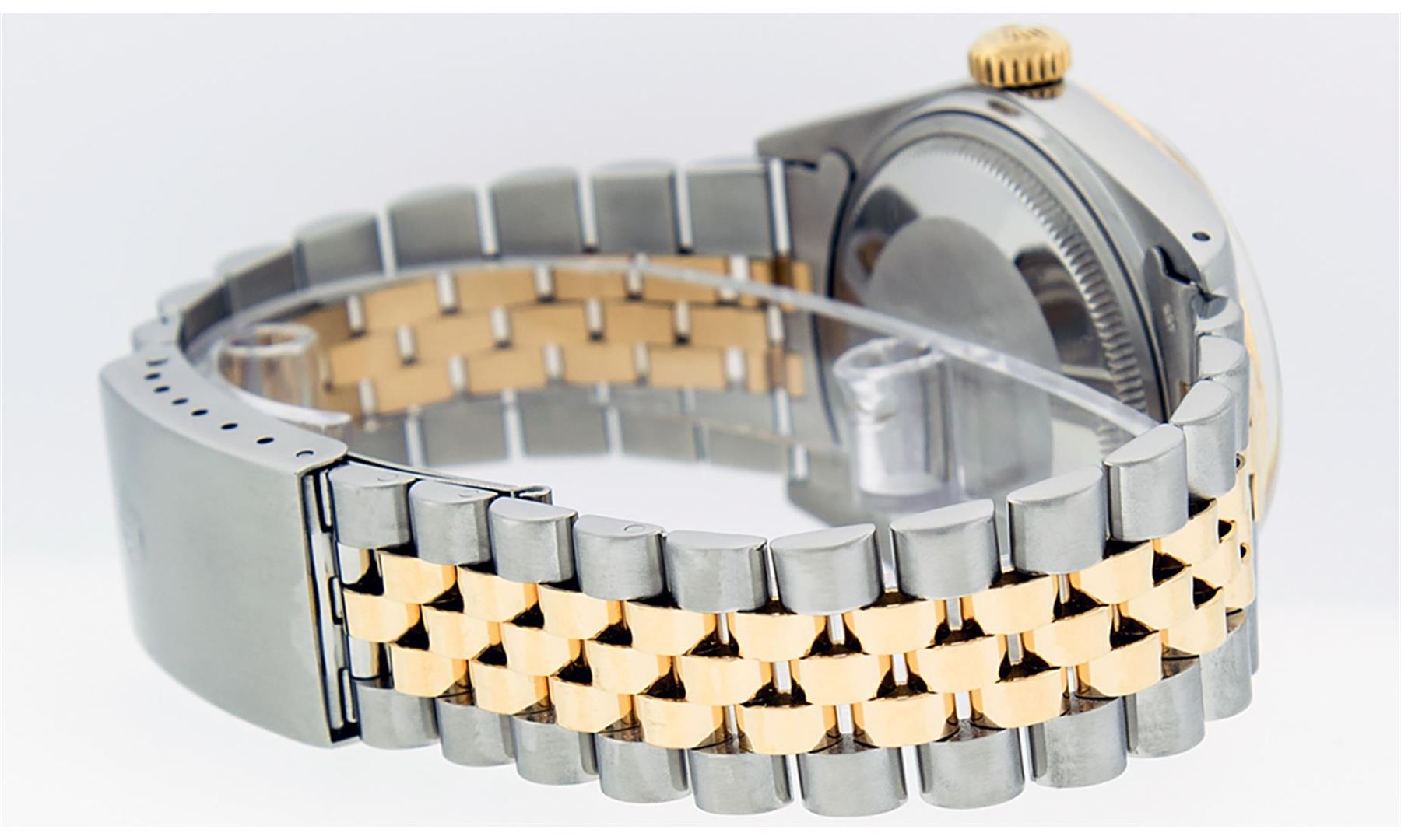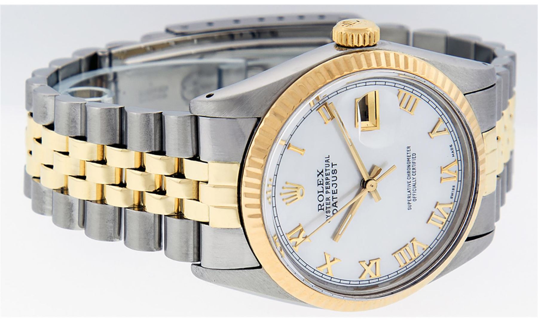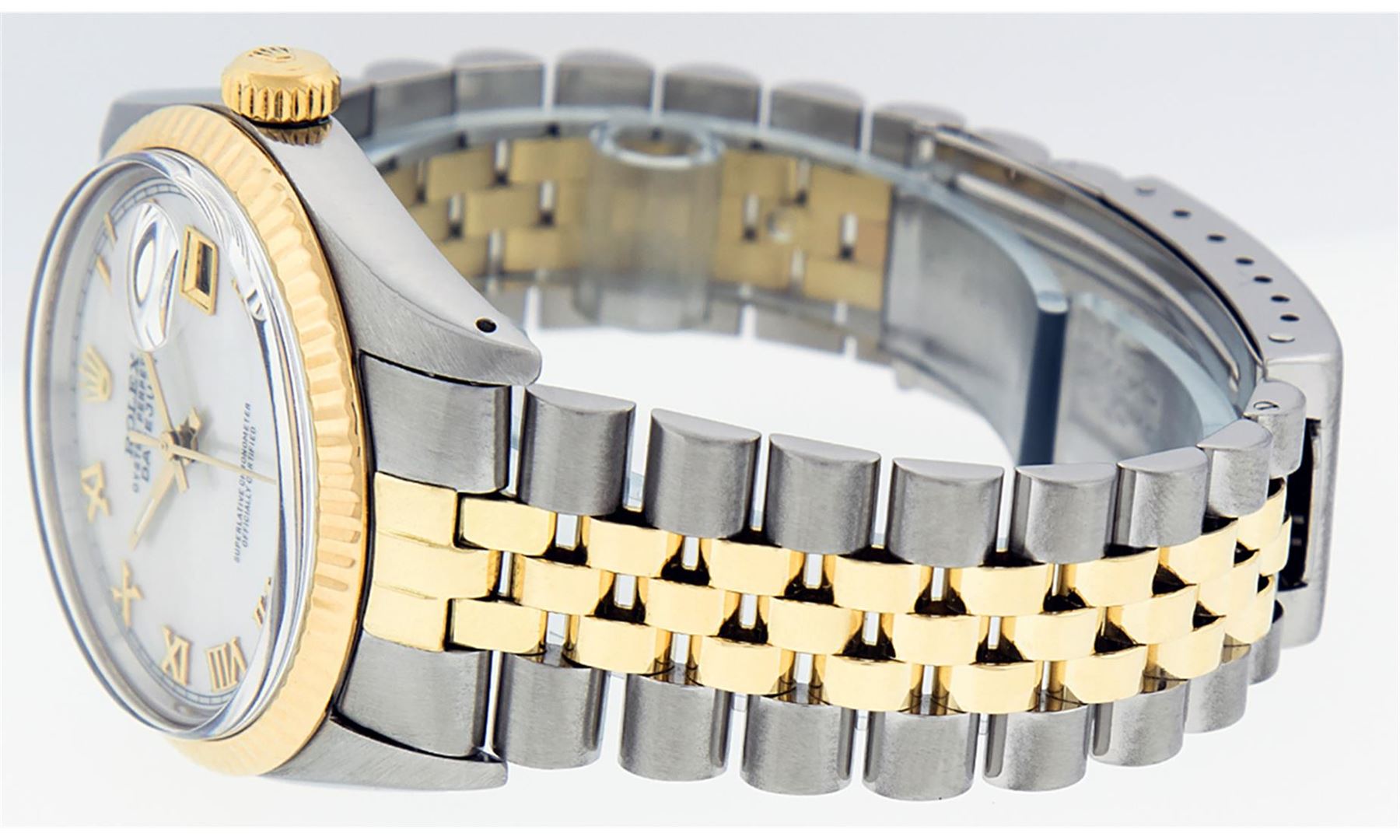 One Mens 14K Yellow Gold Two Tone Rolex Datejust Polished, Serviced & Electronically Tested, 14K Yellow Gold & Stainless Steel Case: 36mm,14K Yellow Gold Crown, Bezel: 14K Yellow Gold Fluted Bezel. Custom Crystal: New Acrylic Cyclops Lens. Custom Hands: New Luminecent Hands. Movement: Automatic Winding Movement Caliber 3035. Custom Dial: Mother Of Pearl Roman With Square Track. Date Window: 3 O'Clock Position Date Display, Quickset, Model: 16013 Datejust. Condition: G-6 Extra Fine. Bracelet:Two Tone 14K Yellow Gold & Stainless Steel Jubilee. Bright Polish. 7.0 Inch Length, Adjustable. Standard Clasp, With Rolex Logo. This Watch Has Been Serviced Time Tested And Is In Excellent Condition It Is Free Of All Scratches And Dents.