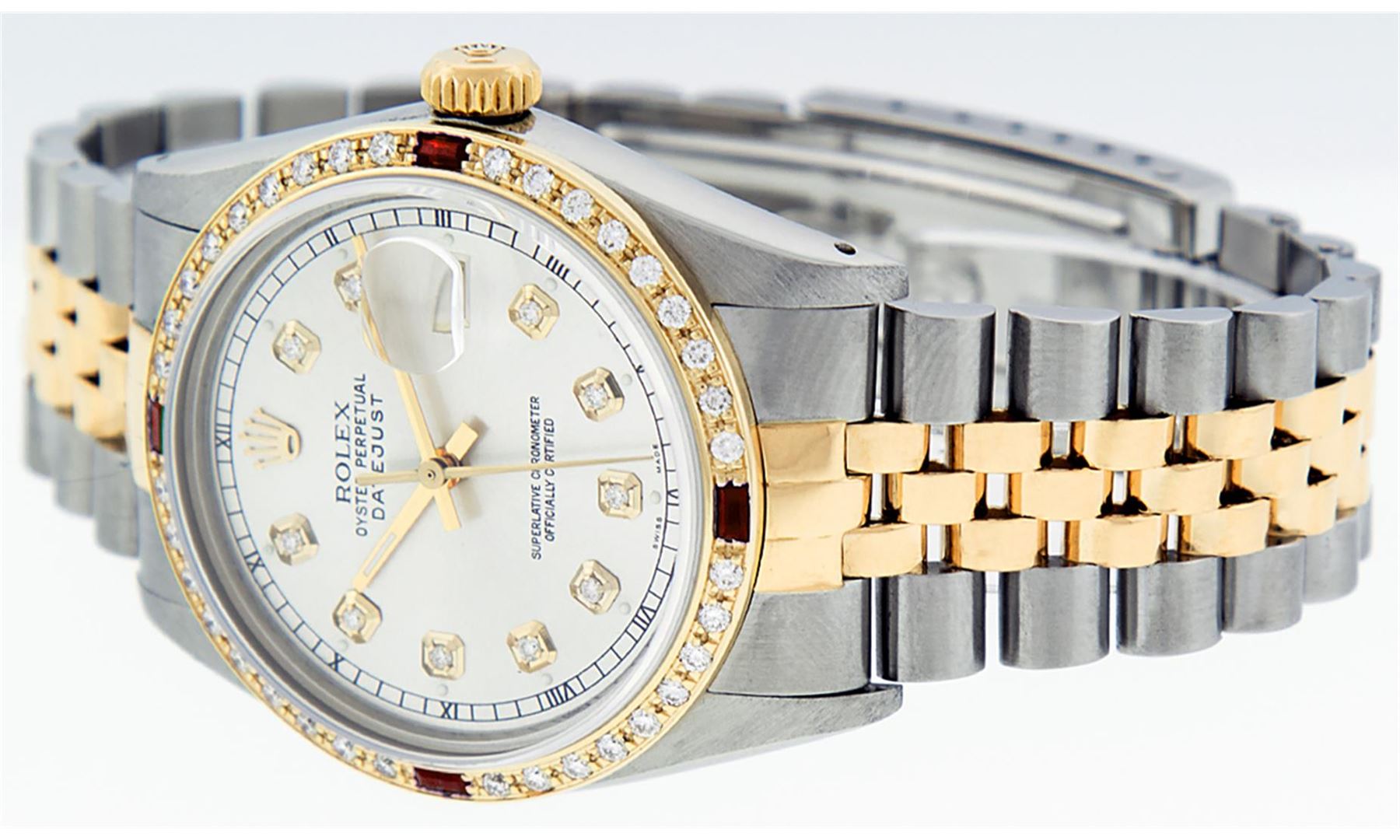 One Mens 14K Yellow Gold Two Tone Rolex Datejust Polished, Fully Serviced & Electronically Tested, 14K Yellow Gold & Stainless Steel Case: 36mm, 14K Yellow Gold Crown, Custom Bezel: 18K Yellow Gold Ruby Beadset Diamond Bezel, Diamond Count: 36 Diamonds + 4 Rubies, Total Weight 1.0 Carat, Clarity: Si-VS, Color: G to H. Custom Crystal: New Synthetic Sapphire Cyclops Lens. Custom Hands: New Luminecent Hands. Movement: Automatic Winding Movement Caliber 3035. Custom Dial: Silver Diamond Dial With Square Roman Track and Luminescent Dots , Diamond Count: 10 Diamonds In Dial, Color: G to H, Clarity: SI-VS. Date Window: 3 O'Clock Position Date Display, Quickset, Model: 16013 Datejust. Condition: G-6 Extra Fine. Bracelet: Two Tone 14K Yellow Gold & Stainless Steel Jubilee. Bright Polish. 7.0 Inch Length, Adjustable. Standard Clasp, With Rolex Logo. This Watch Has Been Serviced Time Tested And Is In Excellent Condition It Is Free Of All Scratches And Dents.
