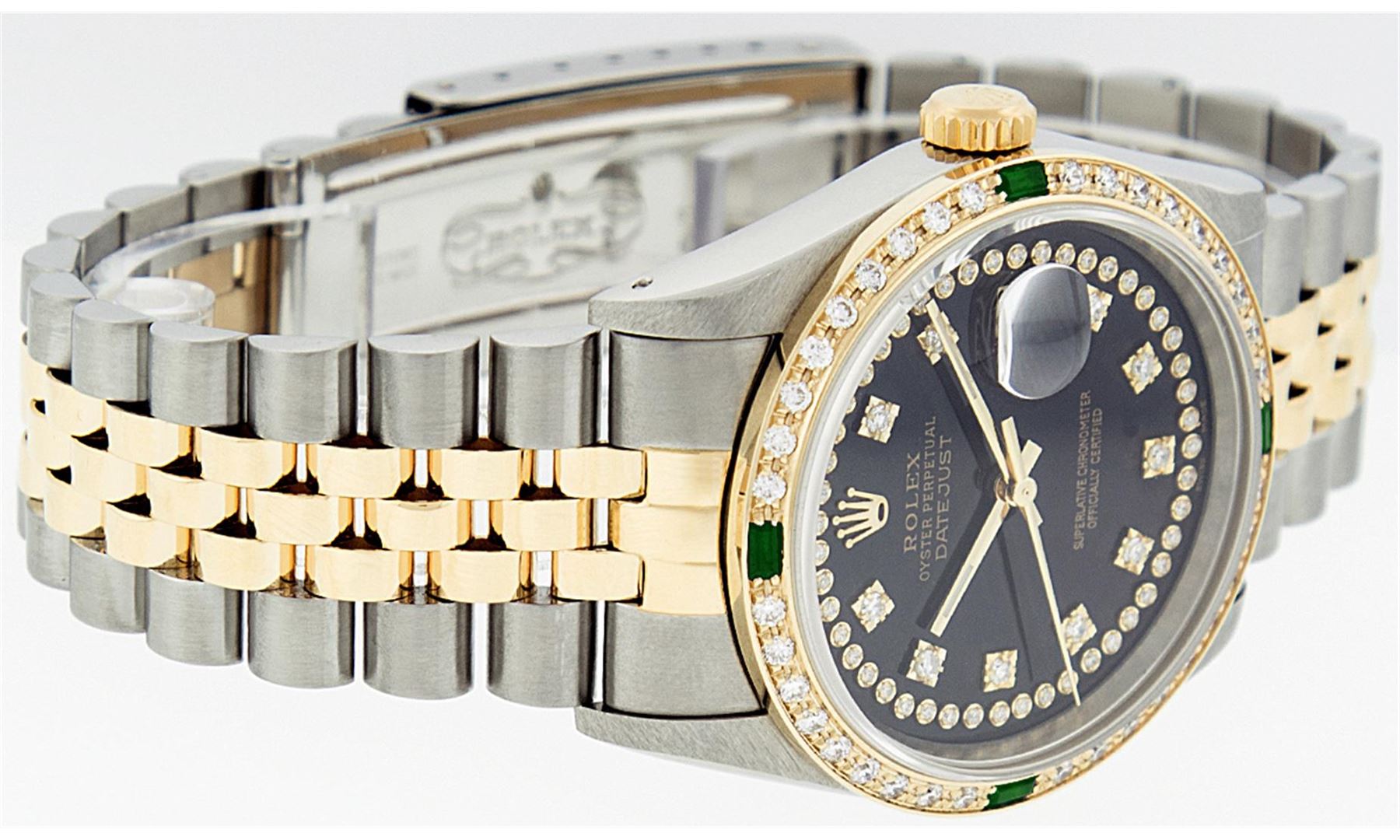 One Men's Two Tone Rolex Datejust Polished, Serviced & Electronically Tested, 14K Yellow Gold & Stainless Steel Case:36mm, 14K Yellow Gold Crown, Custom Bezel: 18K Yellow Gold Emerald Beadset Diamond Bezel, Diamond Count: 36 Diamonds + 4 Emeralds, Total Weight 1.00 Carat, Clarity: SI-VS, Color: G to H. Custom Crystal: Synthetic Sapphire Cyclops Lens. Movement: Automatic Winding Movement Caliber 3035. Custom Dial: Black String Diamond Dial VVS , Diamond Count: 58 Diamonds in Dial G To H In Color, VVS Clarity. Date Window: 3 O'clock Position Date Display, Quickset, Model: 16013 Condition: G-6 Extra Fine. Bracelet: Two Tone 14K Yellow Gold & Stainless Steel Jubilee. Bright Polish. 7.0 Inch Length, Adjustable. Standard Clasp, With Rolex Logo.