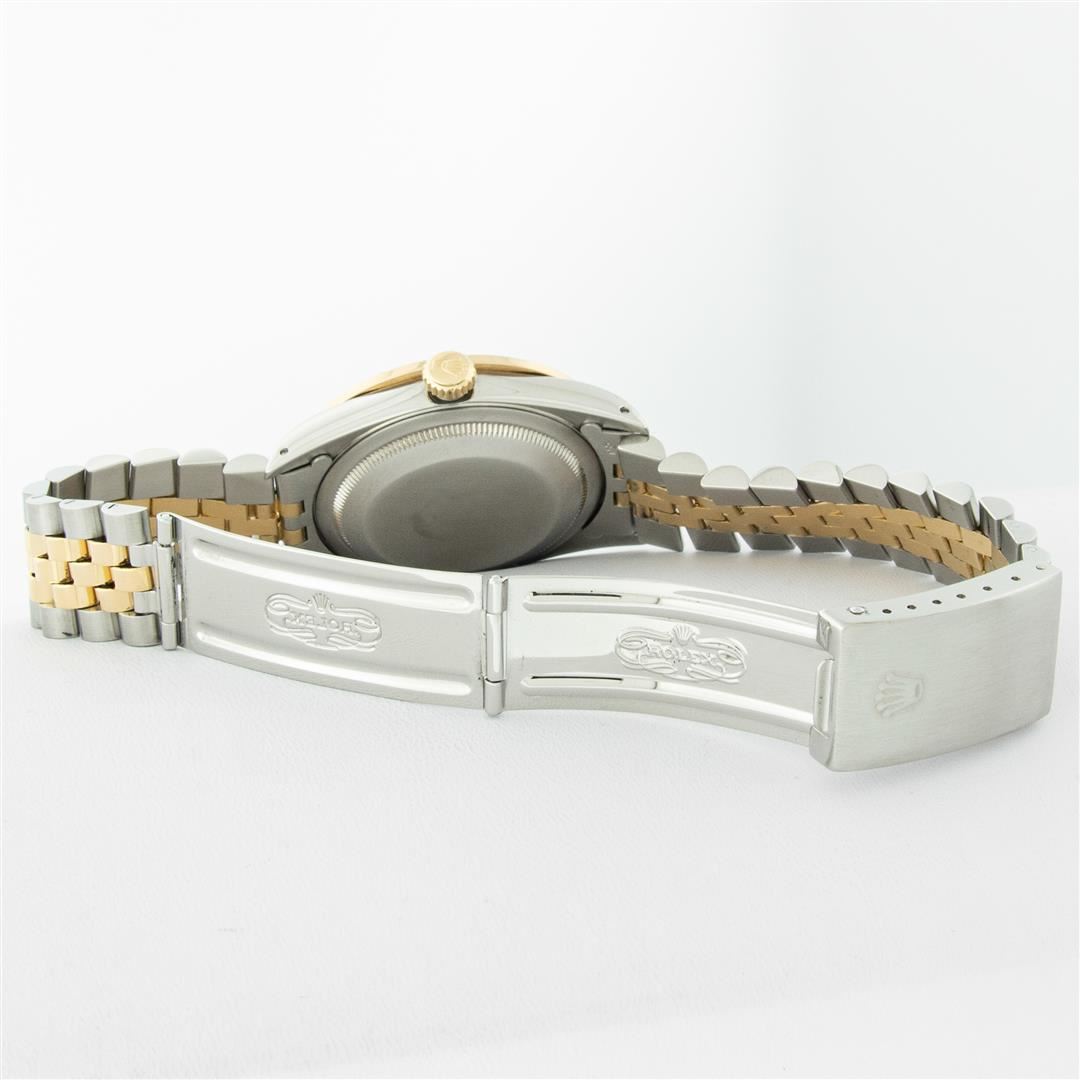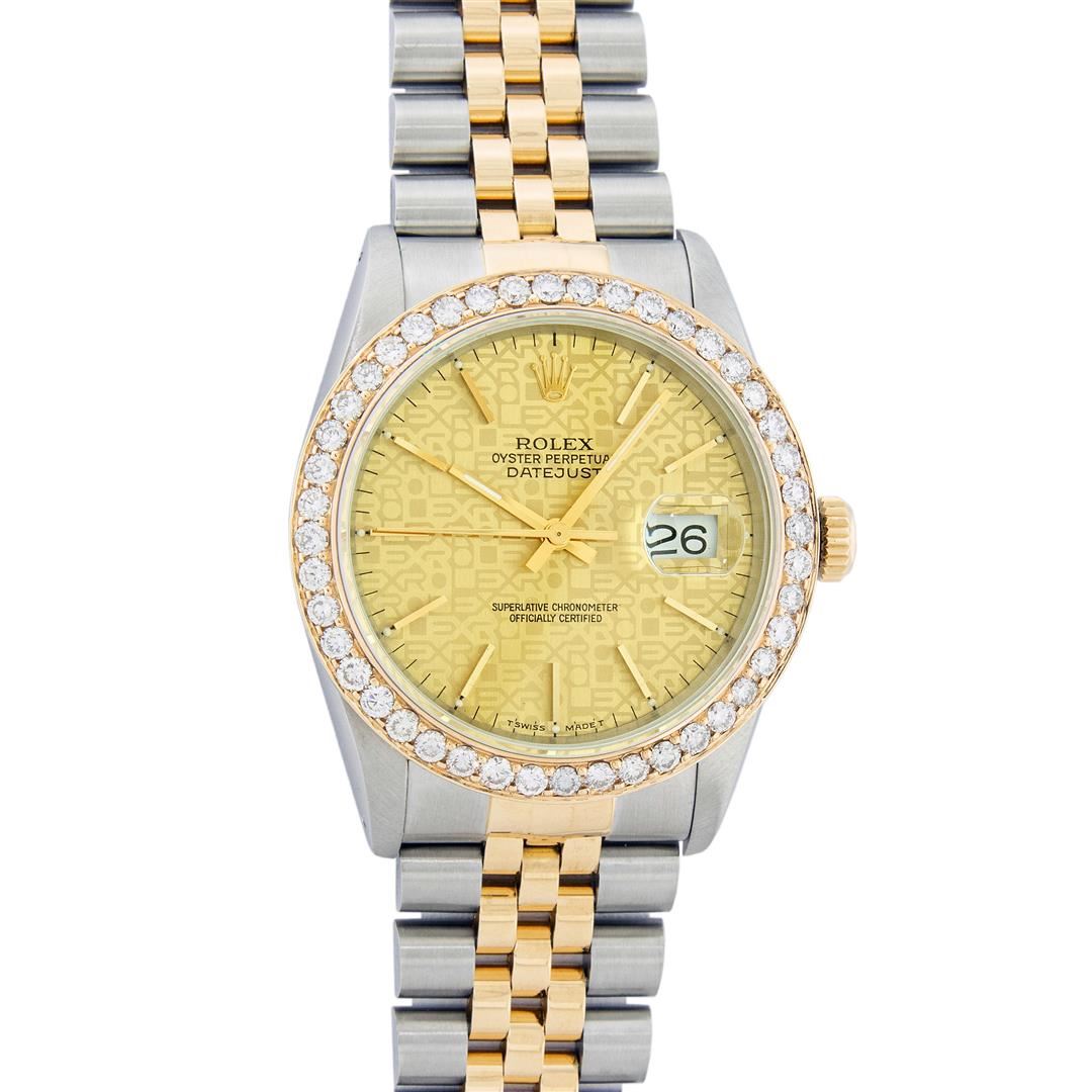 One Men's Pre Owned Yellow Gold Two Tone Rolex Datejust Polished, Serviced & Electronically Tested, Rolex Yellow Gold & Stainless Steel Case: 36mm,Rolex Yellow Gold Crown, Custom Bezel: New 18K Yellow Gold Beadset Diamond Bezel, Diamond Count: 40 Diamonds On Bezel, Total Bezel Weight 2.5 Carat, Clarity: SI-VS, Color: G to H. Custom Crystal: New Scratch Resistant Synthetic Sapphire Cyclops Lens. Custom Hands: New Luminescent Hands. Rolex Movement: Automatic Winding Movement. Rolex Dial: Champagne Jubilee Dial With Index Hour Markers and Small Track With Lumi Dots. Date Window: 3 O'Clock Position Date Display, Quickset, Model: Datejust. Condition: G-6 Extra Fine. Rolex Bracelet: Two Tone Yellow Gold & Stainless Steel Jubilee Band. Bright Polish. 7.0 Inch Length, Adjustable. Standard Clasp, With Rolex Logo. This Watch Has Been Serviced Time Tested And Is In Excellent Condition It Is Free Of All Scratches And Dents.