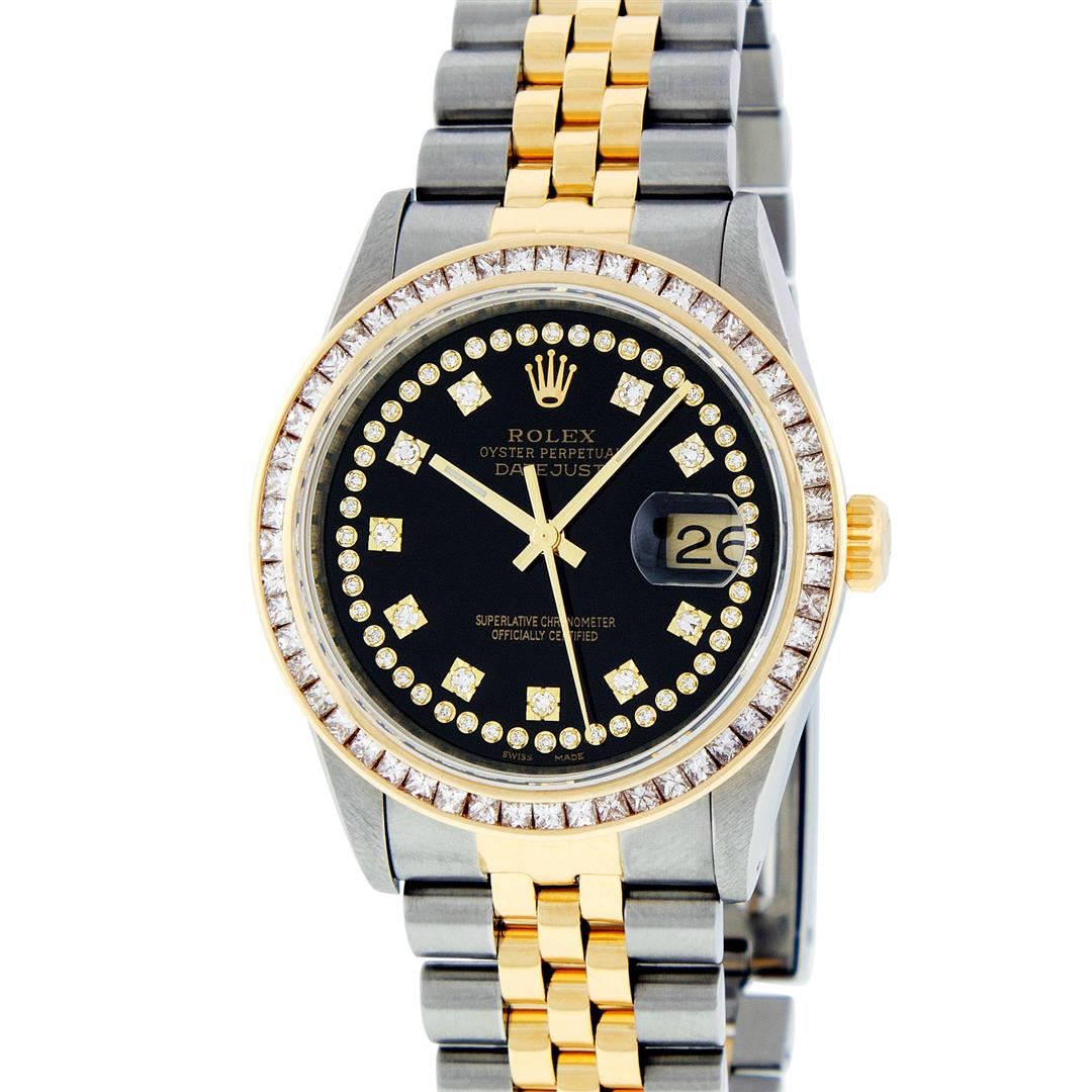 One Men's Yellow Gold & Stainless Steel Two Tone Rolex Datejust Polished Bright with Satin Finish, Serviced & Electronically Tested, Yellow Gold And Stainless Steel Case: 36mm, Yellow Gold Crown, Custom Bezel: New Yellow Gold Princess Cut Diamond Bezel, Diamond Count: 53 Diamonds, Total Weight 2.75 Carat, Clarity: SI-VS, Color: G to H. Custom Crystal: New Scratch Resistant Synthetic Sapphire Cyclops Lens. Custom Hands: New Luminescent Hands. Movement: Automatic Winding Movement. Custom Dial: Black String Diamond Dial, Diamond Count: 58 Diamond in Dial, Dial Color: G To H In Color, Clarity: VS2. Date Window: 3 O'Clock Position Date Display, Quickset, Model: Datejust. Condition: G-6 Extra Fine. Bracelet: Yellow Gold And Stainless Steel Jubilee. Bright Polish & Satin Finish. 7.0 Inch Length, Adjustable. Standard Clasp, With Rolex Logo. This Watch Has Been Serviced and Polished And It Is Free Of All Dents And Scratches And Has Been Time Tested.