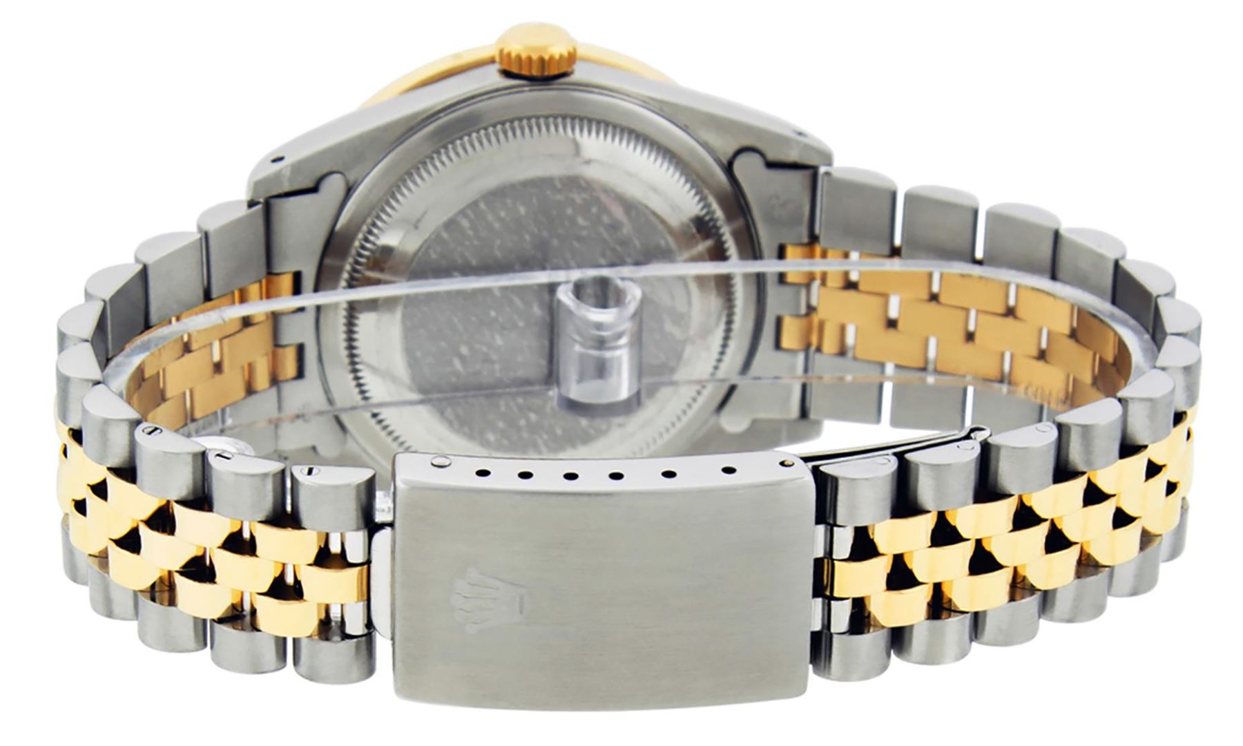 One Men's Yellow Gold & Stainless Steel Two Tone Rolex Datejust Polished Bright with Satin Finish, Serviced & Electronically Tested, Yellow Gold And Stainless Steel Case: 36mm, Yellow Gold Crown, Custom Bezel: New Yellow Gold Princess Cut Diamond Bezel, Diamond Count: 53 Diamonds, Total Weight 2.75 Carat, Clarity: SI-VS, Color: G to H. Custom Crystal: New Scratch Resistant Synthetic Sapphire Cyclops Lens. Custom Hands: New Luminescent Hands. Movement: Automatic Winding Movement. Custom Dial: Black String Diamond Dial, Diamond Count: 58 Diamond in Dial, Dial Color: G To H In Color, Clarity: VS2. Date Window: 3 O'Clock Position Date Display, Quickset, Model: Datejust. Condition: G-6 Extra Fine. Bracelet: Yellow Gold And Stainless Steel Jubilee. Bright Polish & Satin Finish. 7.0 Inch Length, Adjustable. Standard Clasp, With Rolex Logo. This Watch Has Been Serviced and Polished And It Is Free Of All Dents And Scratches And Has Been Time Tested.