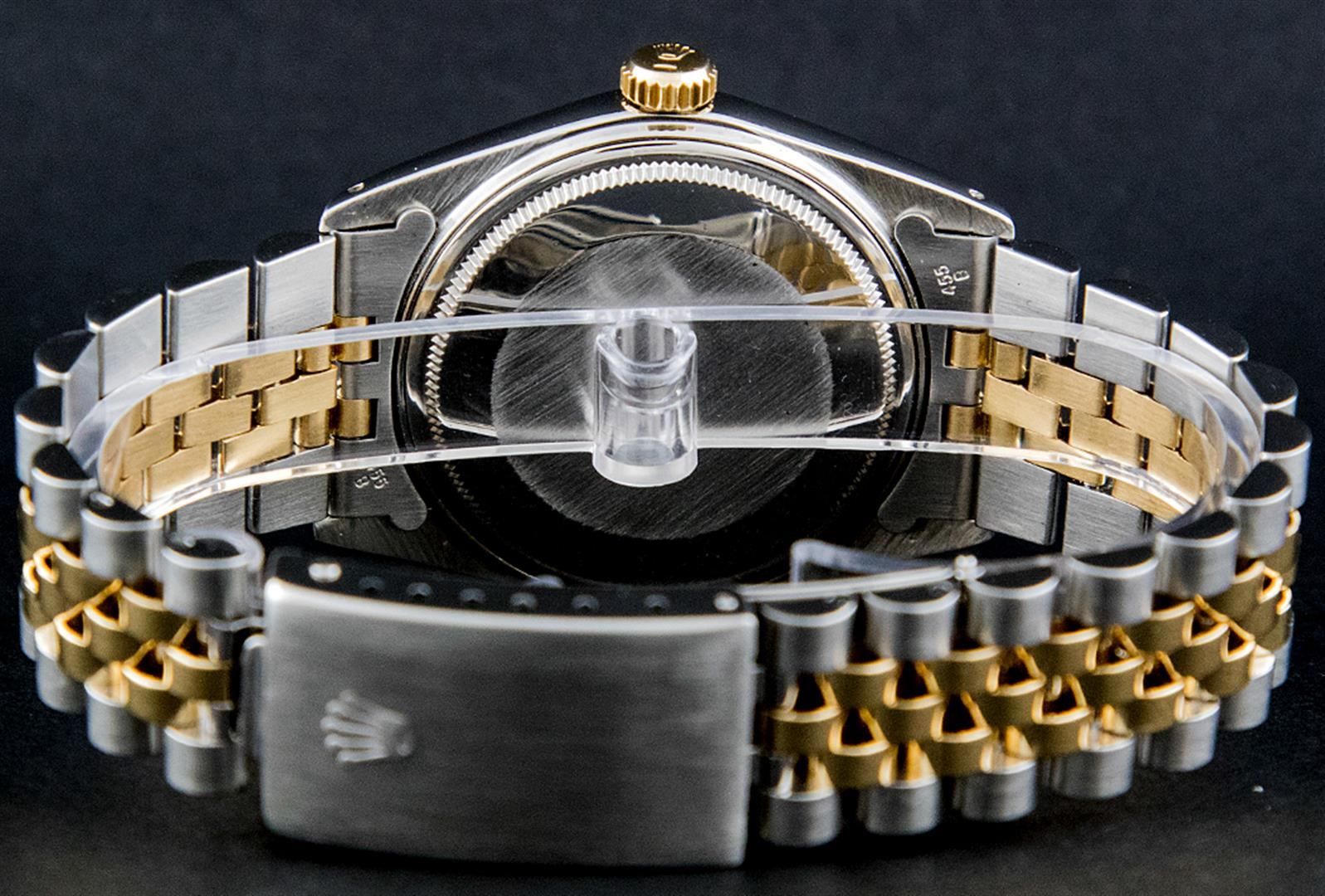 One Men's Pre Owned Yellow Gold Two Tone Rolex Datejust Polished, Serviced & Electronically Tested, Rolex Yellow Gold & Stainless Steel Case: 36mm, Rolex Yellow Gold Crown, Rolex Bezel: Yellow Gold Fluted Bezel. Custom Crystal: New Acrylic Cyclops Lens. Custom Hands: New Luminescent Hands. Rolex Movement: Automatic Winding Movement. Custom Dial: Refinished To Black With Added Diamond Hour Markers, Diamond Count: 10 Diamonds In Dial, Color: G to H, Clarity: SI-VS. Date Window: 3 O'Clock Position Date Display, Quickset, Model: Condition: G-6 Extra Fine. Rolex Bracelet: Two Tone Yellow Gold & Stainless Steel Jubilee Band. Bright Polish. 7.0 Inch Length, Adjustable. Standard Clasp, With Rolex Logo. This Watch Has Been Serviced Time Tested And Is In Excellent Condition It Is Free Of All Scratches And Dents.