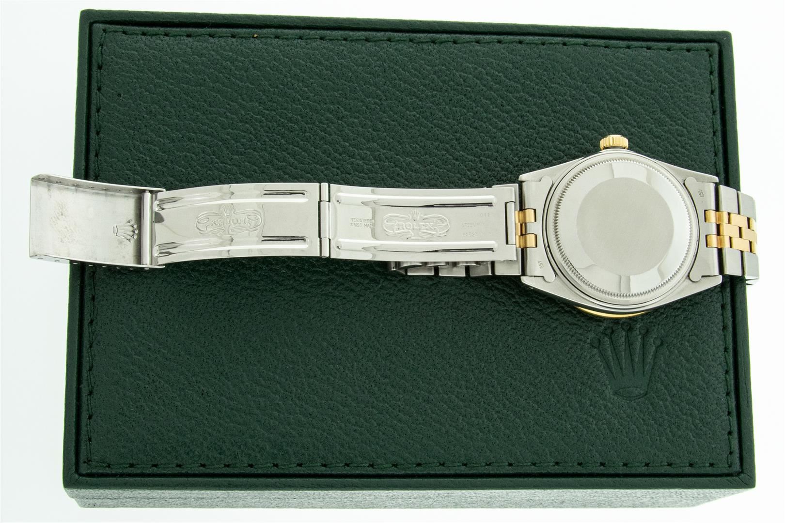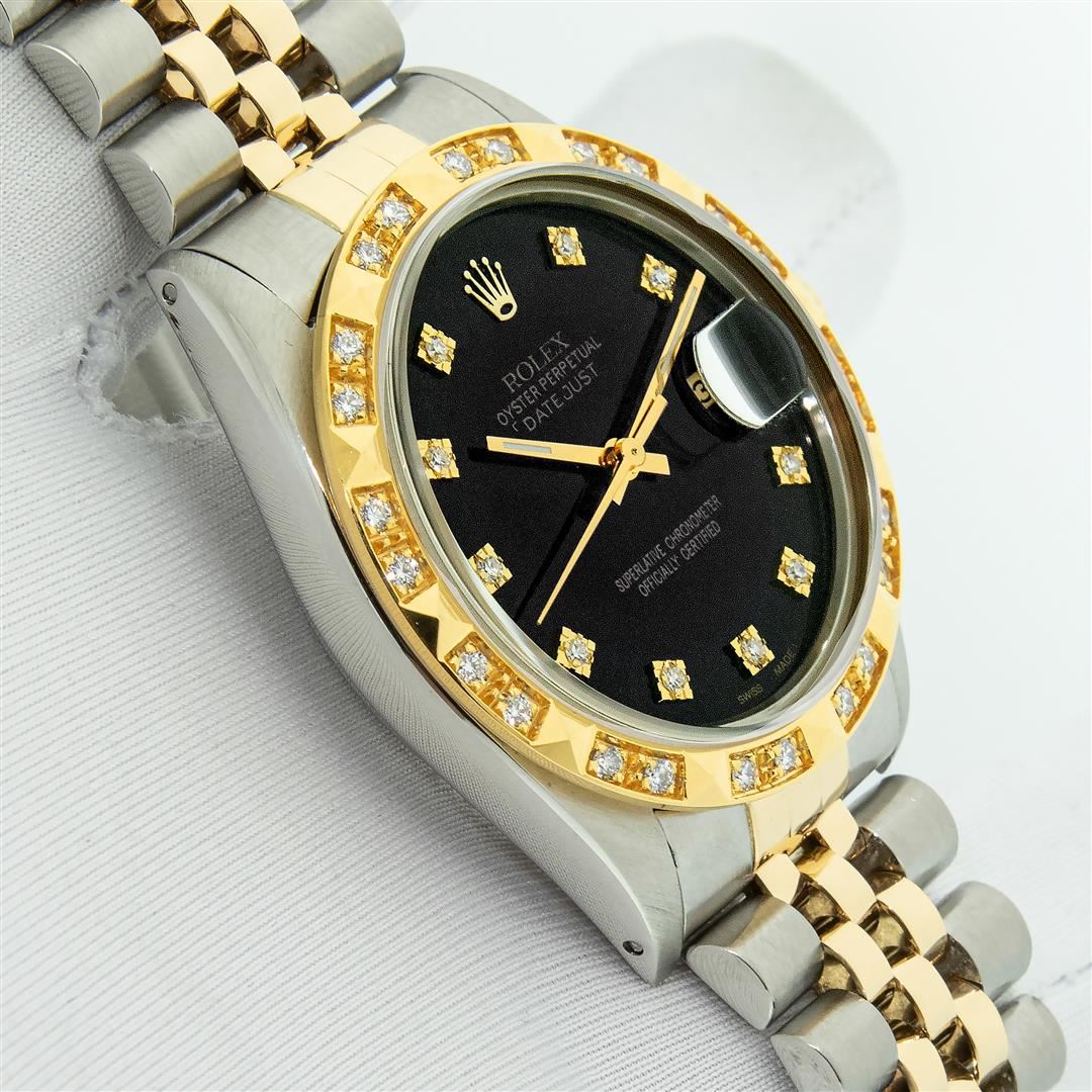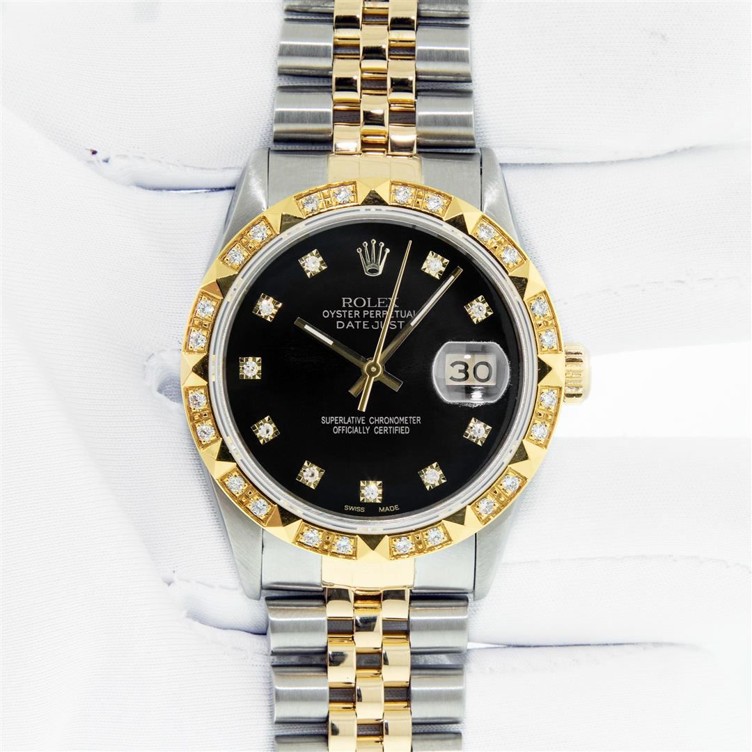 One Men's Yellow Gold Rolex Datejust Polished Bright with Satin Finish, Serviced & Electronically Tested, Stainless Steel Case: 36mm, Rolex Yellow Gold Crown, Custom Bezel: New 18K Yellow Gold Pyramid Diamond Bezel, Diamond Count: 24 Diamonds, Total Weight .75 Carat, Clarity: SI-VS, Color: G to H. Custom Crystal: New Sapphire With Magnified Date Window. Custom Hands: New Luminescent Hands. Rolex Movement: Automatic Winding Movement. Custom Dial: Refinished To Black With Diamond Dial, Diamond Count: 10 Diamonds In Dial, Color: G to H, Clarity: VS. Date Window: 3 O'clock Position Date Display, Quickset, Model: Datejust. Condition: G-6 Extra Fine. Rolex Bracelet: Yellow Gold And Stainless Steel Jubilee Band. Bright Polish & Satin Finish. 7.0 Inch Length, Adjustable. Standard Clasp, With Rolex Logo. This Pre Owned Watch Has Been Serviced And Polished It Is Free Of All Scratches And Dents. This Watch Comes With A Rolex Box