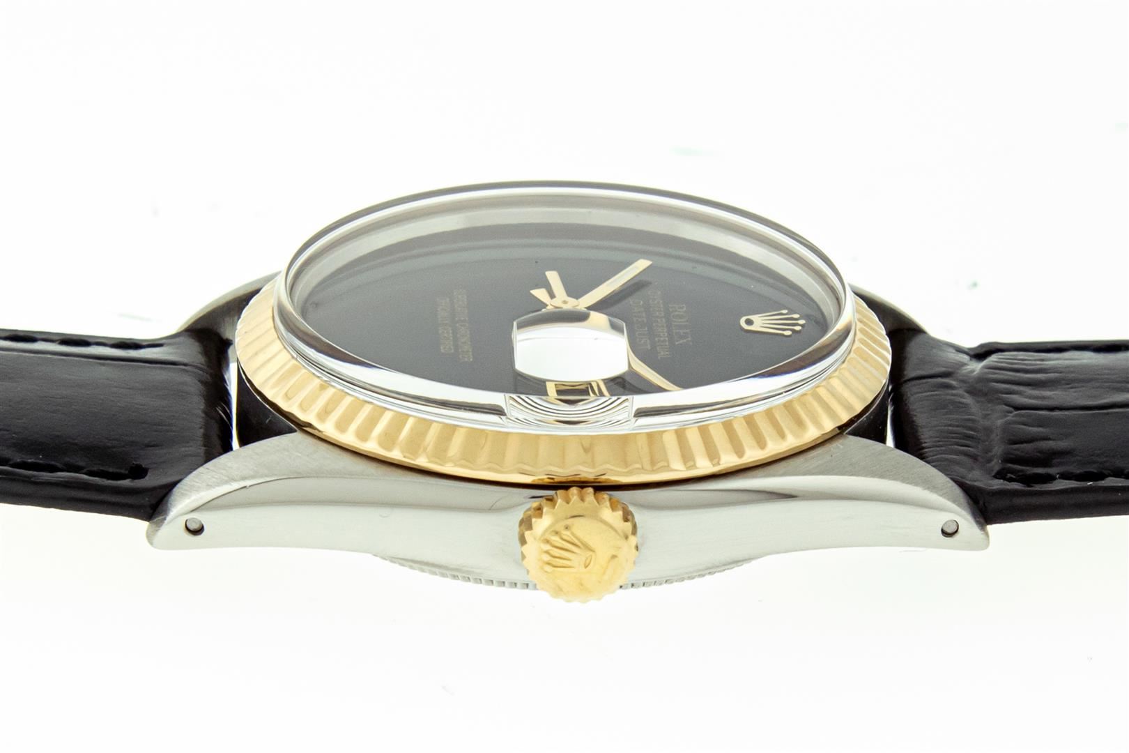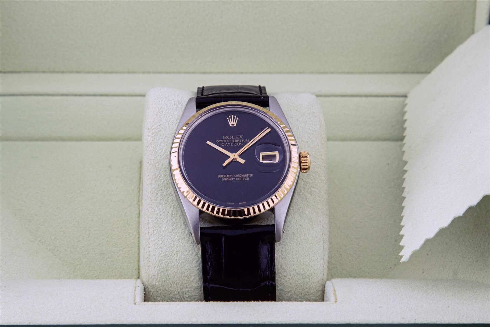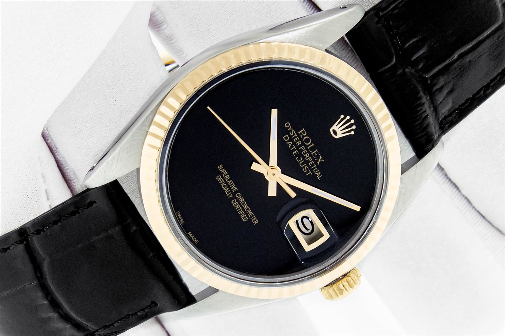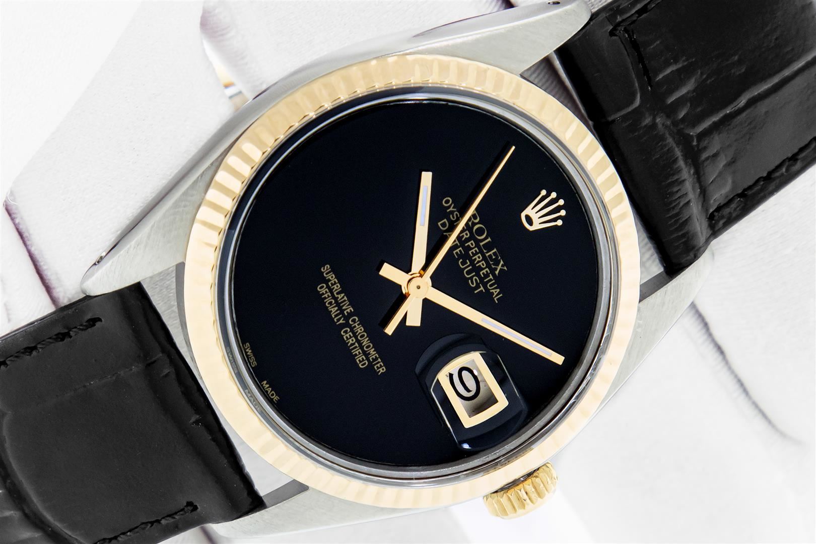One Mens Yellow Gold Two Tone Rolex Datejust Polished, Serviced & Electronically Tested, Yellow Gold & Stainless Steel Case: 36mm, Yellow Gold Crown, Original Bezel: Yellow Gold Fluted Bezel. Custom Crystal: New Plastic With Date Window. Custom Hands: New Luminecent Hands. Rolex Movement: Automatic Winding Movement. Custom Dial: Black Onyx Dial. Date Window: 3 O'Clock Position Date Display, Quickset, Model: Datejust. Condition: G-6 Extra Fine. Custom Band: New Black Leather Band. 7.0 Inch Length. New Custom Pink Buckle Clasp. This Watch Has Been Serviced Time Tested And Is In Excellent Condition It Is Free Of All Scratches And Dents. This Watch Comes With A Rolex Box And Booklets.