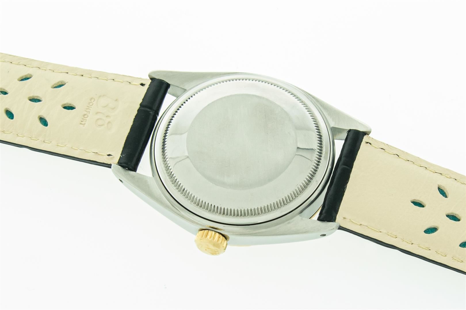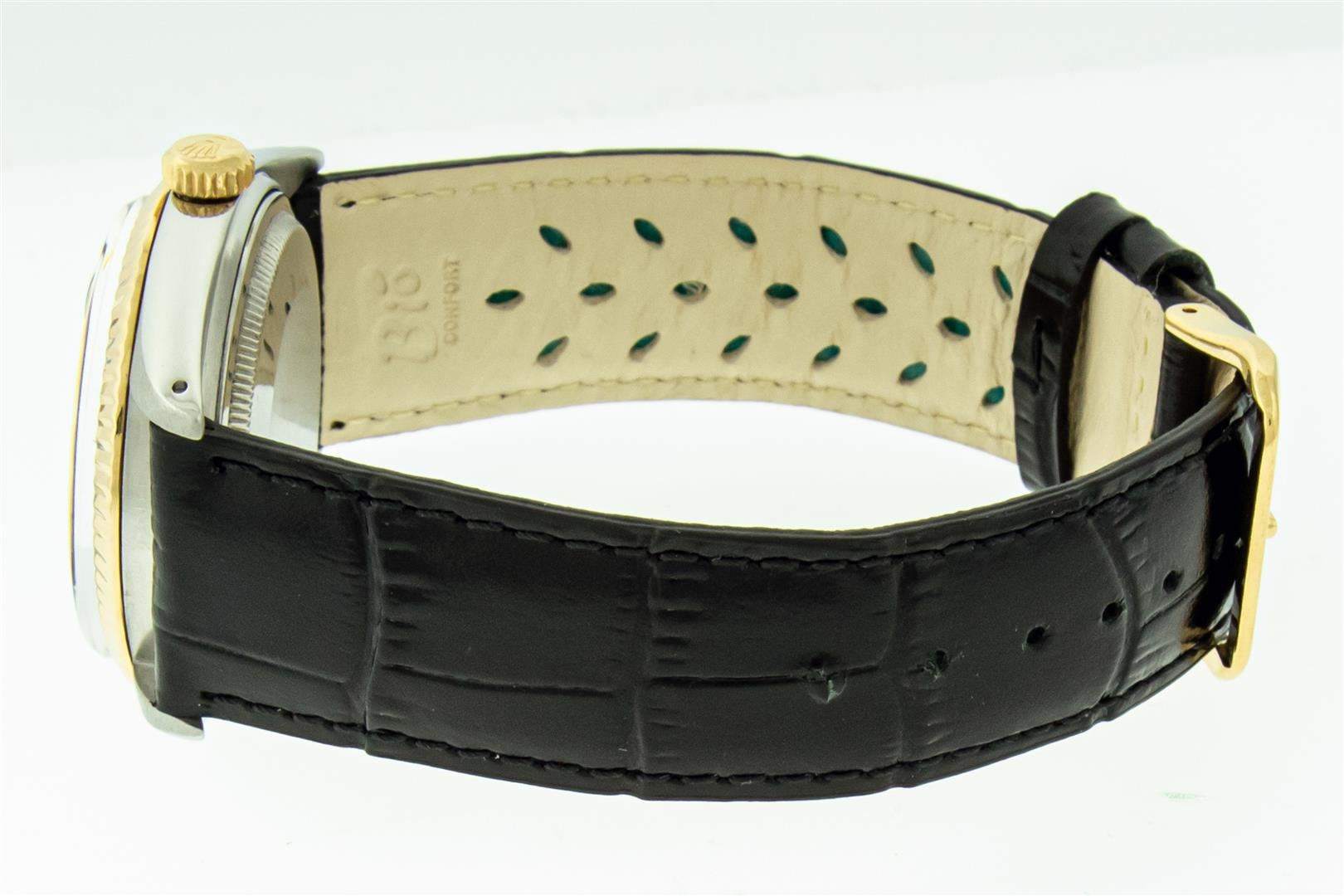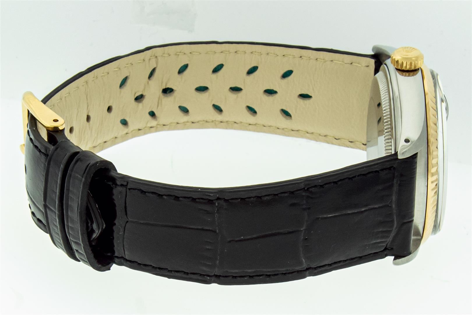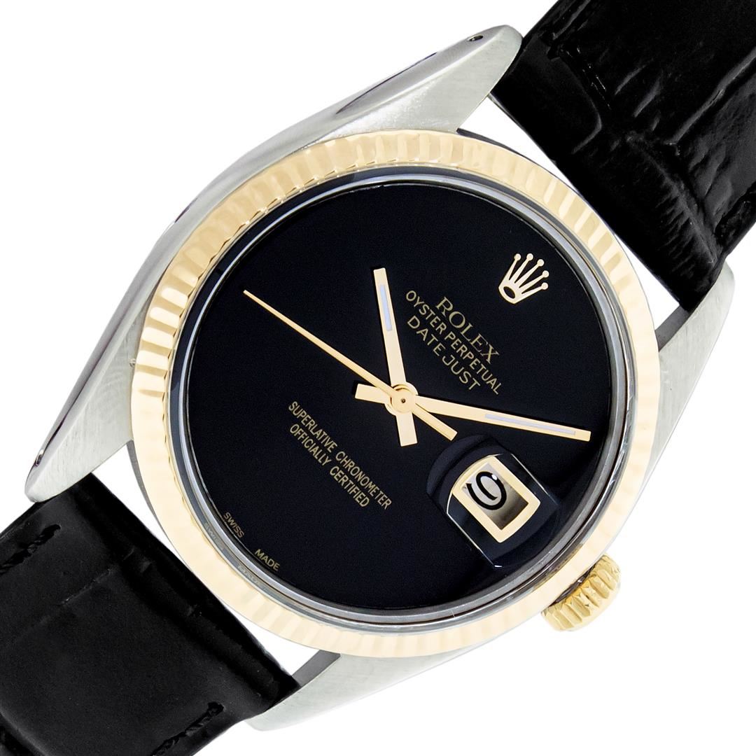 One Mens Yellow Gold Two Tone Rolex Datejust Polished, Serviced & Electronically Tested, Yellow Gold & Stainless Steel Case: 36mm, Yellow Gold Crown, Original Bezel: Yellow Gold Fluted Bezel. Custom Crystal: New Plastic With Date Window. Custom Hands: New Luminecent Hands. Rolex Movement: Automatic Winding Movement. Custom Dial: Black Onyx Dial. Date Window: 3 O'Clock Position Date Display, Quickset, Model: Datejust. Condition: G-6 Extra Fine. Custom Band: New Black Leather Band. 7.0 Inch Length. New Custom Pink Buckle Clasp. This Watch Has Been Serviced Time Tested And Is In Excellent Condition It Is Free Of All Scratches And Dents. This Watch Comes With A Rolex Box And Booklets.