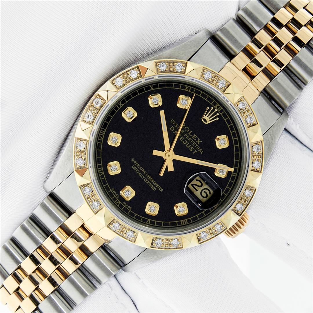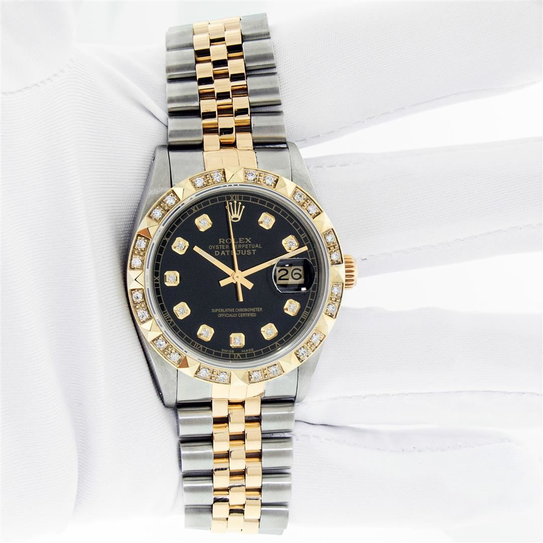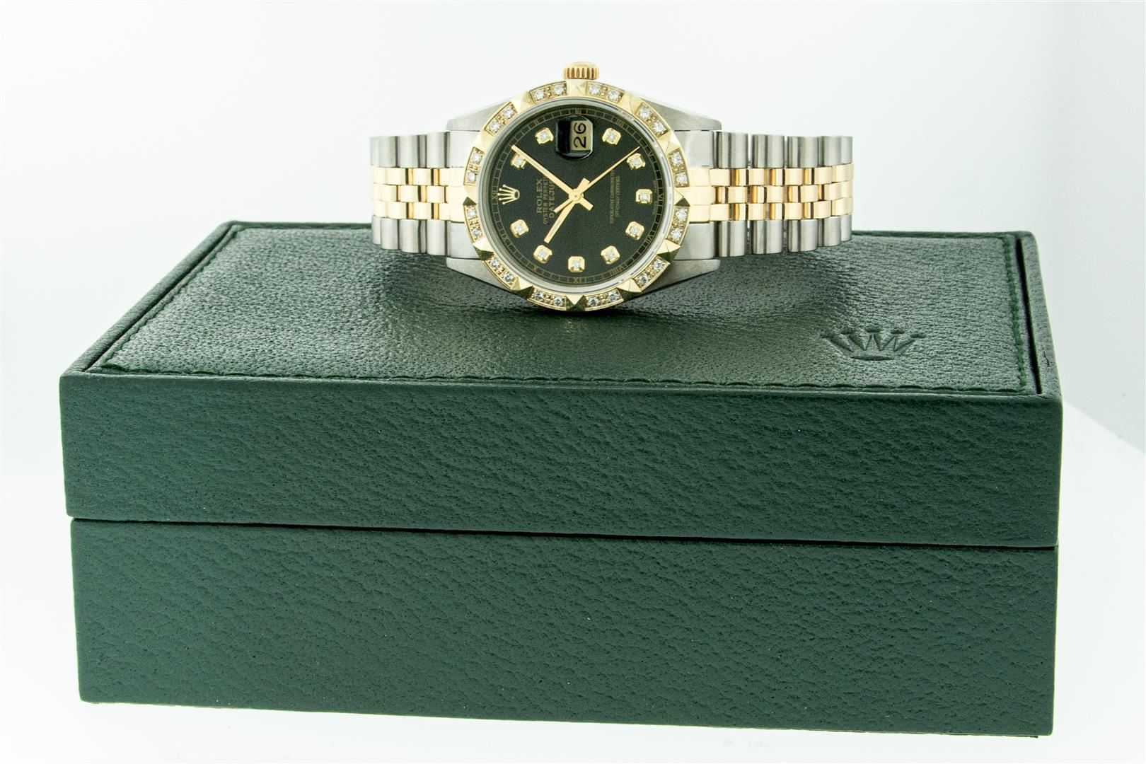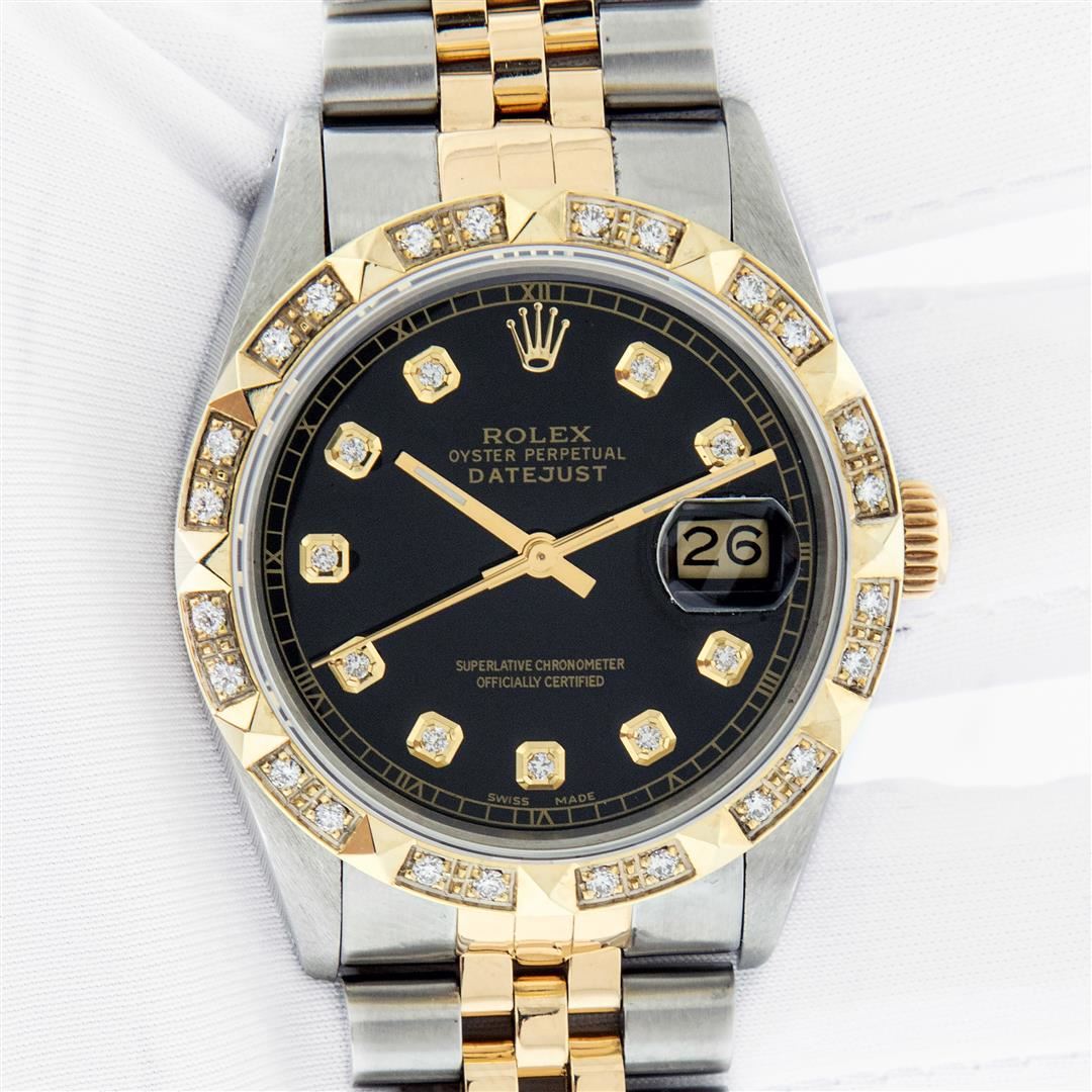 One Men's Yellow Gold Rolex Datejust Polished Bright with Satin Finish, Serviced & Electronically Tested, Stainless Steel Case: 36mm, Rolex Yellow Gold Crown, Custom Bezel: New 18K Yellow Gold Pyramid Diamond Bezel, Diamond Count: 24 Diamonds, Total Weight .75 Carat, Clarity: SI-VS, Color: G to H. Custom Crystal: New Sapphire With Magnified Date Window. Custom Hands: New Luminescent Hands. Rolex Movement: Automatic Winding Movement. Custom Dial: Refinished To Black Diamond With Added Diamond Hour Markers, Diamond Count: 10 Diamonds In Dial, Color: G to H, Clarity: VS. Date Window: 3 O'clock Position Date Display, Quickset, Model: Datejust. Condition: G-6 Extra Fine. Rolex Bracelet: Yellow Gold And Stainless Steel Jubilee Band. Bright Polish & Satin Finish. 7.0 Inch Length, Adjustable. Standard Clasp, With Rolex Logo. This Pre Owned Watch Has Been Serviced And Polished It Is Free Of All Scratches And Dents. This Watch Comes With A Rolex Box.
