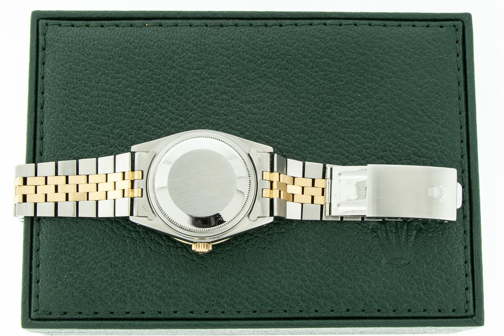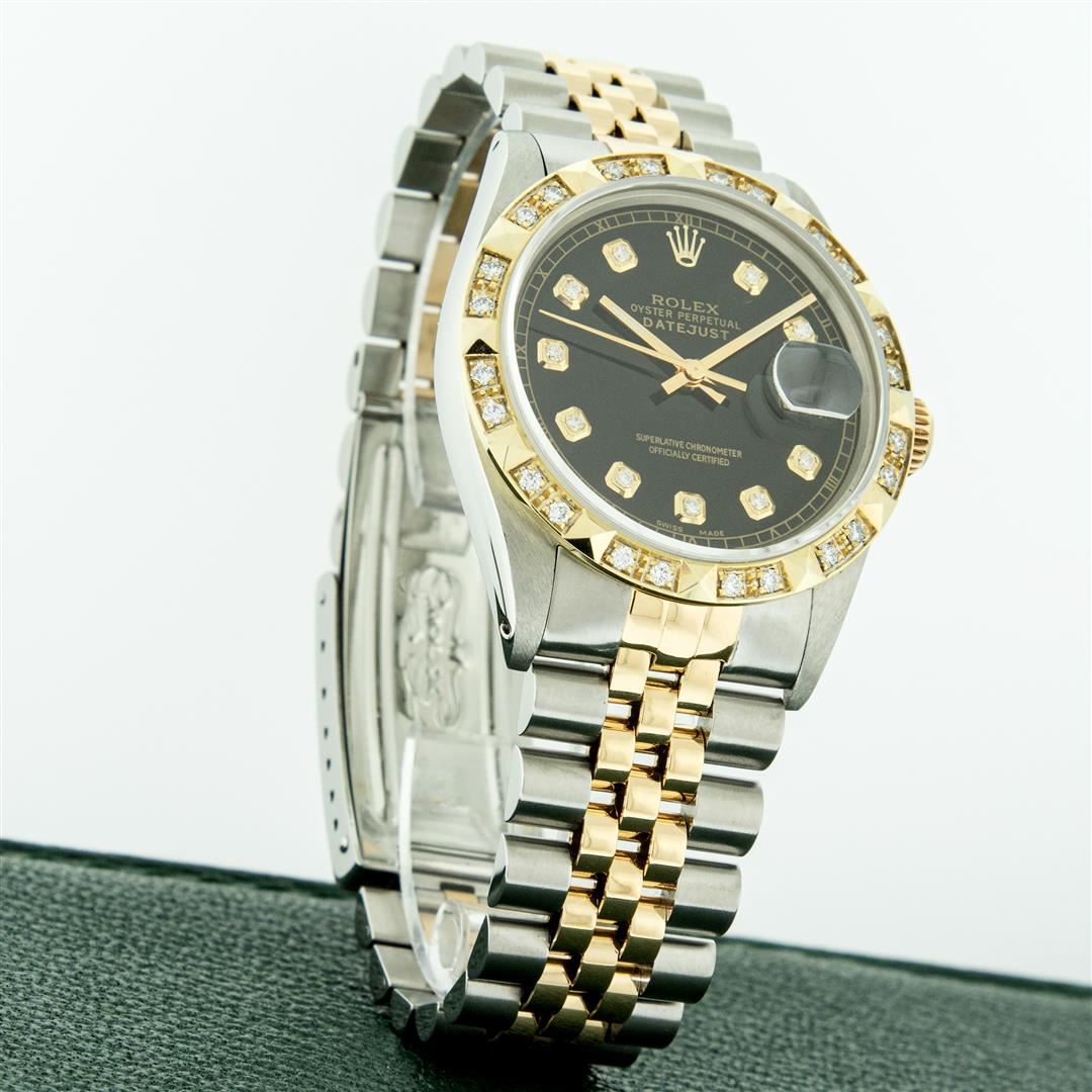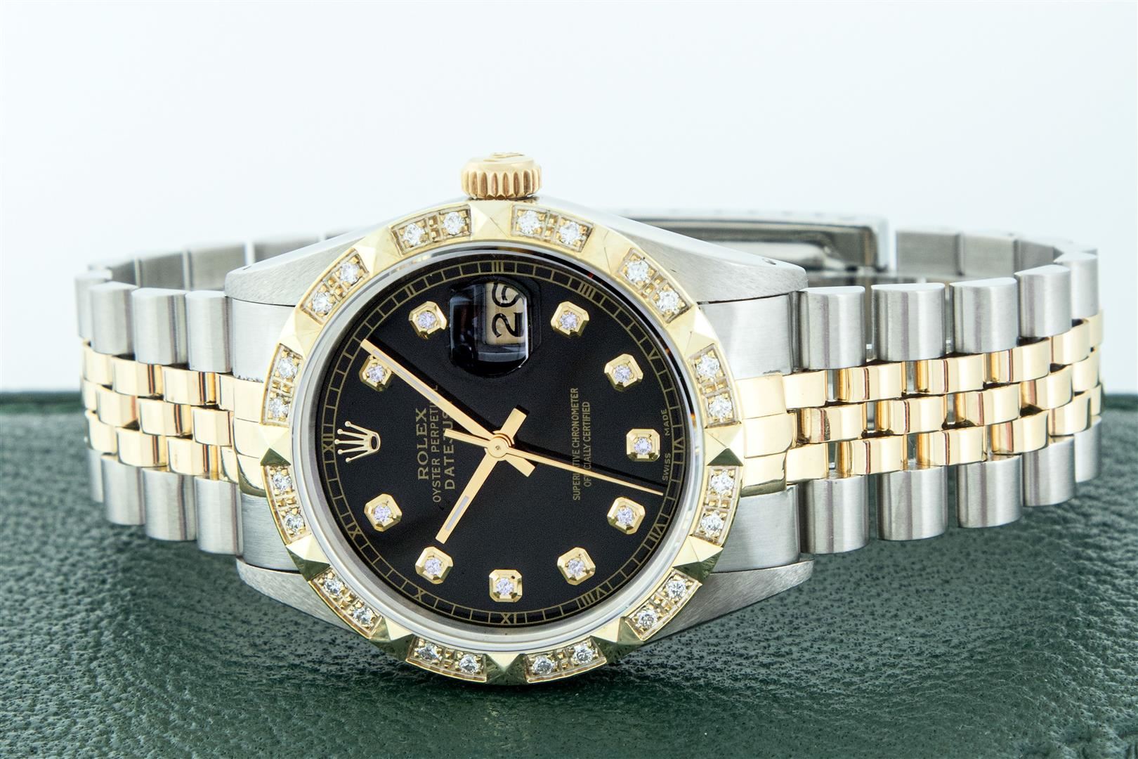 One Men's Yellow Gold Rolex Datejust Polished Bright with Satin Finish, Serviced & Electronically Tested, Stainless Steel Case: 36mm, Rolex Yellow Gold Crown, Custom Bezel: New 18K Yellow Gold Pyramid Diamond Bezel, Diamond Count: 24 Diamonds, Total Weight .75 Carat, Clarity: SI-VS, Color: G to H. Custom Crystal: New Sapphire With Magnified Date Window. Custom Hands: New Luminescent Hands. Rolex Movement: Automatic Winding Movement. Custom Dial: Refinished To Black Diamond With Added Diamond Hour Markers, Diamond Count: 10 Diamonds In Dial, Color: G to H, Clarity: VS. Date Window: 3 O'clock Position Date Display, Quickset, Model: Datejust. Condition: G-6 Extra Fine. Rolex Bracelet: Yellow Gold And Stainless Steel Jubilee Band. Bright Polish & Satin Finish. 7.0 Inch Length, Adjustable. Standard Clasp, With Rolex Logo. This Pre Owned Watch Has Been Serviced And Polished It Is Free Of All Scratches And Dents. This Watch Comes With A Rolex Box.