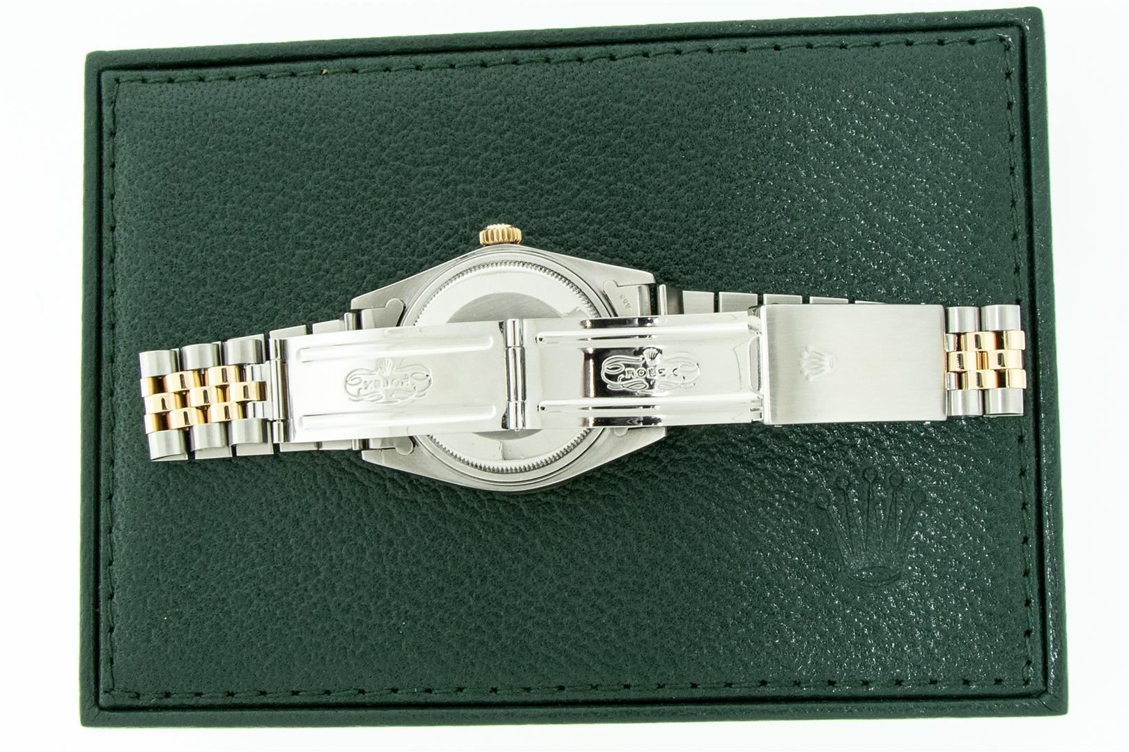 One Men's Yellow Gold Rolex Datejust Polished Bright with Satin Finish, Serviced & Electronically Tested, Stainless Steel Case: 36mm, Rolex Yellow Gold Crown, Custom Bezel: New 18K Yellow Gold Pyramid Diamond Bezel, Diamond Count: 24 Diamonds, Total Weight .75 Carat, Clarity: SI-VS, Color: G to H. Custom Crystal: New Sapphire With Magnified Date Window. Custom Hands: New Luminescent Hands. Rolex Movement: Automatic Winding Movement. Custom Dial: Refinished To Black Diamond With Added Diamond Hour Markers, Diamond Count: 10 Diamonds In Dial, Color: G to H, Clarity: VS. Date Window: 3 O'clock Position Date Display, Quickset, Model: Datejust. Condition: G-6 Extra Fine. Rolex Bracelet: Yellow Gold And Stainless Steel Jubilee Band. Bright Polish & Satin Finish. 7.0 Inch Length, Adjustable. Standard Clasp, With Rolex Logo. This Pre Owned Watch Has Been Serviced And Polished It Is Free Of All Scratches And Dents. This Watch Comes With A Rolex Box.