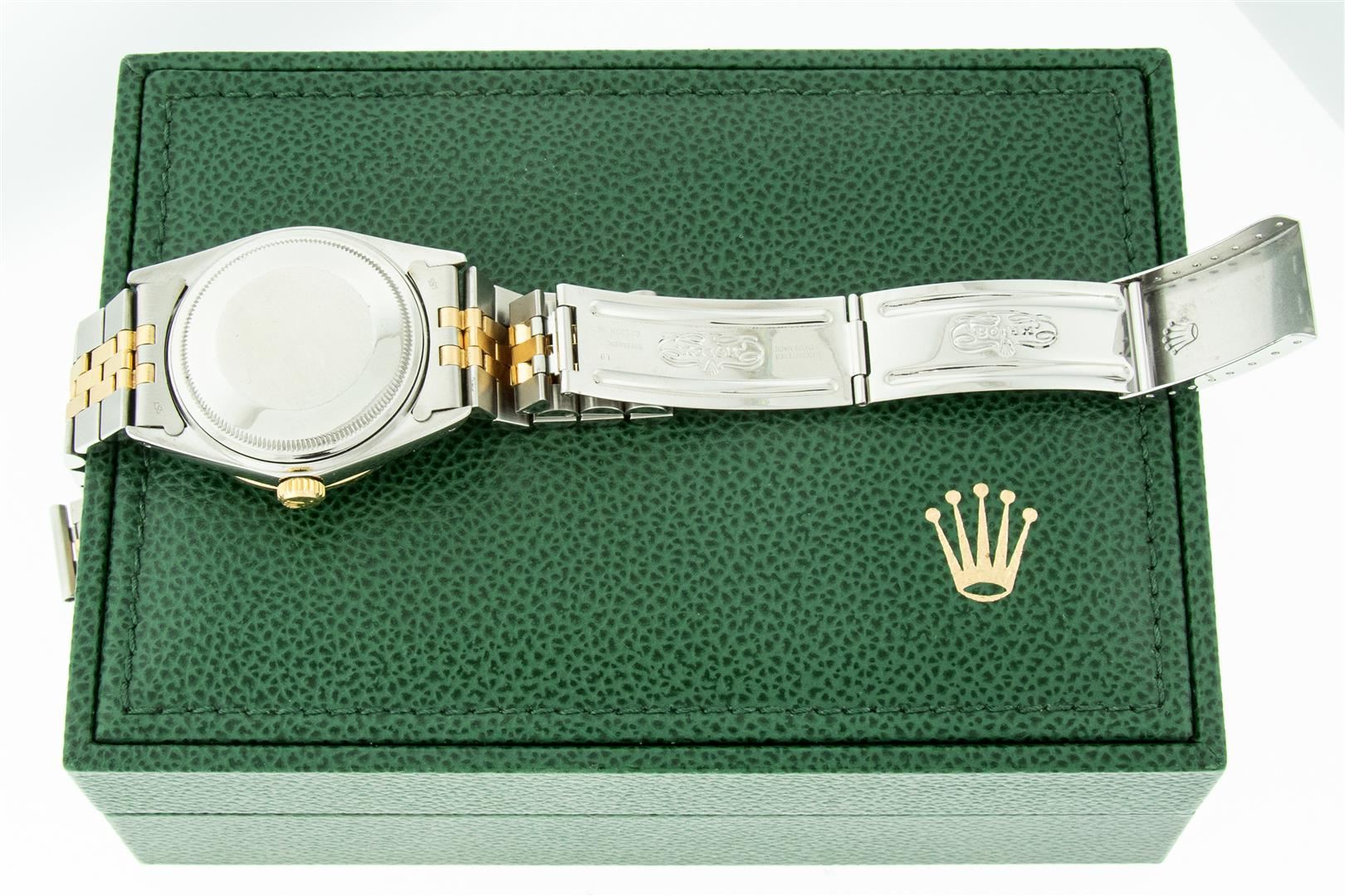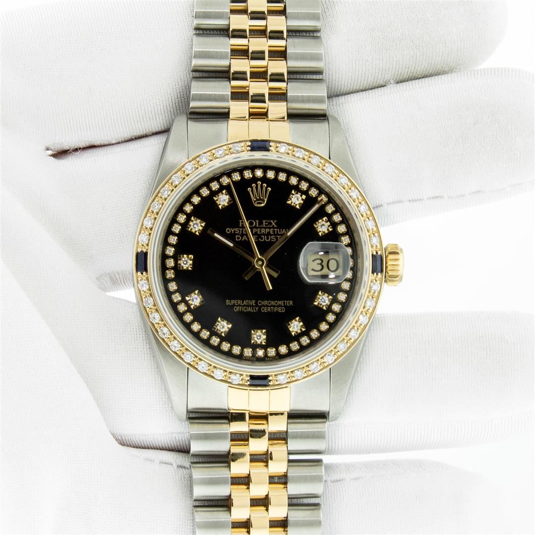One Men's Yellow Gold Two Tone Rolex Datejust Polished, Serviced & Electronically Tested, Yellow Gold & Stainless Steel Case: 36mm, Rolex Yellow Gold Crown, Custom Bezel: New 18K Yellow Gold Sapphire Beadset Diamond Bezel, Diamond Count: 36 Diamonds + 4 Sapphires, Total Weight 1.0 Carat, Clarity: SI-VS, Color: G to H. Custom Crystal: New Sapphire With Magnified Date Window. Custom Hands: New Luminescent Hands. Rolex Movement: Automatic Winding Movement. Custom Dial: Refinished To Black With Added Diamonds, Diamond Count: 58 Diamonds In Dial, Color: G to H, Clarity: SI-VS Date Window: 3 O'clock Position Date Display, Quickset, Model: Datejust, Condition: G-6 Extra Fine. Rolex Bracelet: Two Tone Yellow Gold & Stainless Steel Jubilee Band. Bright Polish. 7.0 Inch Length, Adjustable. Standard Clasp, With Rolex Logo. This Pre Owned Watch Has Been Serviced Time Tested And Is In Excellent Condition It Is Free Of All Scratches And Dents. This Watch Comes With A Rolex Box.