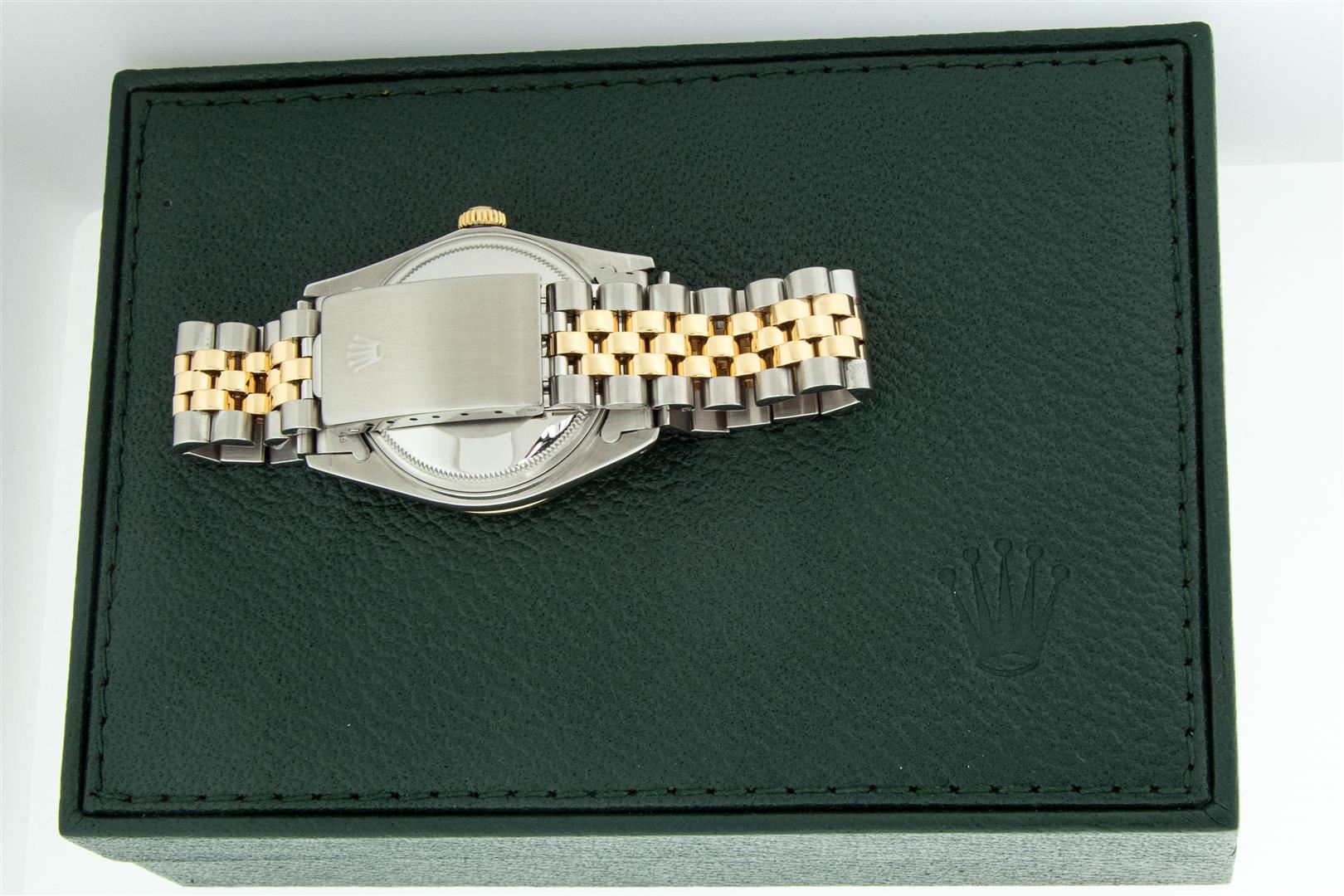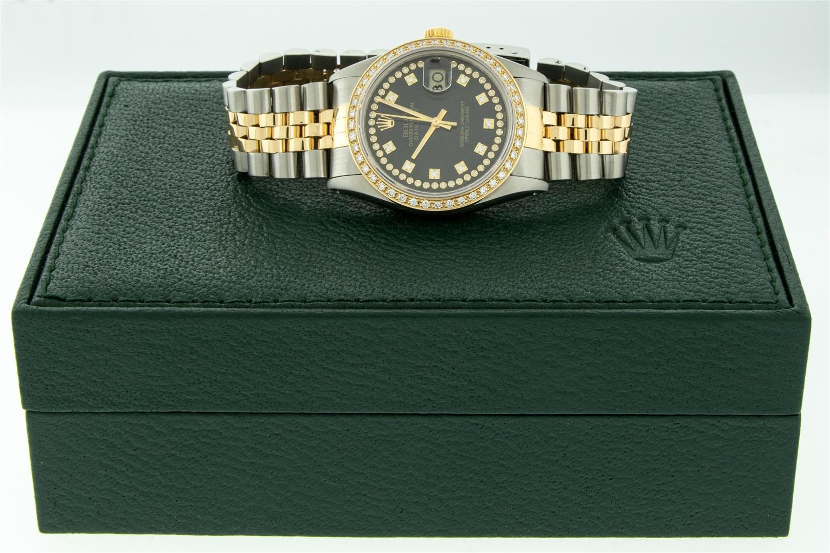 One Men's Yellow Gold Two Tone Rolex Datejust Polished, Serviced & Electronically Tested, Yellow Gold & Stainless Steel Case: 36mm, Rolex Yellow Gold Crown, Custom Bezel: New 18K Yellow Gold Beadset Diamond Bezel, Diamond Count: 44 Diamonds, Total Weight 1.00 Carat, Clarity: SI-VS, Color: G to H. Custom Crystal: New Sapphire With Magnified Date Window. Custom Hands: New Luminescent Hands. Rolex Movement: Automatic Winding Movement. Custom Dial: Refinished To Black With Added Diamonds, Diamond Count: 58 Diamonds in Dial G To H In Color, VS In Clarity. Date Window: 3 O'clock Position Date Display, Quickset, Model: Datejust. Condition: G-6 Extra Fine. Rolex Bracelet: Two Tone Yellow Gold & Stainless Steel Jubilee Band. Bright Polish. 7.0 Inch Length, Adjustable. Standard Clasp, With Rolex Logo. This Pre Owned Watch Has Been Serviced Time Tested And Is In Excellent Condition It Is Free Of All Scratches And Dents. This Watch Comes With A Rolex Box.