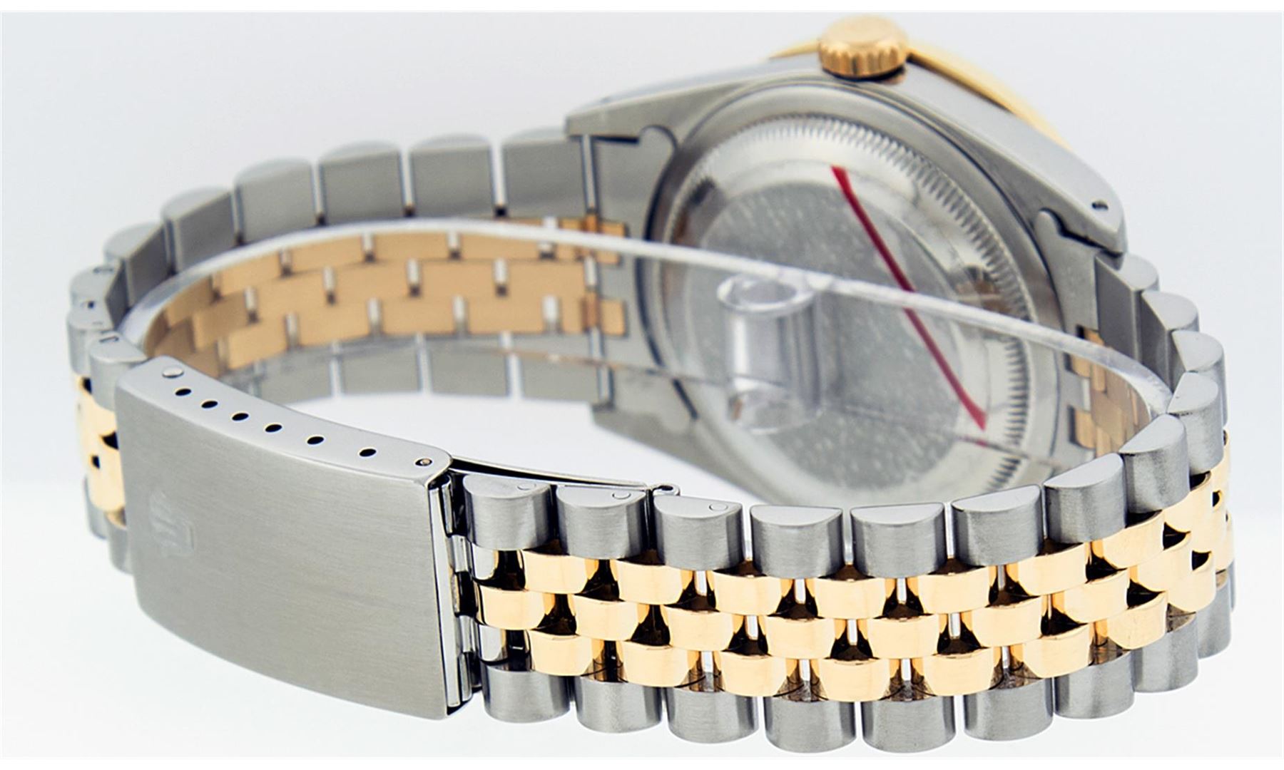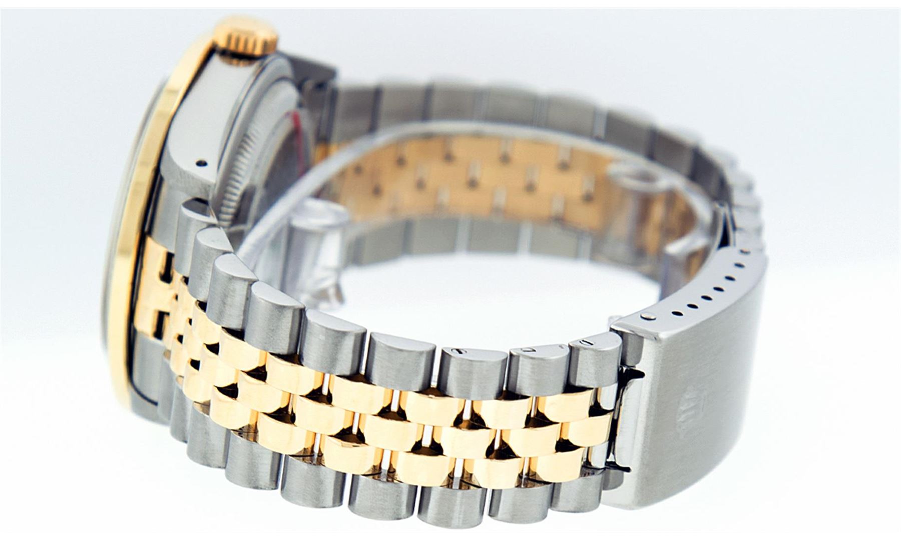 One Men's Two Tone Rolex Datejust Polished, Serviced & Electronically Tested, 14K Yellow Gold & Stainless Steel Case:36mm, 14K Yellow Gold Crown, Custom Bezel: 18K Yellow Gold Ruby Channel Set Diamond Bezel, Diamond Count: 52 Diamonds + 4 Ruby, Total Weight 1.30 Carat, Clarity: SI-VS, Color: G to H. Custom Crystal: Synthetic Sapphire Cyclops Lens. Movement: Automatic Winding Movement Caliber 3035. Custom Dial: Black String Diamond Dial VVS , Diamond Count: 58 Diamonds in Dial G To H In Color, VVS Clarity. Date Window: 3 O'clock Position Date Display, Quickset, Model: 16013 Condition: G-6 Extra Fine. Bracelet: Two Tone 14K Yellow Gold & Stainless Steel Jubilee. Bright Polish. 7.0 Inch Length, Adjustable. Standard Clasp, With Rolex Logo.