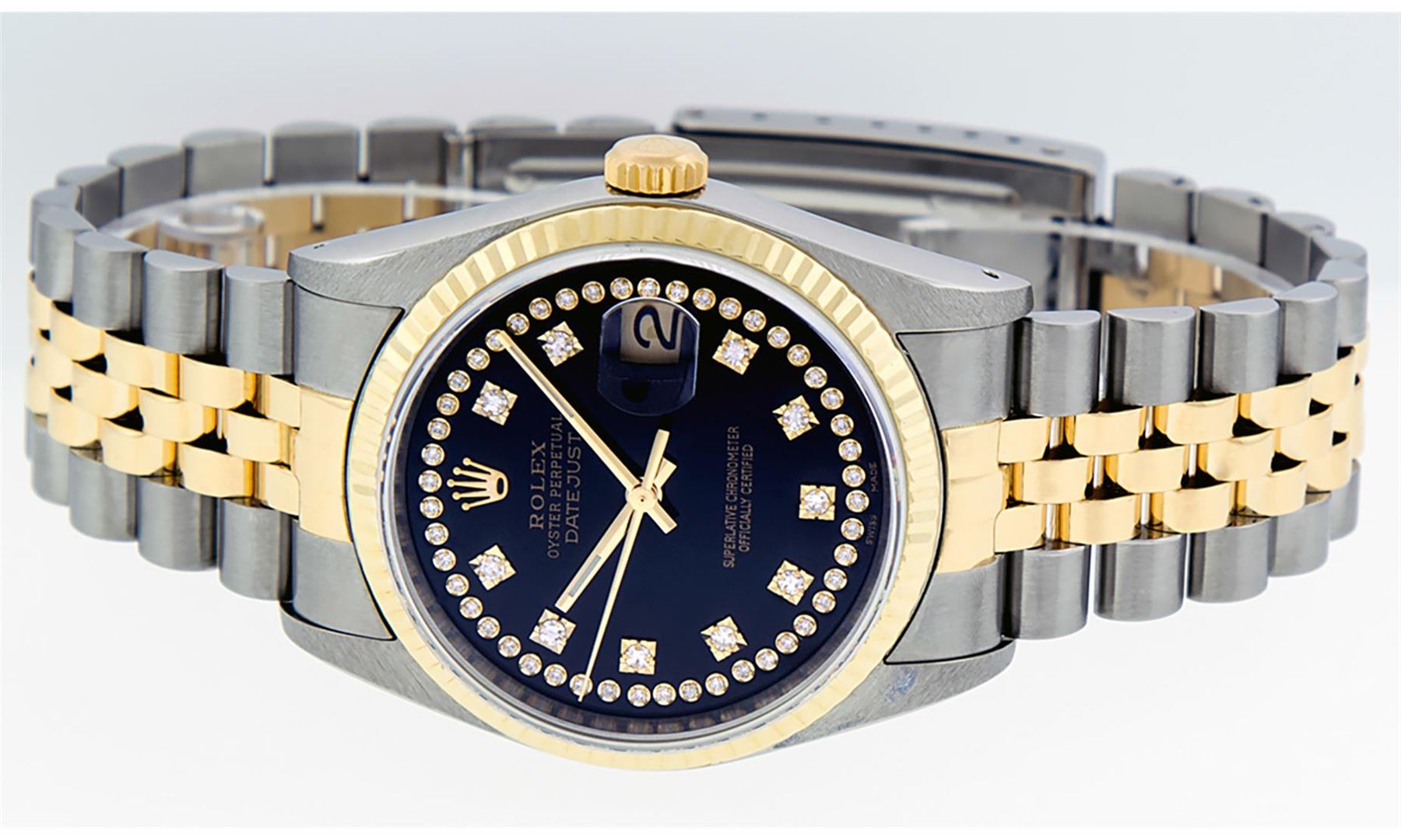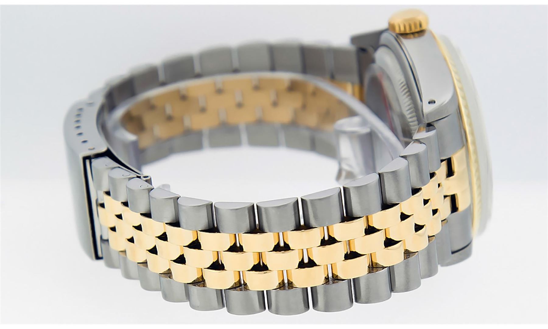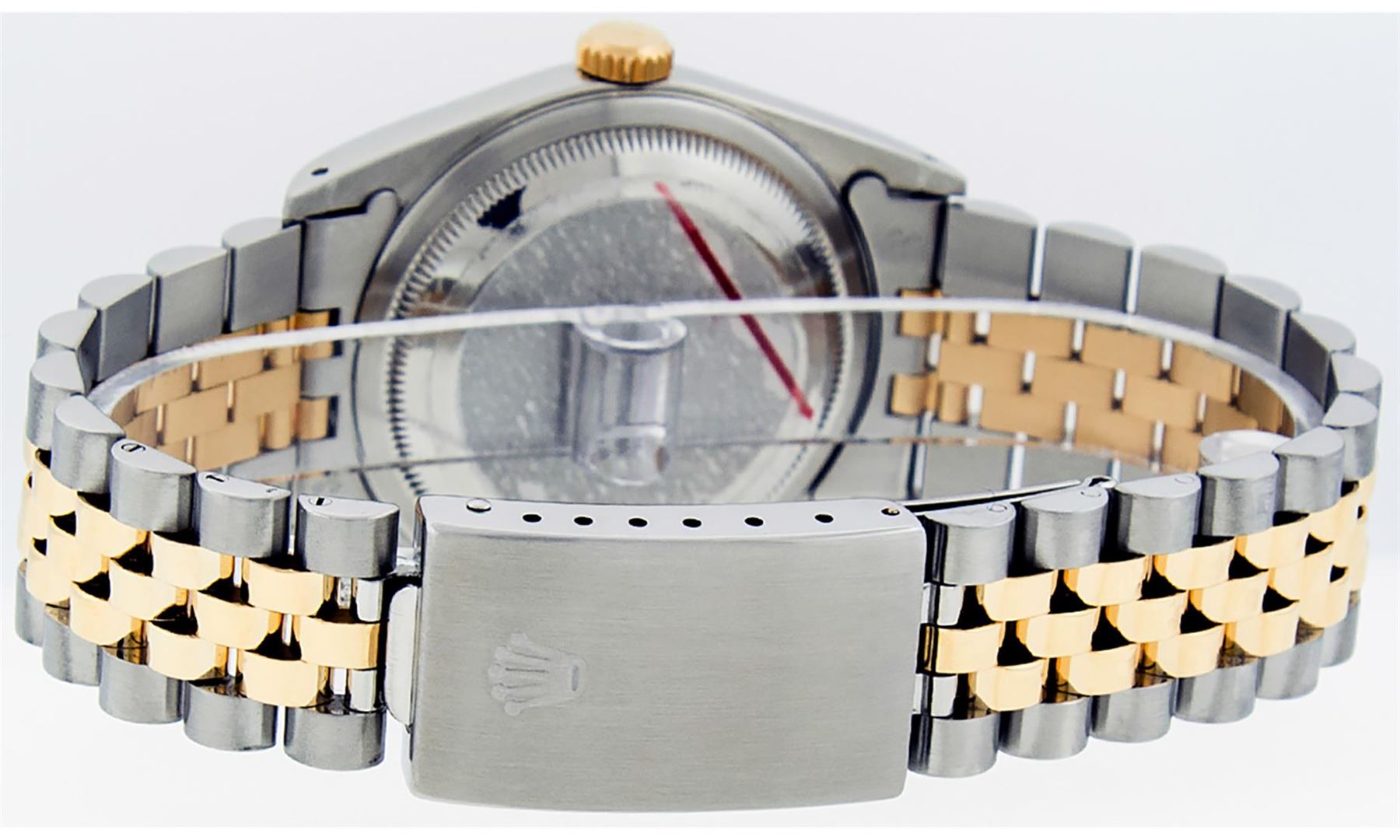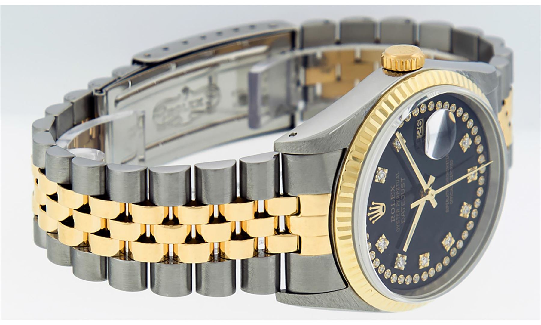 One Men's Pre Owned Yellow Gold Two Tone Rolex Datejust Polished, Serviced & Electronically Tested, Rolex Yellow Gold & Stainless Steel Case: 36mm, Rolex Yellow Gold Crown, Rolex Bezel: Yellow Gold Fluted Bezel. Custom Crystal: New Acrylic Cyclops Lens. Custom Hands: New Luminescent Hands. Rolex Movement: Automatic Winding Movement. Custom Dial: Refinished To Black With Single Cut String Dial Set With VS Diamond Hour Markers, Diamond Count: 58 Diamonds in Dial, G To H In Color, SI-VS Clarity. Date Window: 3 O'Clock Position Date Display, Quickset, Model: Datejust, Condition: G-6 Extra Fine. Rolex Bracelet: Two Tone Yellow Gold & Stainless Steel Jubilee Band. Bright Polish. 7.0 Inch Length, Adjustable. Standard Clasp, With Rolex Logo. This Watch Has Been Serviced And Polished It Is Free Of All Scratches And Dents.