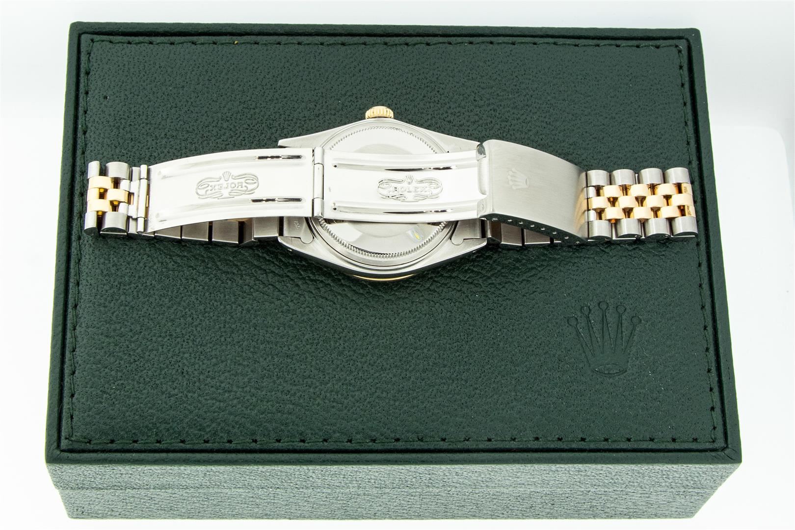 One Men's Yellow Gold Two Tone Rolex Datejust Polished, Serviced & Electronically Tested, Yellow Gold & Stainless Steel Case: 36mm, Rolex Yellow Gold Crown, Custom Bezel: New 18K Yellow Gold Beadset Diamond Bezel, Diamond Count: 44 Diamonds, Total Weight 1.00 Carat, Clarity: SI-VS, Color: G to H. Custom Crystal: New Sapphire With Magnified Date Window. Rolex Movement: Automatic Winding Movement. Custom Dial: Refinished To Blue With Added Diamond Hour Markers, Diamond Count: 8 Diamonds + 28 Diamonds On 6 & 9 Hour Markers, Color: G To H In Color, Clarity: SI-VS, Date Window: 3 O'clock Position Date Display, Quickset, Model: Datejust. Condition: G-6 Extra Fine. Rolex Bracelet: Two Tone Yellow Gold & Stainless Steel Jubilee Band. Bright Polish. 7.0 Inch Length, Adjustable. Standard Clasp, With Rolex Logo. This Pre Owned Watch Has Been Serviced Time Tested And Is In Excellent Condition It Is Free Of All Scratches And Dents.