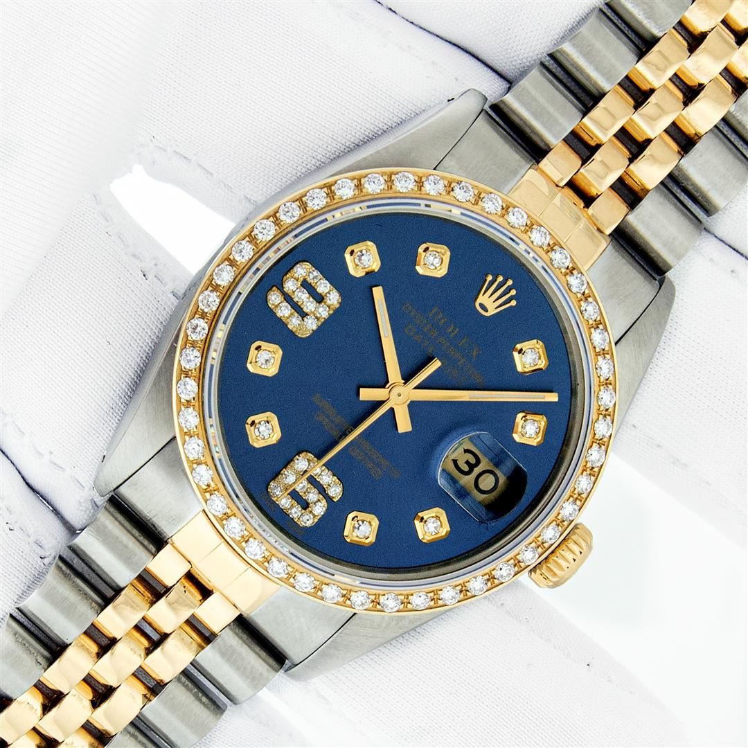One Men's Yellow Gold Two Tone Rolex Datejust Polished, Serviced & Electronically Tested, Yellow Gold & Stainless Steel Case: 36mm, Rolex Yellow Gold Crown, Custom Bezel: New 18K Yellow Gold Beadset Diamond Bezel, Diamond Count: 44 Diamonds, Total Weight 1.00 Carat, Clarity: SI-VS, Color: G to H. Custom Crystal: New Sapphire With Magnified Date Window. Rolex Movement: Automatic Winding Movement. Custom Dial: Refinished To Blue With Added Diamond Hour Markers, Diamond Count: 8 Diamonds + 28 Diamonds On 6 & 9 Hour Markers, Color: G To H In Color, Clarity: SI-VS, Date Window: 3 O'clock Position Date Display, Quickset, Model: Datejust. Condition: G-6 Extra Fine. Rolex Bracelet: Two Tone Yellow Gold & Stainless Steel Jubilee Band. Bright Polish. 7.0 Inch Length, Adjustable. Standard Clasp, With Rolex Logo. This Pre Owned Watch Has Been Serviced Time Tested And Is In Excellent Condition It Is Free Of All Scratches And Dents.
