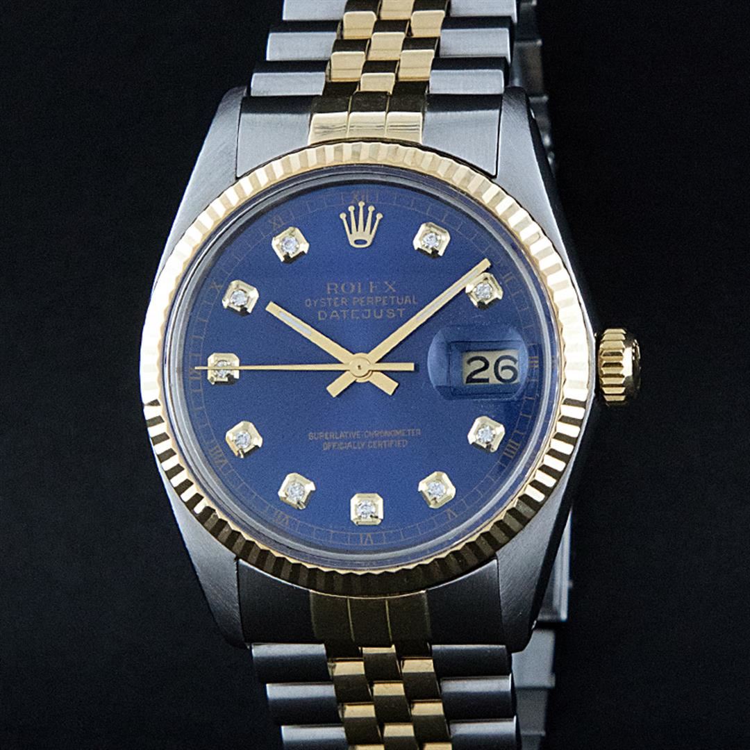 One Men's Yellow Gold Two Tone Rolex Datejust Polished, Serviced & Electronically Tested, Yellow Gold & Stainless Steel Case: 36mm, Yellow Gold Crown, Bezel: Yellow Gold Fluted Bezel. Custom Crystal: New Acrylic Cyclops Lens. Custom Hands: New Luminescent Hands. Movement: Automatic Winding Movement. Custom Dial: Blue With Diamond Hour Markers And Square Roman Track, Diamond Count: 10 Diamonds in Dial, G To H In Color, SI-VS Clarity. Date Window: 3 O'Clock Position Date Display, Quickset, Model: Datejust, Condition: G-6 Extra Fine. Bracelet: Two Tone Yellow Gold & Stainless Steel Jubilee. Bright Polish. 7.0 Inch Length, Adjustable. Standard Clasp, With Rolex Logo. This Watch Has Been Serviced And Polished It Is Free Of All Scratches And Dents.