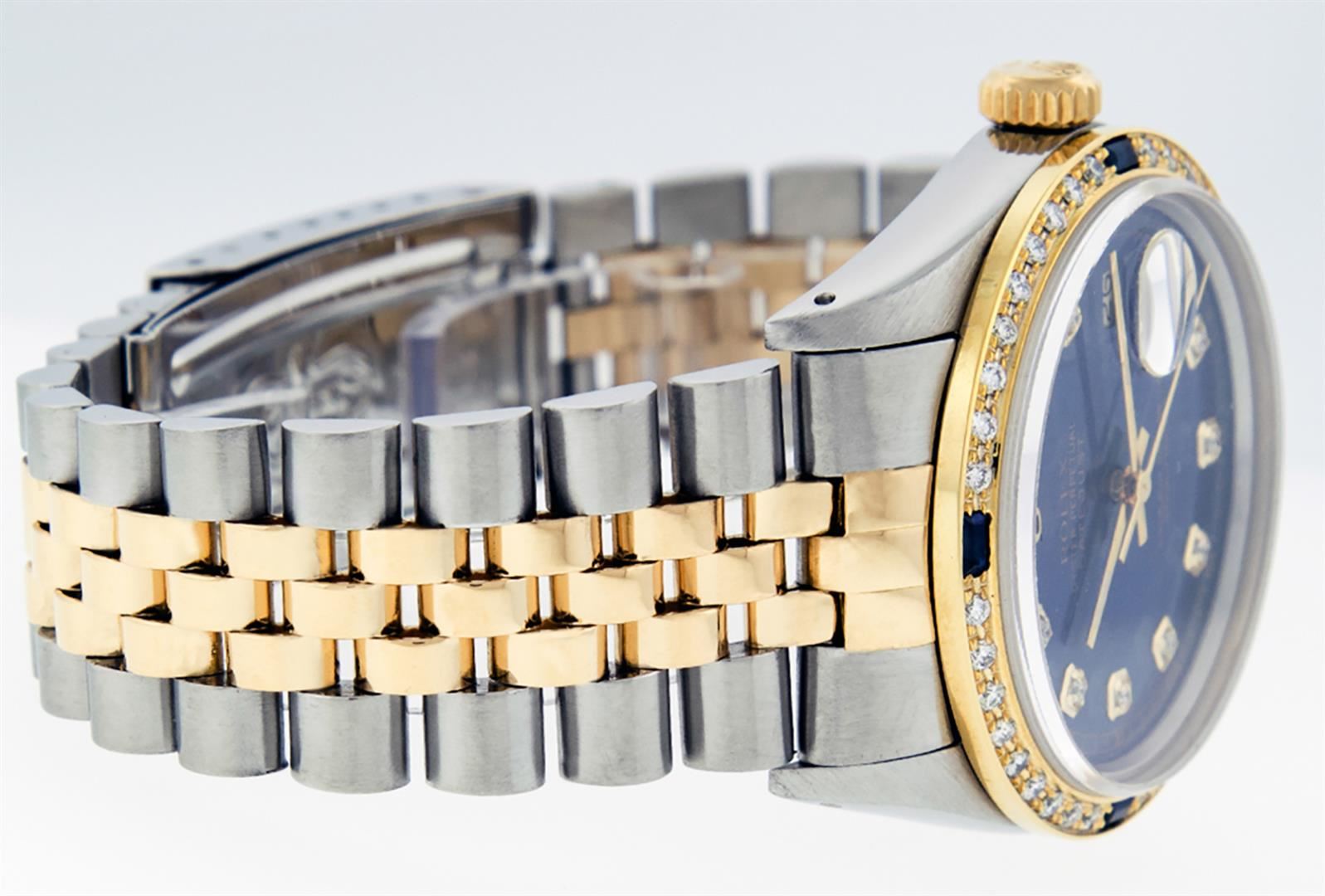 One Men's Yellow Gold Two Tone Rolex Datejust Polished, Serviced & Electronically Tested, Yellow Gold & Stainless Steel Case: 36mm, Yellow Gold Crown, Custom Bezel: New 18K Yellow Gold Sapphire Beadset Diamond Bezel, Diamond Count: 36 Diamonds + 4 Sapphires, Total Weight 1.00 Carat, Clarity: SI-VS, Color: G to H. Custom Crystal: New Synthetic Sapphire Cyclops Lens. Custom Hands: New Luminescent Hands. Movement: Automatic Winding Movement. Custom Dial: Blue With Diamond Hour Markers. Diamond Count: 10 Diamonds, Clarity: SI-VS, Color: Color G to H Date Window: 3 O'clock Position Date Display, Quickset, Model: Condition: G-6 Extra Fine. Bracelet: Two Tone Yellow Gold & Stainless Steel Jubilee. Bright Polish. 7.0 Inch Length, Adjustable. Standard Clasp, With Rolex Logo. This Watch Has Been Serviced Time Tested And Is In Excellent Condition It Is Free Of All Scratches And Dents.