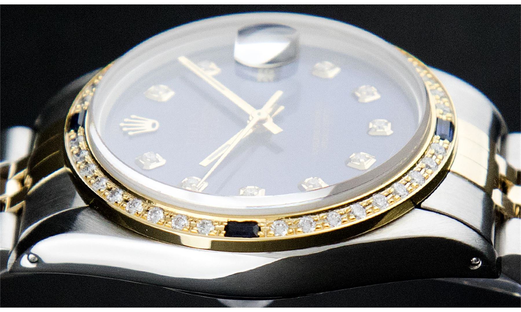 One Men's Yellow Gold Two Tone Rolex Datejust Polished, Serviced & Electronically Tested, Yellow Gold & Stainless Steel Case: 36mm, Yellow Gold Crown, Custom Bezel: New 18K Yellow Gold Sapphire Beadset Diamond Bezel, Diamond Count: 36 Diamonds + 4 Sapphires, Total Weight 1.00 Carat, Clarity: SI-VS, Color: G to H. Custom Crystal: New Synthetic Sapphire Cyclops Lens. Custom Hands: New Luminescent Hands. Movement: Automatic Winding Movement. Custom Dial: Blue With Diamond Hour Markers. Diamond Count: 10 Diamonds, Clarity: SI-VS, Color: Color G to H Date Window: 3 O'clock Position Date Display, Quickset, Model: Condition: G-6 Extra Fine. Bracelet: Two Tone Yellow Gold & Stainless Steel Jubilee. Bright Polish. 7.0 Inch Length, Adjustable. Standard Clasp, With Rolex Logo. This Watch Has Been Serviced Time Tested And Is In Excellent Condition It Is Free Of All Scratches And Dents.