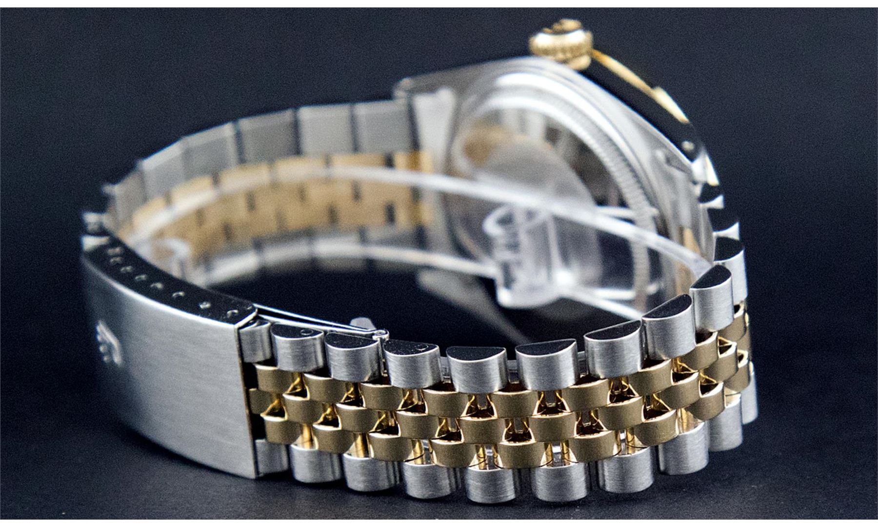 One Men's Yellow Gold Two Tone Rolex Datejust Polished, Serviced & Electronically Tested, Yellow Gold & Stainless Steel Case: 36mm, Yellow Gold Crown, Custom Bezel: New 18K Yellow Gold Sapphire Beadset Diamond Bezel, Diamond Count: 36 Diamonds + 4 Sapphires, Total Weight 1.00 Carat, Clarity: SI-VS, Color: G to H. Custom Crystal: New Synthetic Sapphire Cyclops Lens. Custom Hands: New Luminescent Hands. Movement: Automatic Winding Movement. Custom Dial: Blue With Diamond Hour Markers. Diamond Count: 10 Diamonds, Clarity: SI-VS, Color: Color G to H Date Window: 3 O'clock Position Date Display, Quickset, Model: Condition: G-6 Extra Fine. Bracelet: Two Tone Yellow Gold & Stainless Steel Jubilee. Bright Polish. 7.0 Inch Length, Adjustable. Standard Clasp, With Rolex Logo. This Watch Has Been Serviced Time Tested And Is In Excellent Condition It Is Free Of All Scratches And Dents.
