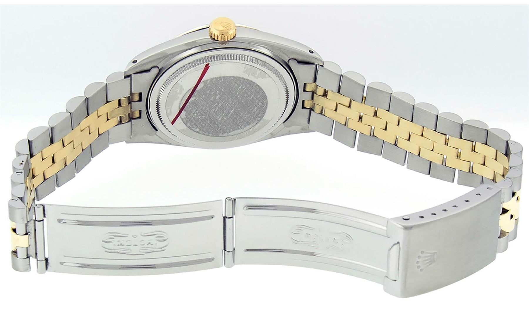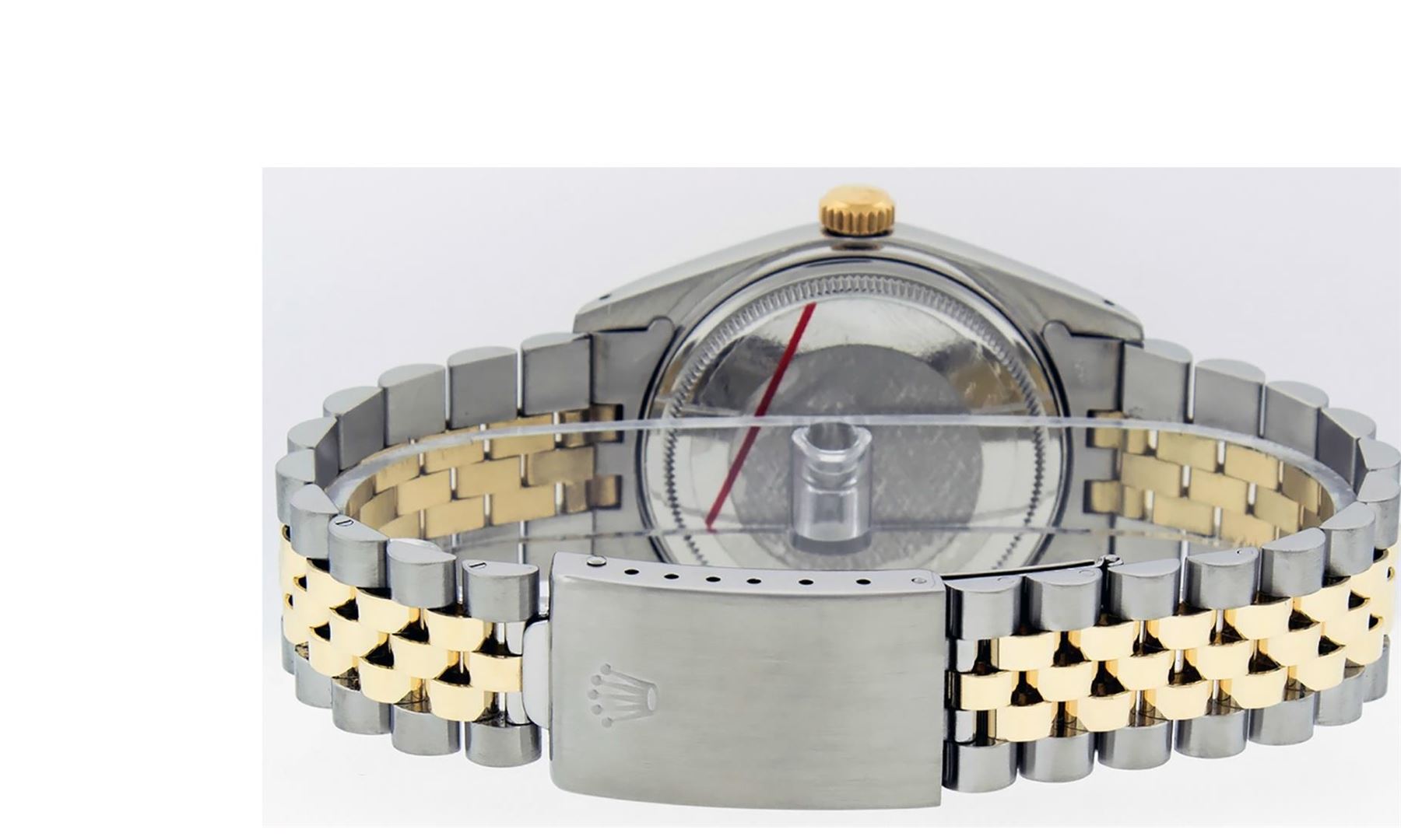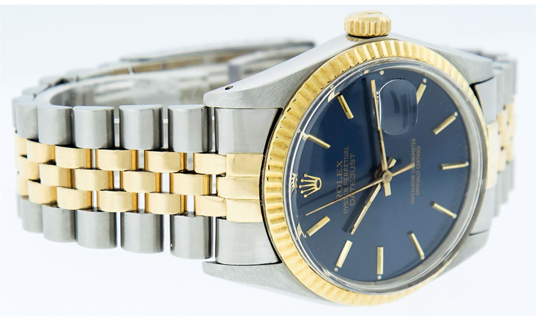 One Men's Rolex Pre Owned Two Tone 14K Yellow Gold And Stainless Steel Datejust Polished, Serviced & Electronically Tested, Rolex Yellow Gold & Stainless Steel Case: 36mm, Rolex Yellow Gold Crown, Rolex Bezel: 14K Yellow Gold Fluted Bezel. Custom Crystal: New Acrylic With Magnified Date Window. Rolex Hands: Luminescent Hands. Rolex Movement: Automatic Winding Movement 3035. Rolex Dial: Blue Index Dial With Index Track. Date Window: 3 O'Clock Position Date Display, Quickset, Model: Datejust. Condition: G-6 Extra Fine. Rolex Bracelet: Two Tone 14K Yellow Gold & Stainless Steel Jubilee Band. Bright Polish. 7.0 Inch Length, Adjustable. Standard Clasp, With Rolex Logo. This Watch Has Been Serviced Time Tested And Is In Excellent Condition It Is Free Of All Scratches And Dents.