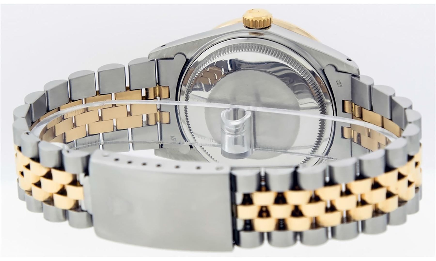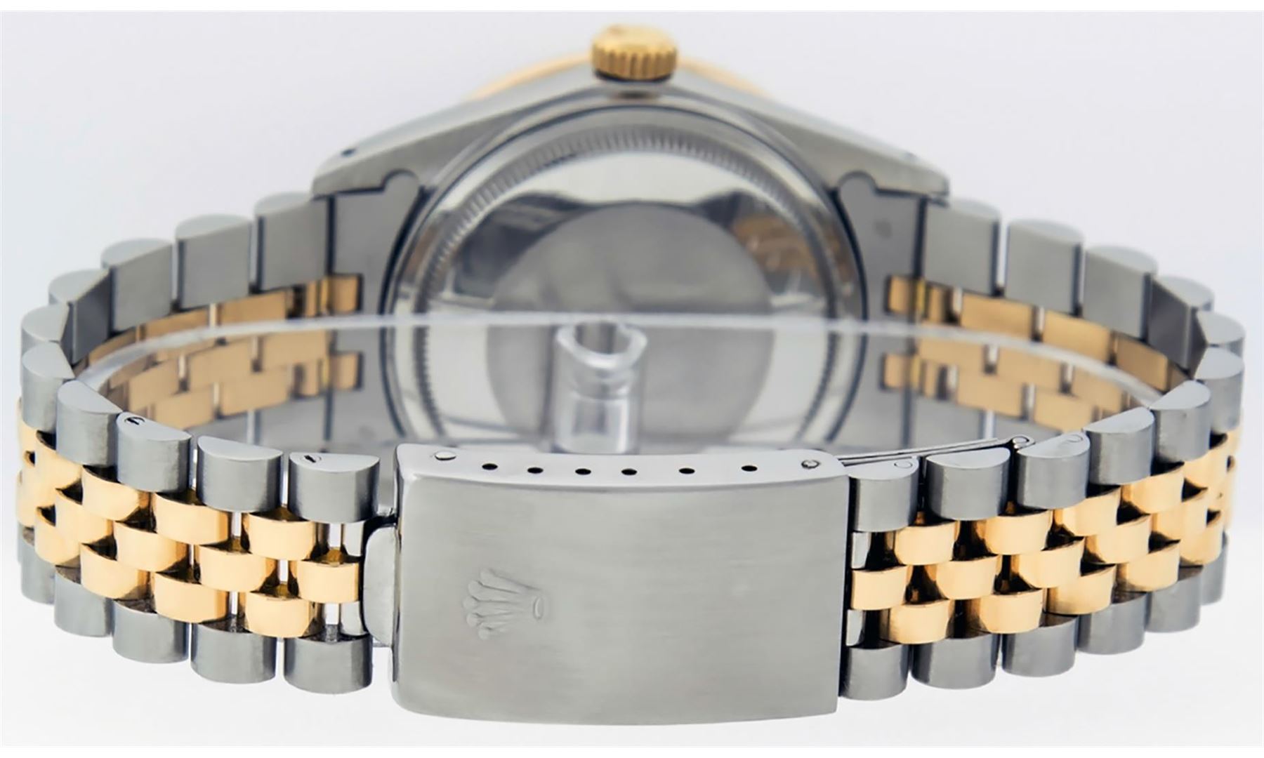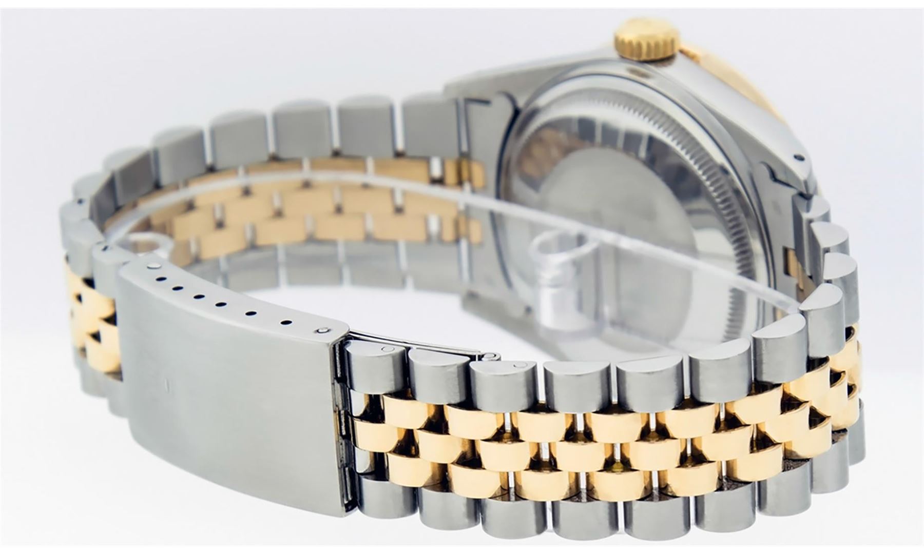 One Men's Yellow Gold Rolex Datejust Polished Bright with Satin Finish, Serviced & Electronically Tested, Stainless Steel Case: 36mm, Yellow Gold Crown, Custom Bezel: New 18K Yellow Gold Pyramid Diamond Bezel, Diamond Count: 24 Diamonds, Total Weight .75 Carat, Clarity: SI-VS, Color: G to H. Custom Crystal: New Synthetic Sapphire Cyclops Lens. Custom Hands: New Luminescent Hands. Movement: Automatic Winding Movement. Custom Dial: Blue Vignette String Diamond Dial, Diamond Count: 58 Diamonds In Dial, Color: G to H, Clarity: VS. Date Window: 3 O'Clock Position Date Display, Quickset, Model: Datejust. Condition: G-6 Extra Fine. Bracelet: Yellow Gold And Stainless Steel Jubilee Band. Bright Polish & Satin Finish. 7.0 Inch Length, Adjustable. Standard Clasp, With Rolex Logo. This Watch Has Been Serviced And Polished It Is Free Of All Scratches And Dents. This Watch Comes With A Rolex Box.