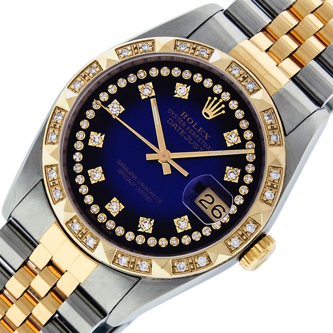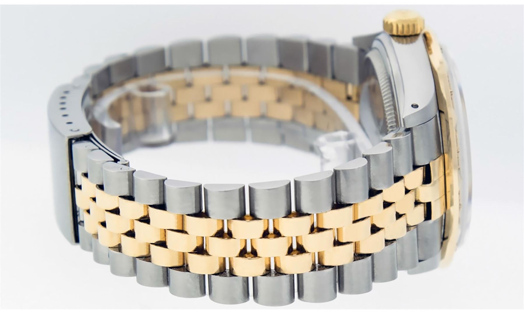 One Men's Yellow Gold Rolex Datejust Polished Bright with Satin Finish, Serviced & Electronically Tested, Stainless Steel Case: 36mm, Yellow Gold Crown, Custom Bezel: New 18K Yellow Gold Pyramid Diamond Bezel, Diamond Count: 24 Diamonds, Total Weight .75 Carat, Clarity: SI-VS, Color: G to H. Custom Crystal: New Synthetic Sapphire Cyclops Lens. Custom Hands: New Luminescent Hands. Movement: Automatic Winding Movement. Custom Dial: Blue Vignette String Diamond Dial, Diamond Count: 58 Diamonds In Dial, Color: G to H, Clarity: VS. Date Window: 3 O'Clock Position Date Display, Quickset, Model: Datejust. Condition: G-6 Extra Fine. Bracelet: Yellow Gold And Stainless Steel Jubilee Band. Bright Polish & Satin Finish. 7.0 Inch Length, Adjustable. Standard Clasp, With Rolex Logo. This Watch Has Been Serviced And Polished It Is Free Of All Scratches And Dents. This Watch Comes With A Rolex Box.