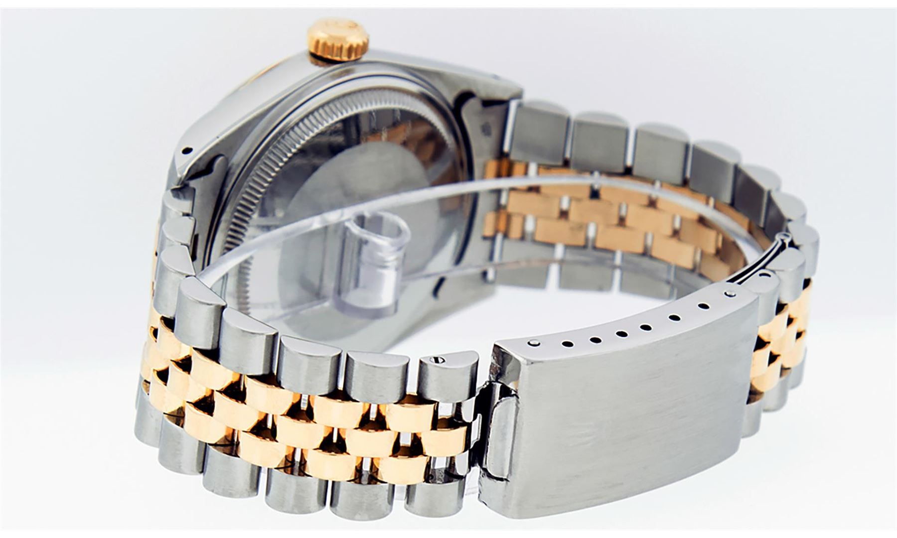 One Men's Yellow Gold Two Tone Rolex Datejust Polished, Serviced & Electronically Tested, Yellow Gold & Stainless Steel Case: 36mm, Yellow Gold Crown, Bezel: Yellow Gold Fluted Bezel. Custom Crystal: New Acrylic Cyclops Lens. Custom Hands: New Luminescent Hands. Movement: Automatic Winding Movement . Custom Dial: Blue Vignette String Dial Set With VS Diamond Hour Markers, Diamond Count: 58 Diamonds in Dial, G To H In Color, SI-VS Clarity. Date Window: 3 O'clock Position Date Display, Quickset, Model: Datejust, Condition: G-6 Extra Fine. Bracelet: Two Tone Yellow Gold & Stainless Steel Jubilee. Bright Polish. 7.0 Inch Length, Adjustable. Standard Clasp, With Rolex Logo. This Watch Has Been Serviced And Polished It Is Free Of All Scratches And Dents.