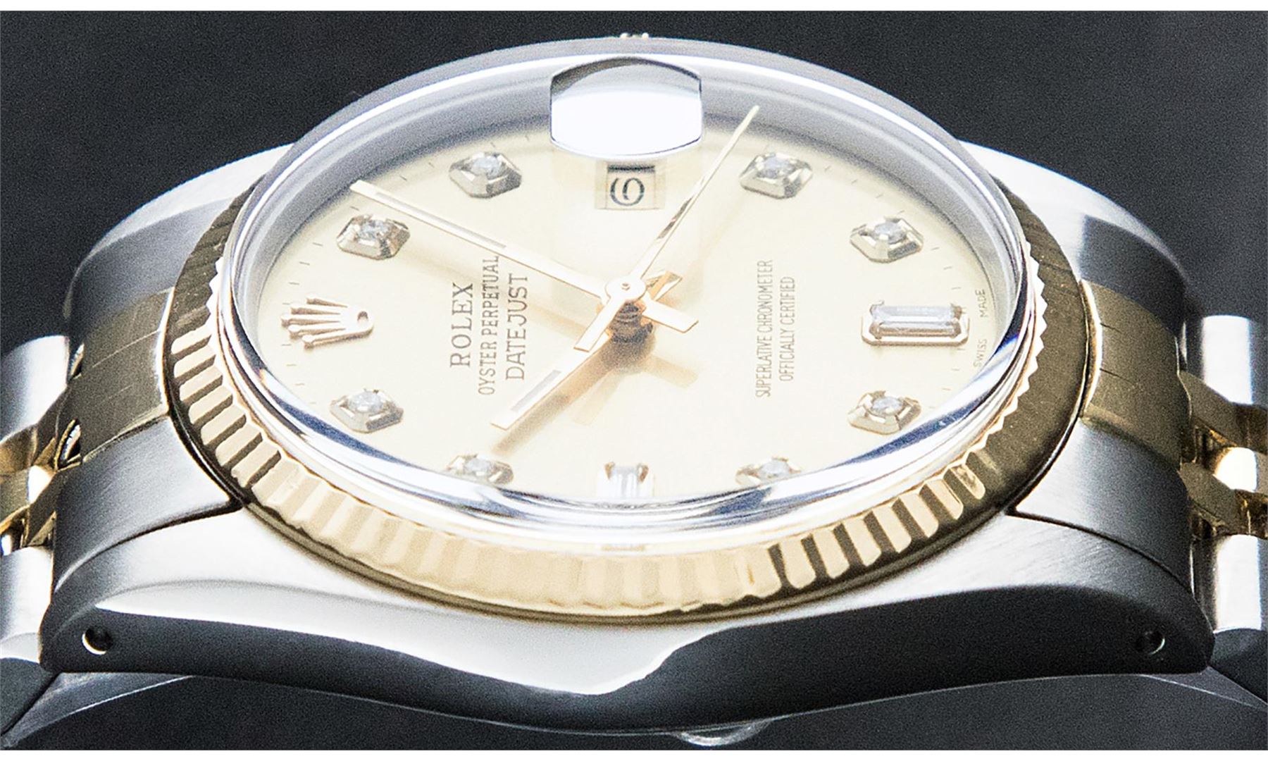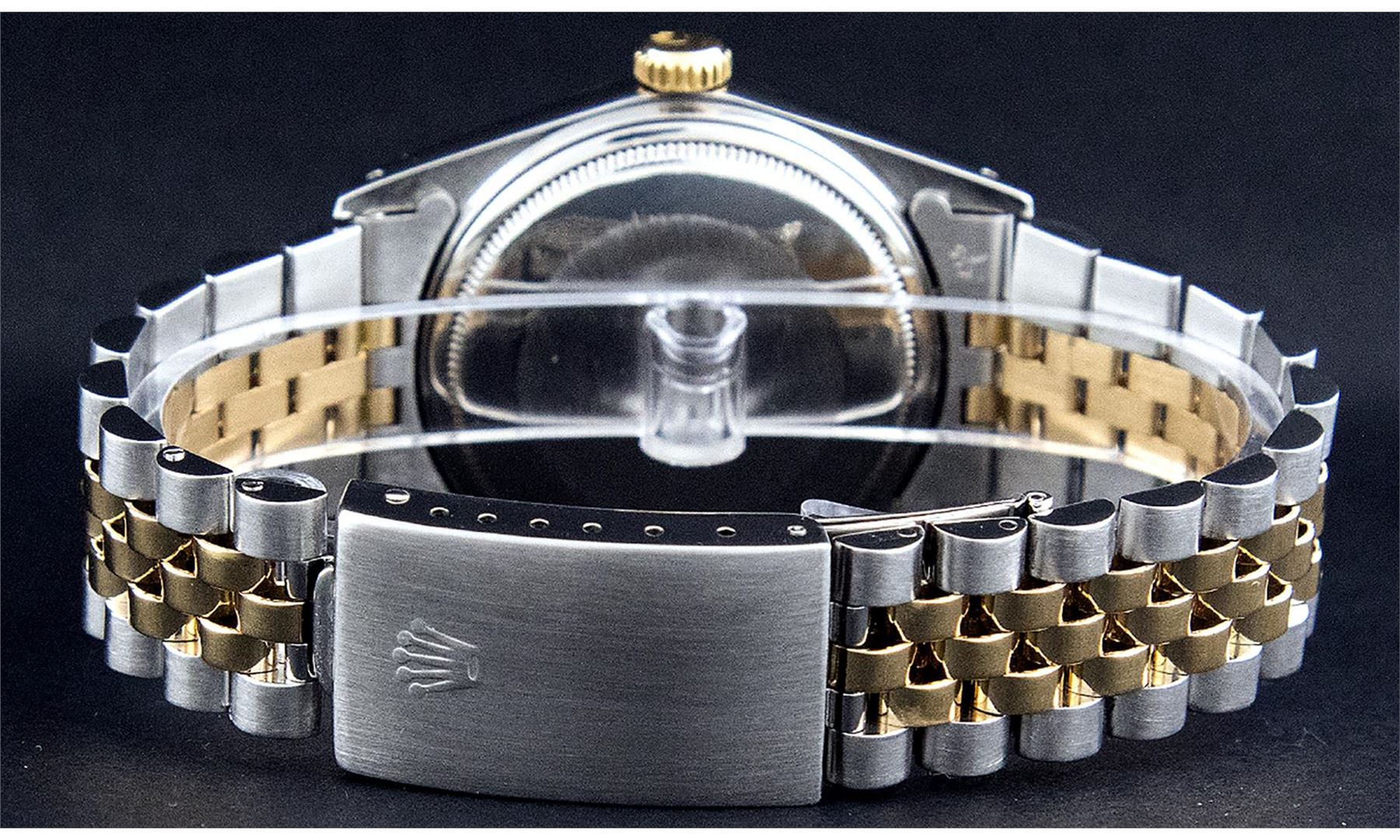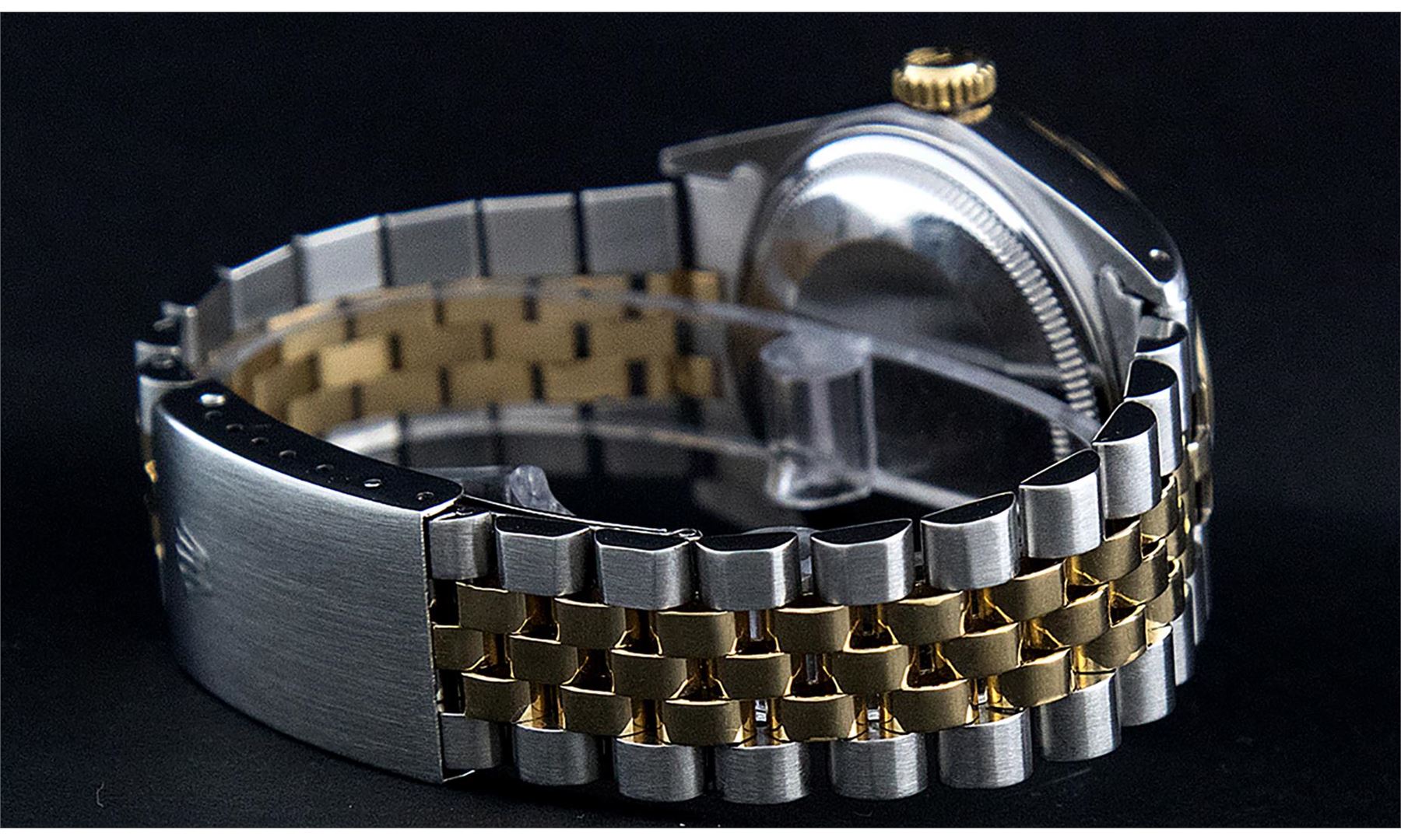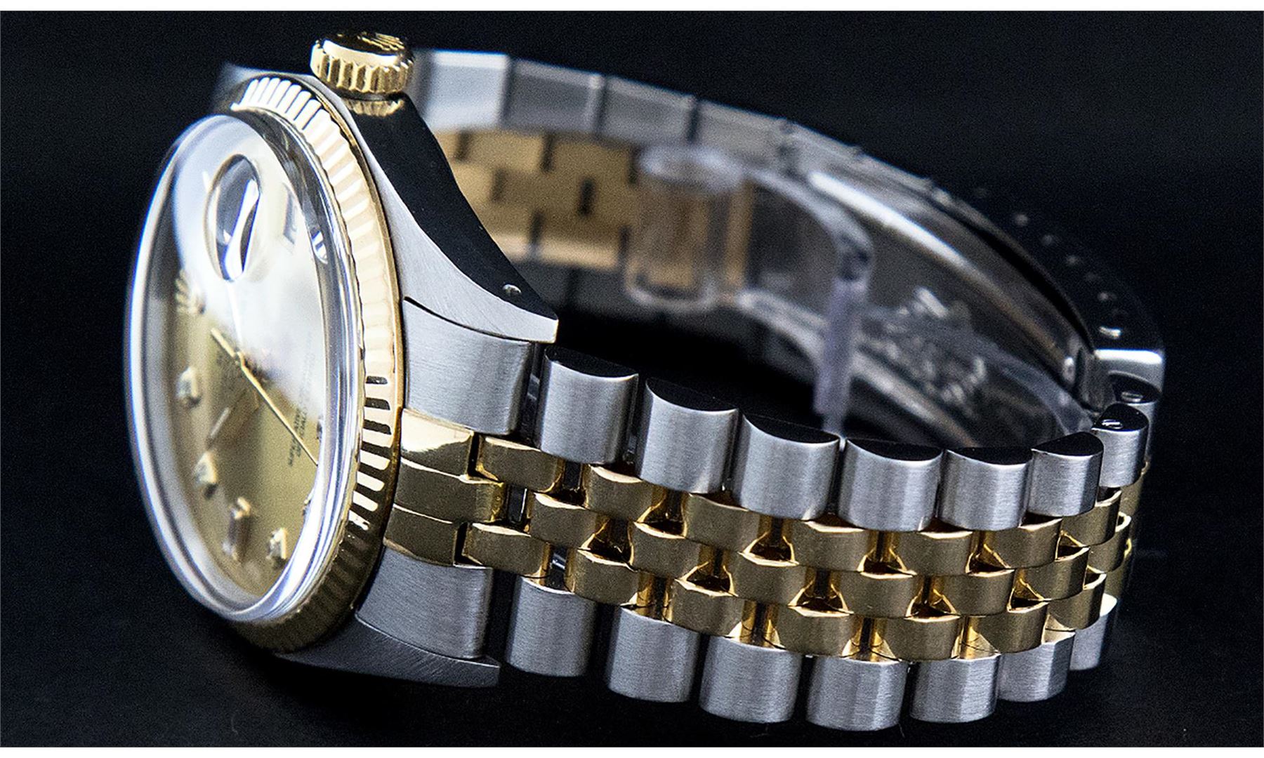 One Men's Pre Owned Yellow Gold Two Tone Rolex Datejust Polished, Serviced & Electronically Tested, Rolex Yellow Gold & Stainless Steel Case: 36mm, Rolex Yellow Gold Crown, Rolex Bezel: Yellow Gold Fluted Bezel. Custom Crystal: New Acrylic Cyclops Lens. Custom Hands: New Luminescent Hands. Rolex Movement: Automatic Winding Movement. Custom Dial: Refinished To Champagne With Added Diamonds, Diamond Count: 8 Diamonds + 2 Baguette Diamonds in Dial, G To H In Color, SI-VS Clarity. Date Window: 3 O'Clock Position Date Display, Quickset, Model: Datejust, Condition: G-6 Extra Fine. Rolex Bracelet: Two Tone Yellow Gold & Stainless Steel Jubilee Band. Bright Polish. 7.0 Inch Length, Adjustable. Standard Clasp, With Rolex Logo. This Watch Has Been Serviced And Polished It Is Free Of All Scratches And Dents.