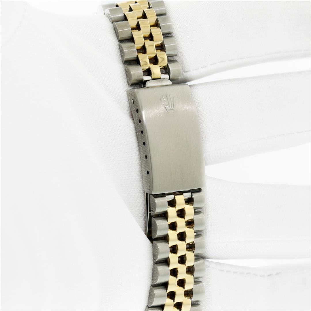 One Men's Yellow Gold Two Tone Rolex Datejust Polished, Serviced & Electronically Tested, Rolex Yellow Gold & Stainless Steel Case: 36mm, Rolex Yellow Gold Crown, Custom Bezel: 18K Yellow Gold Beadset Diamond Bezel, Diamond Count: 44 Diamonds, Clarity: SI-VS, Color: G to H. Custom Crystal: New Sapphire With Magnified Date Window. Custom Hands: New Luminescent Hands. Rolex Movement: Automatic Winding Movement. Custom Dial: Refinished To Champagne With Added Diamonds, Diamond Count: 10 Diamonds in Dial, G To H In Color, VS In Clarity. Date Window: 3 O'clock Position Date Display, Quickset, Model: Datejust. Condition: G-6 Extra Fine. Rolex Bracelet: Two Tone Yellow Gold & Stainless Steel Jubilee Band. Bright Polish. 7.0 Inch Length, Adjustable. Standard Clasp, With Rolex Logo. This Pre Owned Watch Has Been Serviced Time Tested And Is In Excellent Condition It Is Free Of All Scratches And Dents.