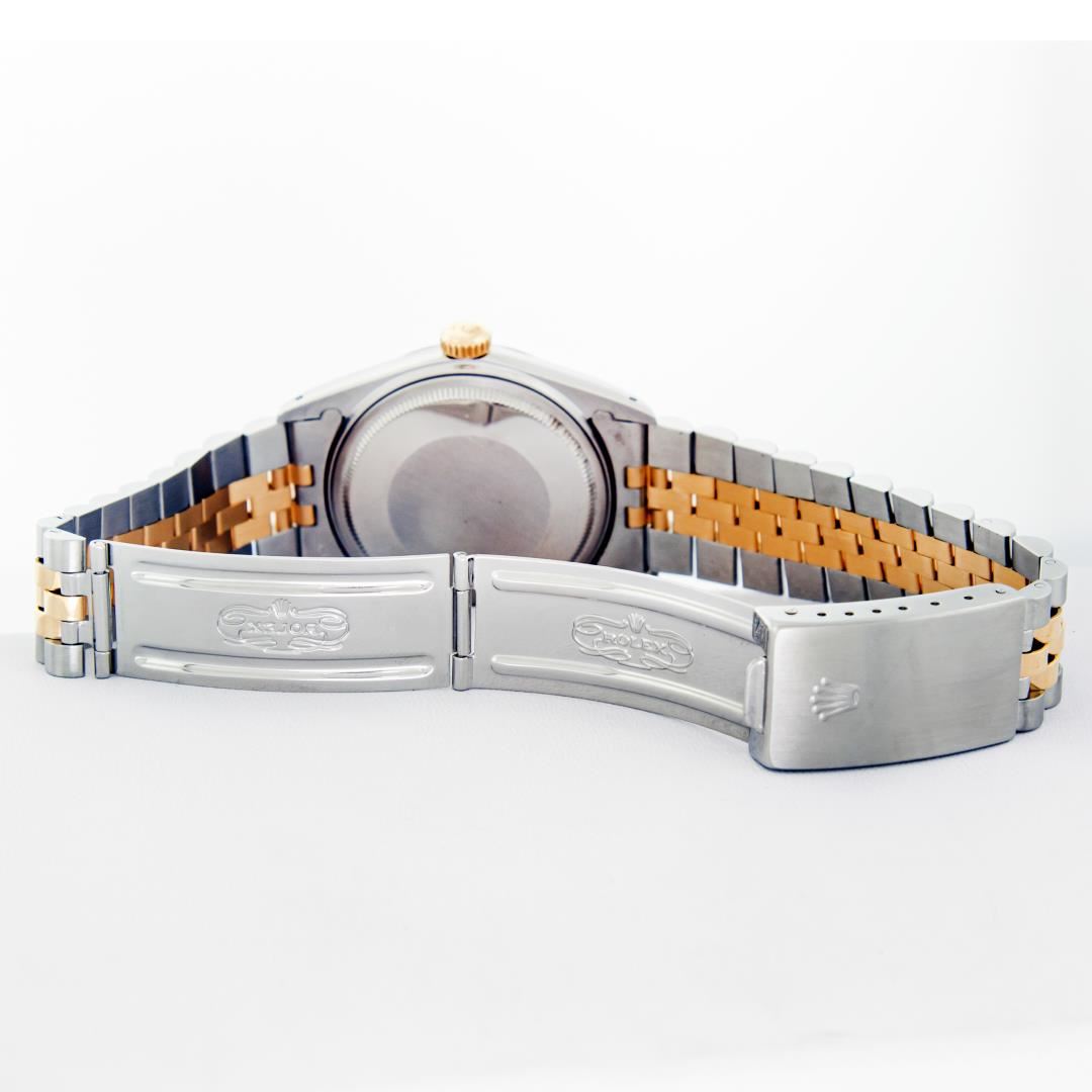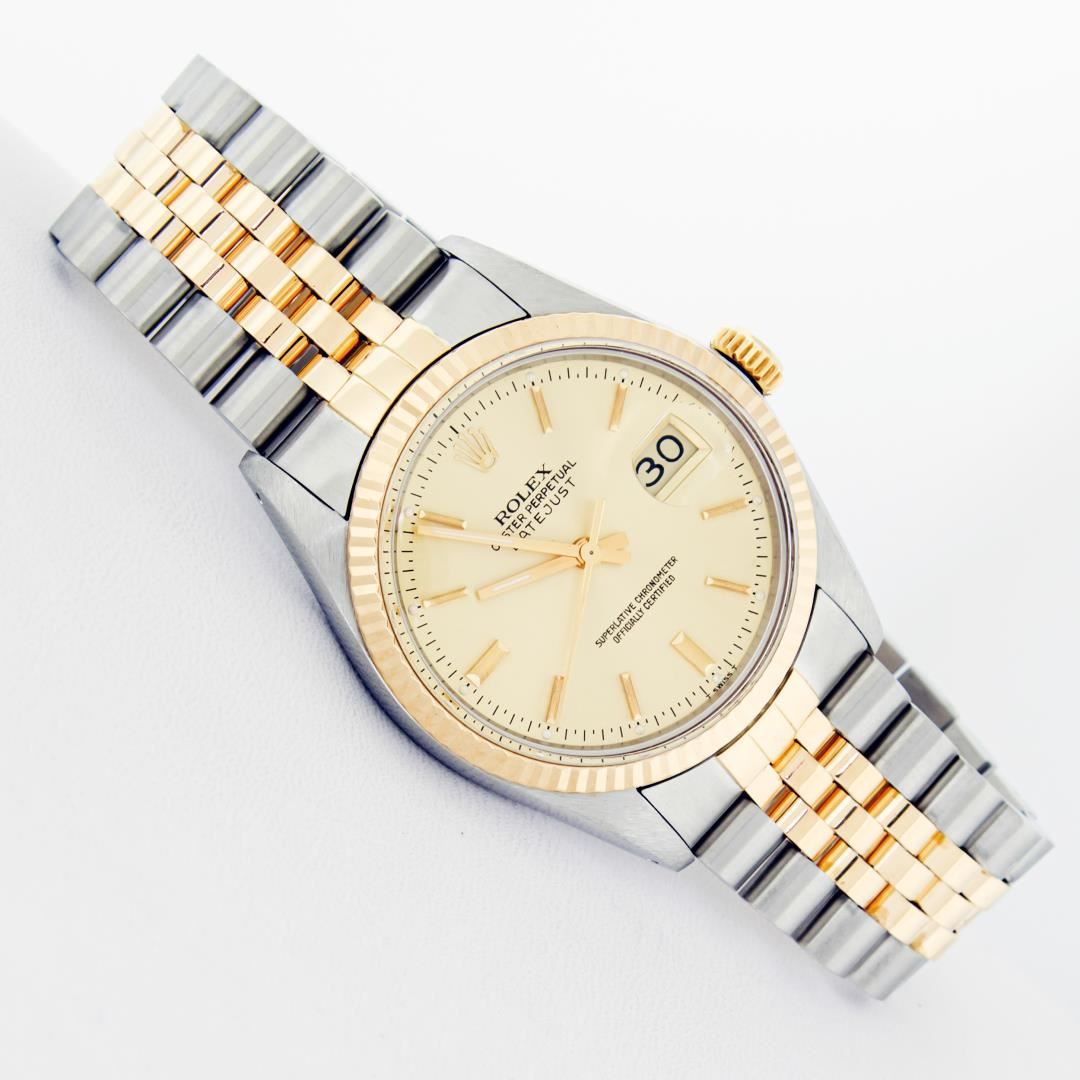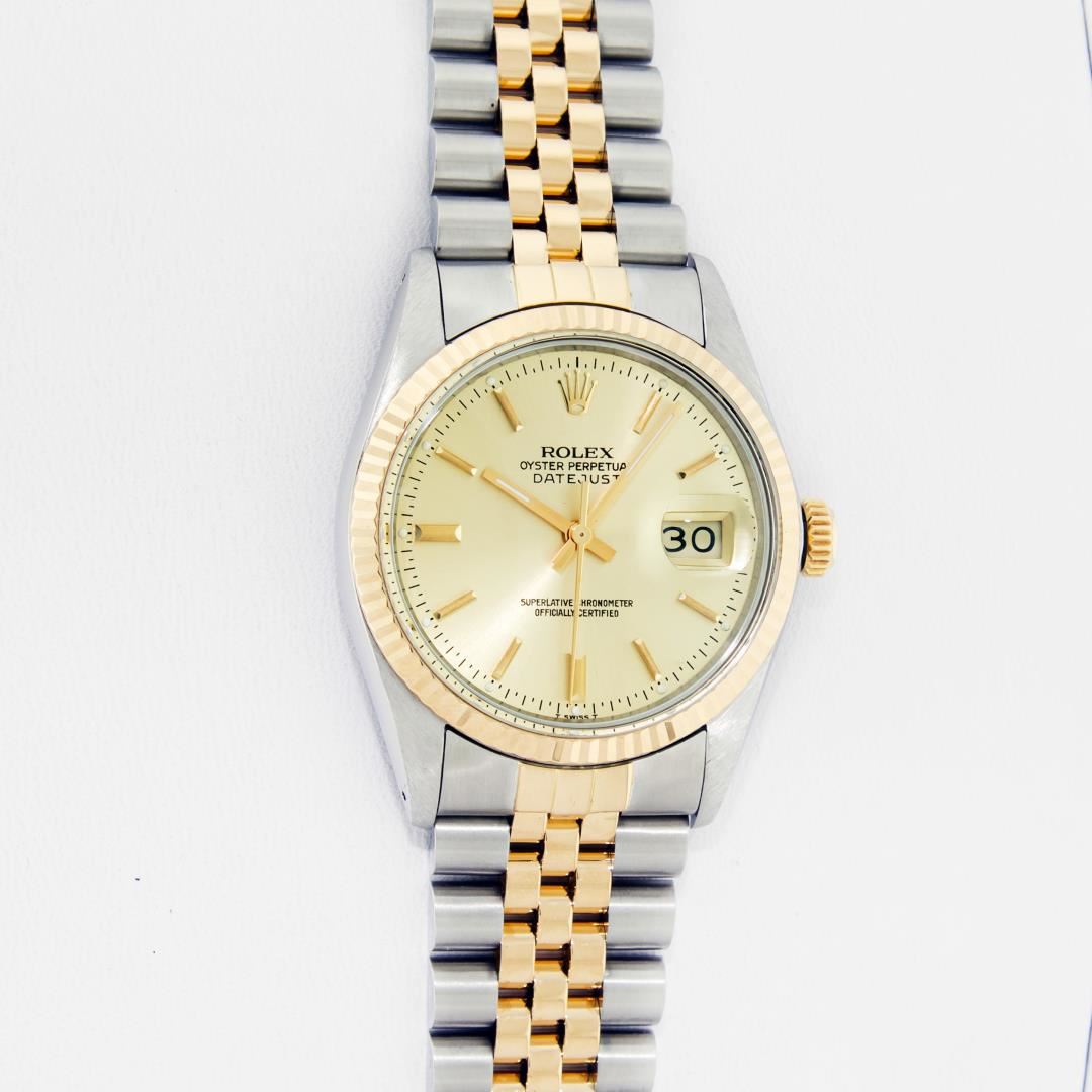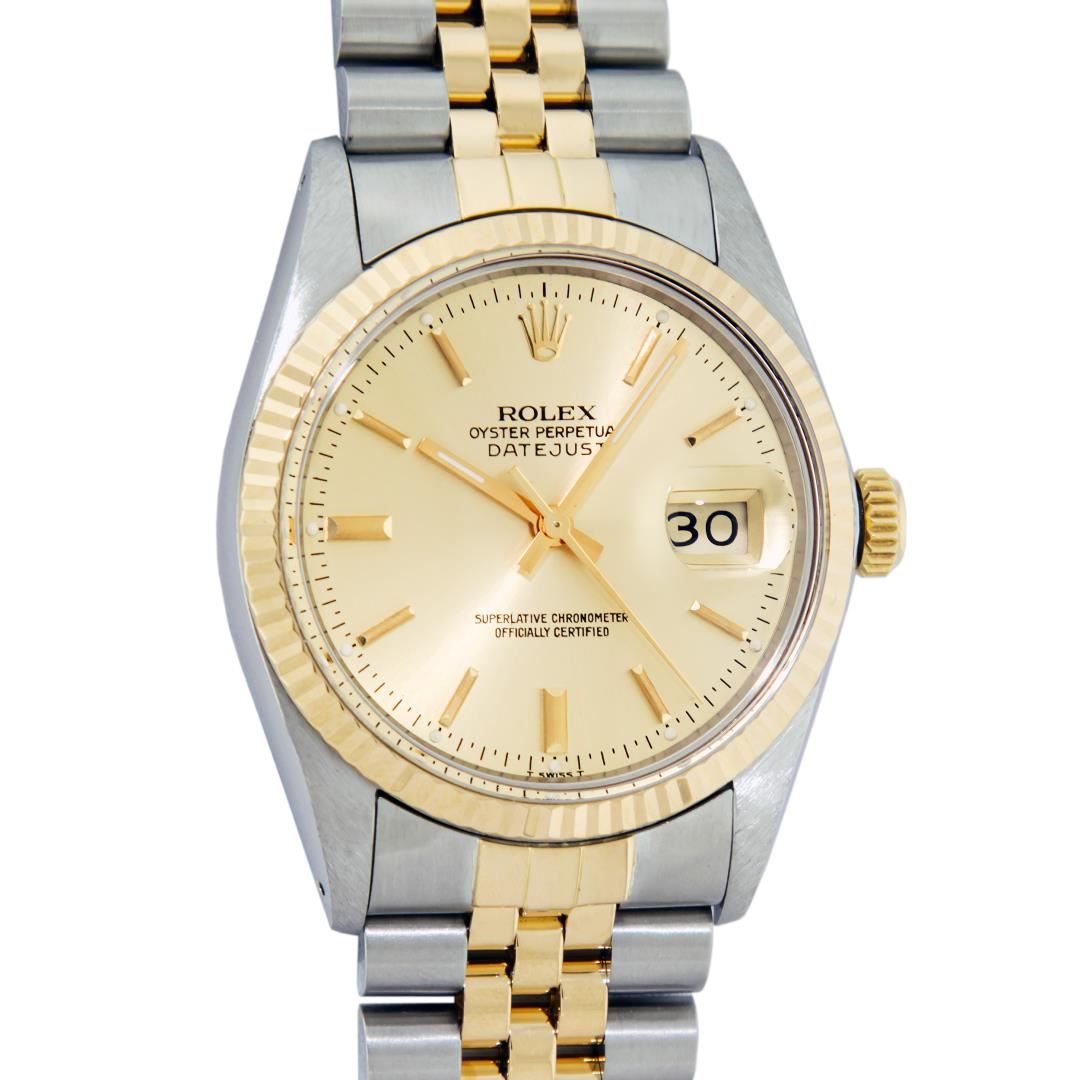 One Men's Rolex Pre Owned 14K Two Tone Yellow Gold And Stainless Steel Datejust Polished, Serviced & Electronically Tested, Yellow Gold & Stainless Steel Case: 36mm, Yellow Gold Crown, Rolex Bezel: 14K Yellow Gold Fluted Bezel. Custom Crystal: New Acrylic With Magnified Date Window. Custom Hands: New Luminescent Hands. Rolex Movement: Automatic Winding Movement 3035. Rolex Dial: Champagne Index Dial With Dash Track & Lumi Dots. Date Window: 3 O'Clock Position Date Display, Quickset, Model: Datejust. Condition: G-6 Extra Fine. Rolex Bracelet: Two Tone 14K Yellow Gold And Stainless Steel Jubilee Band. Bright Polish. 7.0 Inch Length, Adjustable. Standard Clasp, With Rolex Logo. This Watch Has Been Serviced Time Tested And Is In Excellent Condition It Is Free Of All Scratches And Dents.