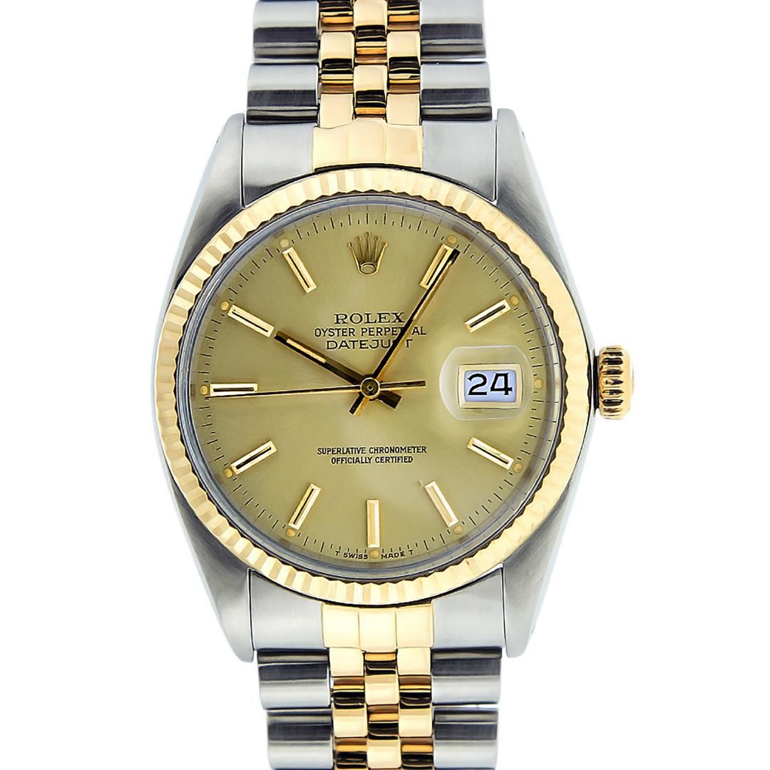 One Men's Rolex Pre Owned 14K Two Tone Yellow Gold And Stainless Steel Datejust Polished, Serviced & Electronically Tested, Yellow Gold & Stainless Steel Case: 36mm, Yellow Gold Crown, Rolex Bezel: 14K Yellow Gold Fluted Bezel. Custom Crystal: New Acrylic With Magnified Date Window. Hands: Luminescent Hands. Rolex Movement: Automatic Winding Movement 3035. Rolex Dial: Champagne Index Dial With Dash Track & Lumi Dots. Date Window: 3 O'Clock Position Date Display, Quickset, Model: Datejust. Condition: G-6 Extra Fine. Rolex Bracelet: Two Tone 14K Yellow Gold And Stainless Steel Jubilee Band. Bright Polish. 7.0 Inch Length, Adjustable. Standard Clasp, With Rolex Logo. This Watch Has Been Serviced Time Tested And Is In Excellent Condition It Is Free Of All Scratches And Dents.