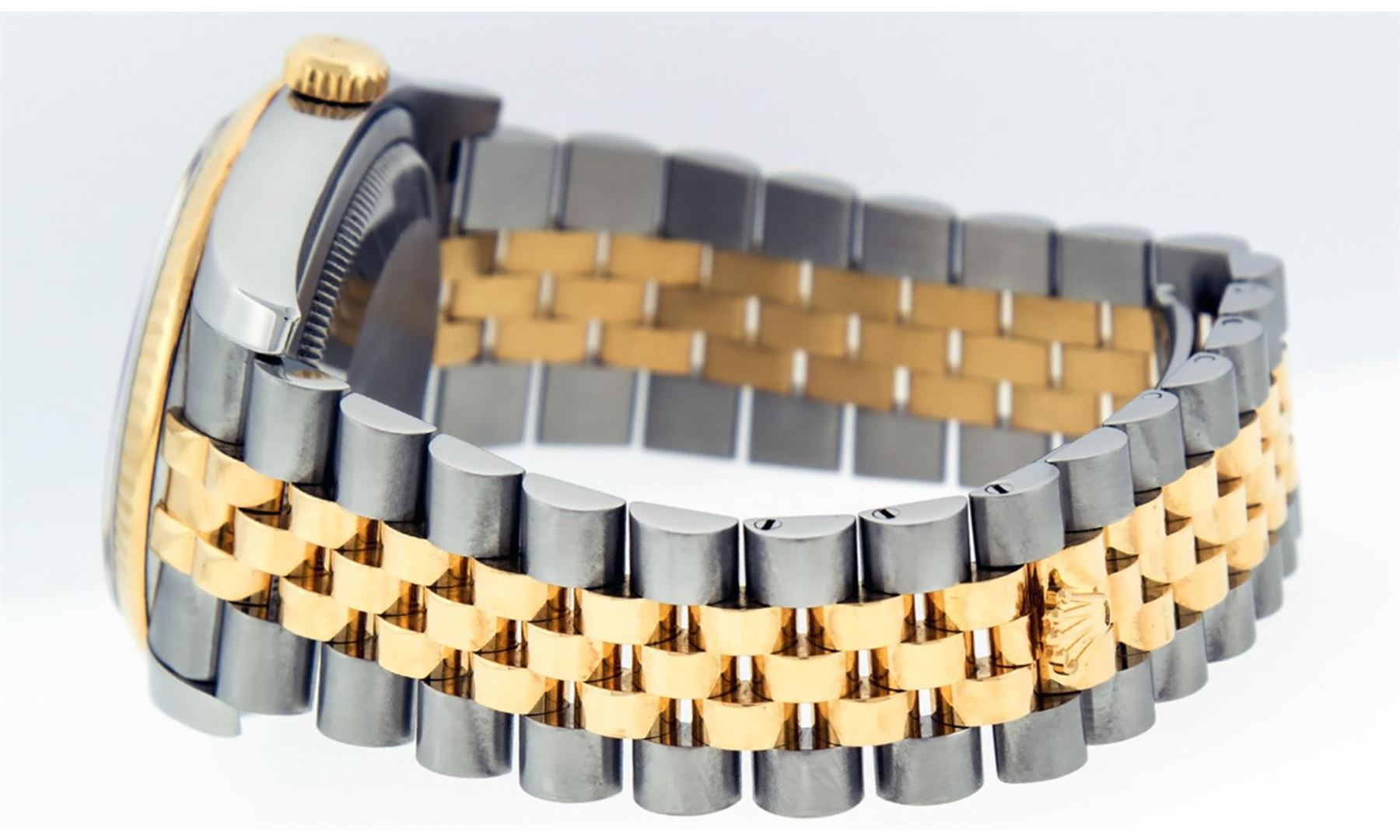 One Men's Rolex Two Tone 18K Yellow Gold And Stainless Steel Datejust, Polished Bright with Satin Finish, Serviced & Electronically Tested, Stainless Steel Case: 36mm, Rolex Yellow Gold Crown, Rolex Bezel: 18K Yellow Gold Fluted Bezel. Crystal: Sapphire With Cyclops Lens. Rolex Movement: Automatic Winding Movement Caliber 3135. Rolex Dial: Champagne Index With Square Roman Track. Date Window: 3 O'Clock Position Date Display, Quickset, Model: Quickset Datejust 116233. Condition: G-6 Extra Fine. Rolex Bracelet: 18K Yellow Gold And Stainless Steel Jubilee Band. Bright Polish & Satin Finish. 7.0 Inch Length, Adjustable. Standard Clasp, With Rolex Logo. This Pre Owned Watch Has Been Serviced Time Tested And Is In Excellent Condition It Is Free Of All Scratches And Dents.