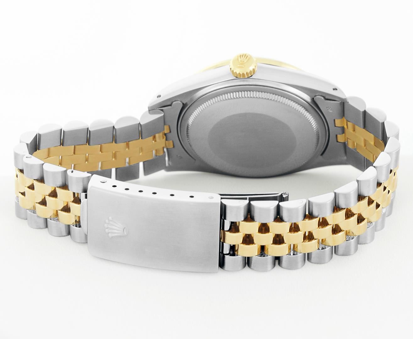 One Men's Rolex Quickset Pre Owned Two Tone 14K Yellow Gold And Stainless Steel Datejust Polished, Serviced & Electronically Tested, Rolex Yellow Gold & Stainless Steel Case: 36mm, Rolex 14K Yellow Gold Crown, Custom Bezel: New 18K Yellow Diamond + Emerald Beadset Bezel, Stone Count: 36 Diamonds + 4 Emeralds, Total Weight .75 Carat, Clarity: SI-VS, Color: G to H. Custom Crystal: New Sapphire With Magnified Date Window. Custom Hands: New Luminescent Hands. Rolex Movement: Automatic Winding Movement 3035. Rolex Dial: Champagne Dial With Index Hour Markers Dash Track And Lumi Dots. Date Window: 3 O'Clock Position Date Display, Quickset, Model: Datejust. Condition: G-6 Extra Fine. Rolex Bracelet: Two Tone 14K Yellow Gold & Stainless Steel Jubilee Band. Bright Polish. 7.0 Inch Length, Adjustable. Standard Clasp, With Rolex Logo. This Watch Has Been Serviced Time Tested And Is In Excellent Condition It Is Free Of All Scratches And Dents.