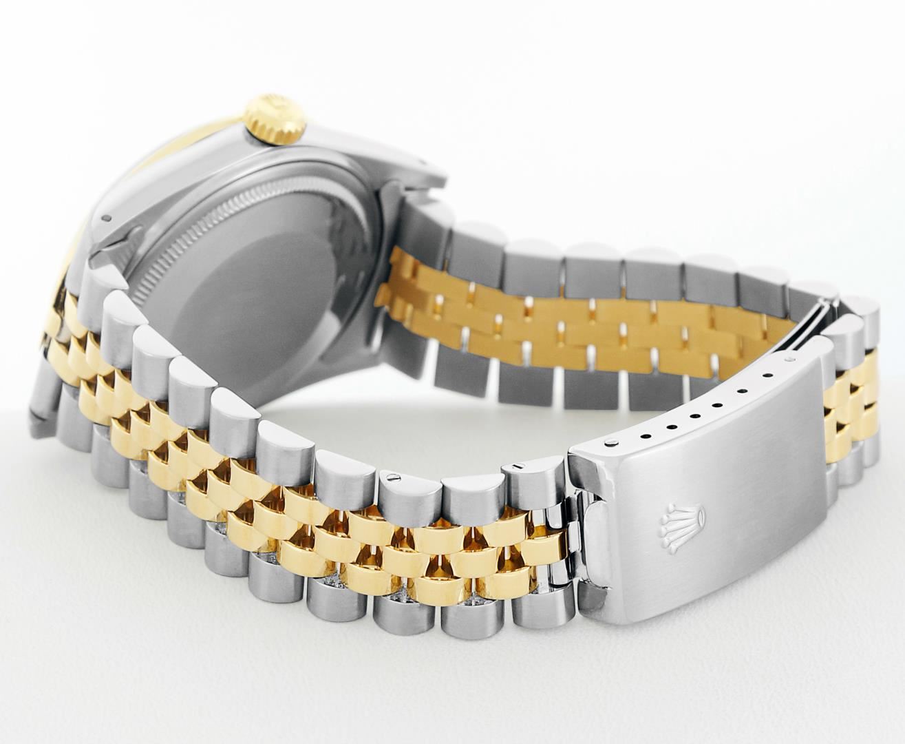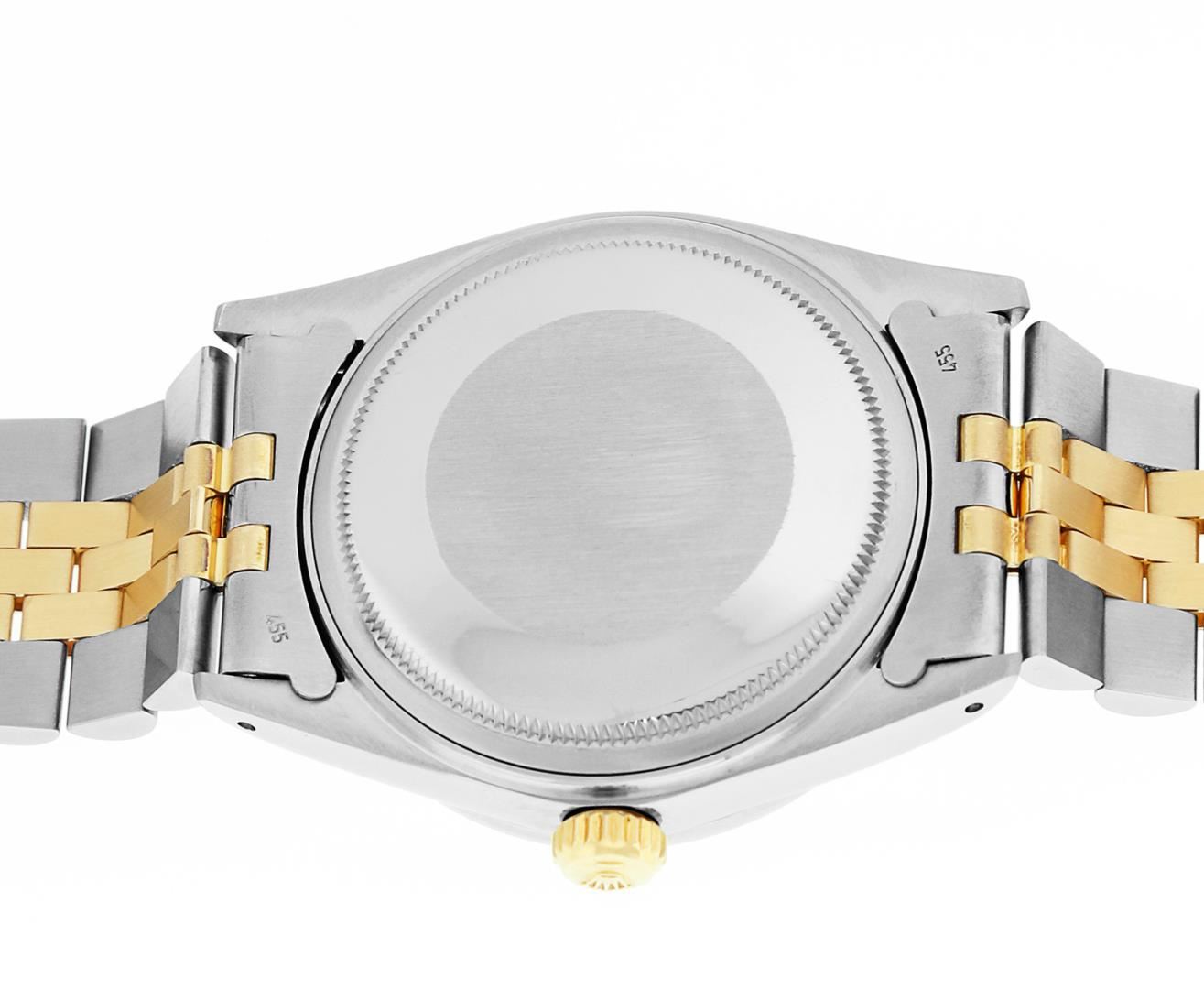 One Men's Rolex Quickset Pre Owned Two Tone 14K Yellow Gold And Stainless Steel Datejust Polished, Serviced & Electronically Tested, Rolex Yellow Gold & Stainless Steel Case: 36mm, Rolex 14K Yellow Gold Crown, Custom Bezel: New 18K Yellow Diamond + Emerald Beadset Bezel, Stone Count: 36 Diamonds + 4 Emeralds, Total Weight .75 Carat, Clarity: SI-VS, Color: G to H. Custom Crystal: New Sapphire With Magnified Date Window. Custom Hands: New Luminescent Hands. Rolex Movement: Automatic Winding Movement 3035. Rolex Dial: Champagne Dial With Index Hour Markers Dash Track And Lumi Dots. Date Window: 3 O'Clock Position Date Display, Quickset, Model: Datejust. Condition: G-6 Extra Fine. Rolex Bracelet: Two Tone 14K Yellow Gold & Stainless Steel Jubilee Band. Bright Polish. 7.0 Inch Length, Adjustable. Standard Clasp, With Rolex Logo. This Watch Has Been Serviced Time Tested And Is In Excellent Condition It Is Free Of All Scratches And Dents.