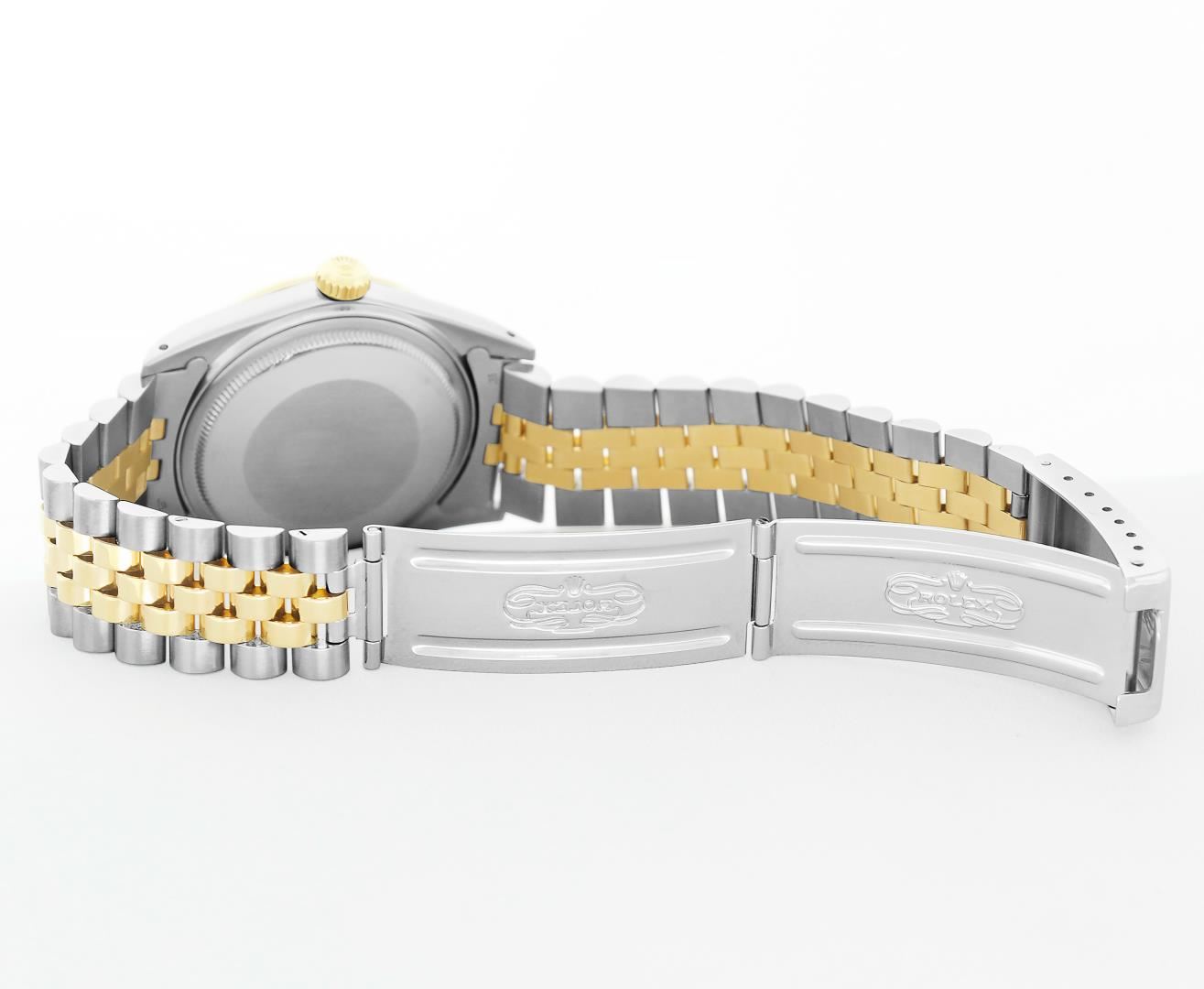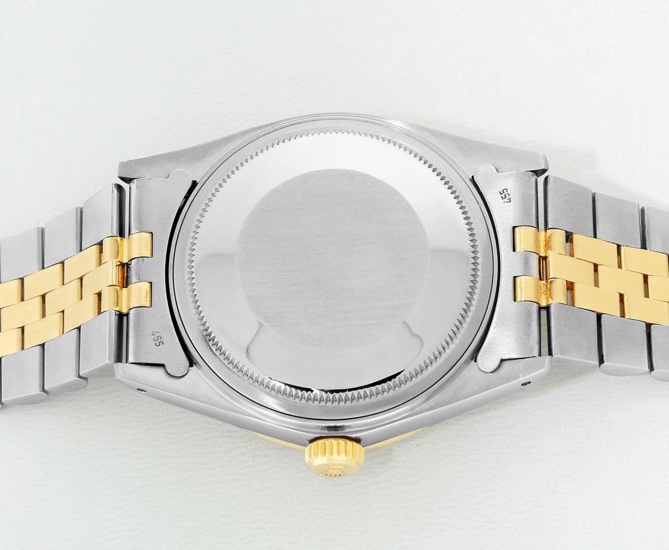 One Men's Rolex Quickset Pre Owned Two Tone 14K Yellow Gold And Stainless Steel Datejust Polished, Serviced & Electronically Tested, Rolex Yellow Gold & Stainless Steel Case: 36mm, Rolex 14K Yellow Gold Crown, Custom Bezel: New 18K Yellow Diamond + Ruby Beadset Bezel, Stone Count: 36 Diamonds + 4 Rubies, Total Weight .75 Carat, Clarity: SI-VS, Color: G to H. Custom Crystal: New Sapphire With Magnified Date Window. Custom Hands: New Luminescent Hands. Rolex Movement: Automatic Winding Movement 3035. Rolex Dial: Champagne Dial With Index Hour Markers Dash Track And Lumi Dots. Date Window: 3 O'Clock Position Date Display, Quickset, Model: Datejust. Condition: G-6 Extra Fine. Rolex Bracelet: Two Tone 14K Yellow Gold & Stainless Steel Jubilee Band. Bright Polish. 7.0 Inch Length, Adjustable. Standard Clasp, With Rolex Logo. This Watch Has Been Serviced Time Tested And Is In Excellent Condition It Is Free Of All Scratches And Dents.