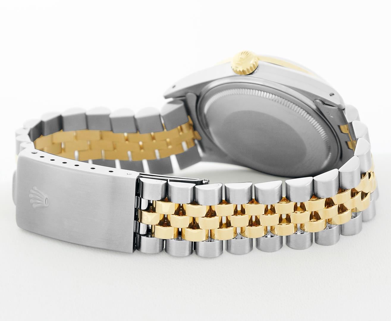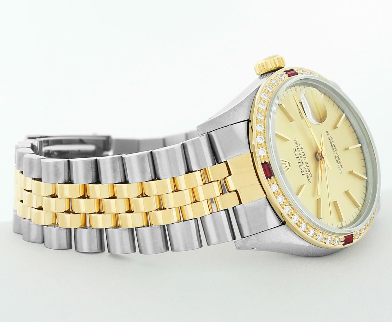 One Men's Rolex Quickset Pre Owned Two Tone 14K Yellow Gold And Stainless Steel Datejust Polished, Serviced & Electronically Tested, Rolex Yellow Gold & Stainless Steel Case: 36mm, Rolex 14K Yellow Gold Crown, Custom Bezel: New 18K Yellow Diamond + Ruby Beadset Bezel, Stone Count: 36 Diamonds + 4 Rubies, Total Weight .75 Carat, Clarity: SI-VS, Color: G to H. Custom Crystal: New Sapphire With Magnified Date Window. Custom Hands: New Luminescent Hands. Rolex Movement: Automatic Winding Movement 3035. Rolex Dial: Champagne Dial With Index Hour Markers Dash Track And Lumi Dots. Date Window: 3 O'Clock Position Date Display, Quickset, Model: Datejust. Condition: G-6 Extra Fine. Rolex Bracelet: Two Tone 14K Yellow Gold & Stainless Steel Jubilee Band. Bright Polish. 7.0 Inch Length, Adjustable. Standard Clasp, With Rolex Logo. This Watch Has Been Serviced Time Tested And Is In Excellent Condition It Is Free Of All Scratches And Dents.