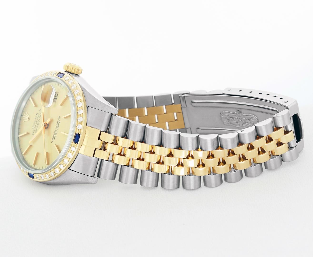 One Men's Rolex Quickset Pre Owned Two Tone 14K Yellow Gold And Stainless Steel Datejust Polished, Serviced & Electronically Tested, Rolex Yellow Gold & Stainless Steel Case: 36mm, Rolex 14K Yellow Gold Crown, Custom Bezel: New 18K Yellow Diamond + Sapphire Beadset Bezel, Stone Count: 36 Diamonds + 4 Sapphires, Total Weight .75 Carat, Clarity: SI-VS, Color: G to H. Custom Crystal: New Sapphire With Magnified Date Window. Custom Hands: New Luminescent Hands. Rolex Movement: Automatic Winding Movement 3035. Rolex Dial: Champagne Dial With Index Hour Markers Dash Track And Lumi Dots. Date Window: 3 O'Clock Position Date Display, Quickset, Model: Datejust. Condition: G-6 Extra Fine. Rolex Bracelet: Two Tone 14K Yellow Gold & Stainless Steel Jubilee Band. Bright Polish. 7.0 Inch Length, Adjustable. Standard Clasp, With Rolex Logo. This Watch Has Been Serviced Time Tested And Is In Excellent Condition It Is Free Of All Scratches And Dents.