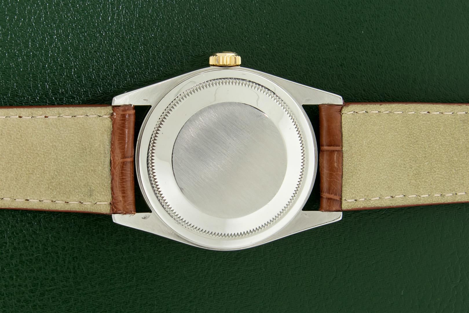 One Men's Pre Owned Yellow Gold Two Tone Rolex Datejust Polished, Serviced & Electronically Tested, Rolex Yellow Gold & Stainless Steel Case: 36mm, Rolex Yellow Gold Crown, Rolex Bezel: Yellow Gold Fluted Bezel. Custom Crystal: New Acrylic Cyclops Lens. Custom Hands: New Gold Hands. Rolex Movement: Automatic Winding Movement. Rolex Dial: Champagne With Index Hour Markers, Date Window: 3 O'Clock Position Date Display, Quickset, Model: Datejust. Condition: G-6 Extra Fine. Custom Band: New Brown Leather Band 7.0 Inch Length with New Custom Pin Buckle Clasp. This Watch Has Been Serviced And Polished It Is Free Of All Scratches And Dents.