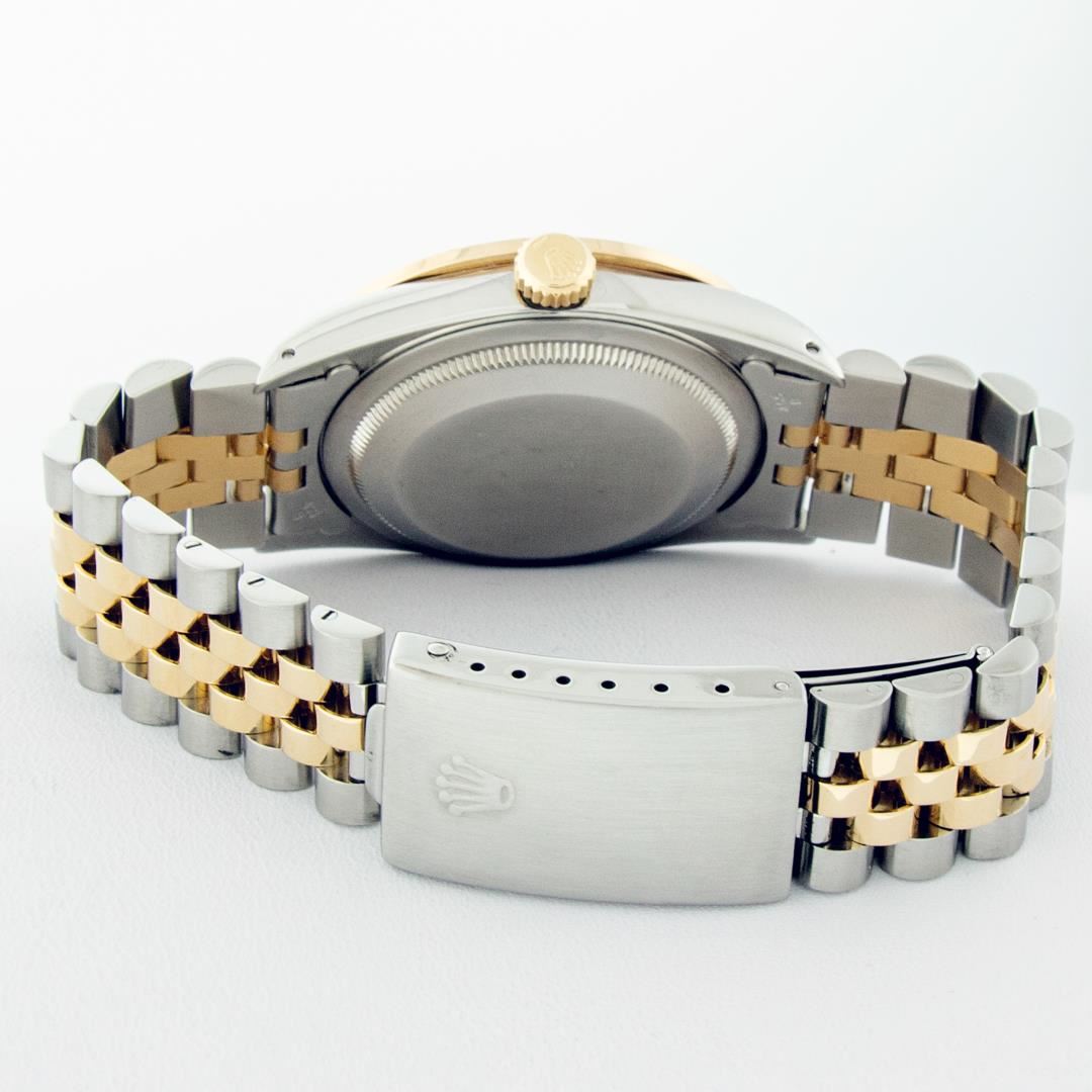 One Men's Rolex Quickset Pre Owned Two Tone 14K Yellow Gold And Stainless Steel Datejust Polished, Serviced & Electronically Tested, Rolex Yellow Gold & Stainless Steel Case: 36mm, Rolex Yellow Gold Crown, Custom Bezel: New 18K Yellow Gold Beadset Diamond Bezel, Diamond Count: 40 Diamonds On Bezel, Total Bezel Weight 2.5 Carat, Clarity: SI-VS, Color: G to H. Custom Crystal: New Sapphire With Magnified Date Window. Custom Hands: New Luminescent Hands. Rolex Movement: Automatic Winding Movement 3035. Rolex Dial: Champagne Jubilee Dial With Index Hour Markers and Small Track With Lumi Dots. Date Window: 3 O'Clock Position Date Display, Quickset, Model: Datejust. Condition: G-6 Extra Fine. Rolex Bracelet: Two Tone 14K Yellow Gold & Stainless Steel Jubilee Band. Bright Polish. 7.0 Inch Length, Adjustable. Standard Clasp, With Rolex Logo. This Watch Has Been Serviced Time Tested And Is In Excellent Condition It Is Free Of All Scratches And Dents.