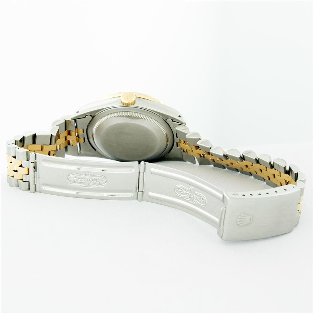 One Men's Pre Owned Yellow Gold Two Tone Rolex Datejust Polished, Serviced & Electronically Tested, Rolex Yellow Gold & Stainless Steel Case: 36mm,Rolex 14K Yellow Gold Crown, Custom Bezel: New 18K Yellow Gold Pyramid Diamond Bezel, Diamond Count: 24 Diamonds, Total Weight .75 Carat, Clarity: SI-VS, Color: G to H. Custom Crystal: New Scratch Resistant Synthetic Sapphire Cyclops Lens. Custom Hands: New Luminescent Hands. Rolex Movement: Automatic Winding Movement. Rolex Dial: Champagne Jubilee Dial With Index Hour Markers and Small Track With Lumi Dots. Date Window: 3 O'Clock Position Date Display, Quickset, Model: Datejust. Condition: G-6 Extra Fine. Rolex Bracelet: Two Tone Yellow Gold & Stainless Steel Jubilee Band. Bright Polish. 7.0 Inch Length, Adjustable. Standard Clasp, With Rolex Logo. This Watch Has Been Serviced Time Tested And Is In Excellent Condition It Is Free Of All Scratches And Dents.
