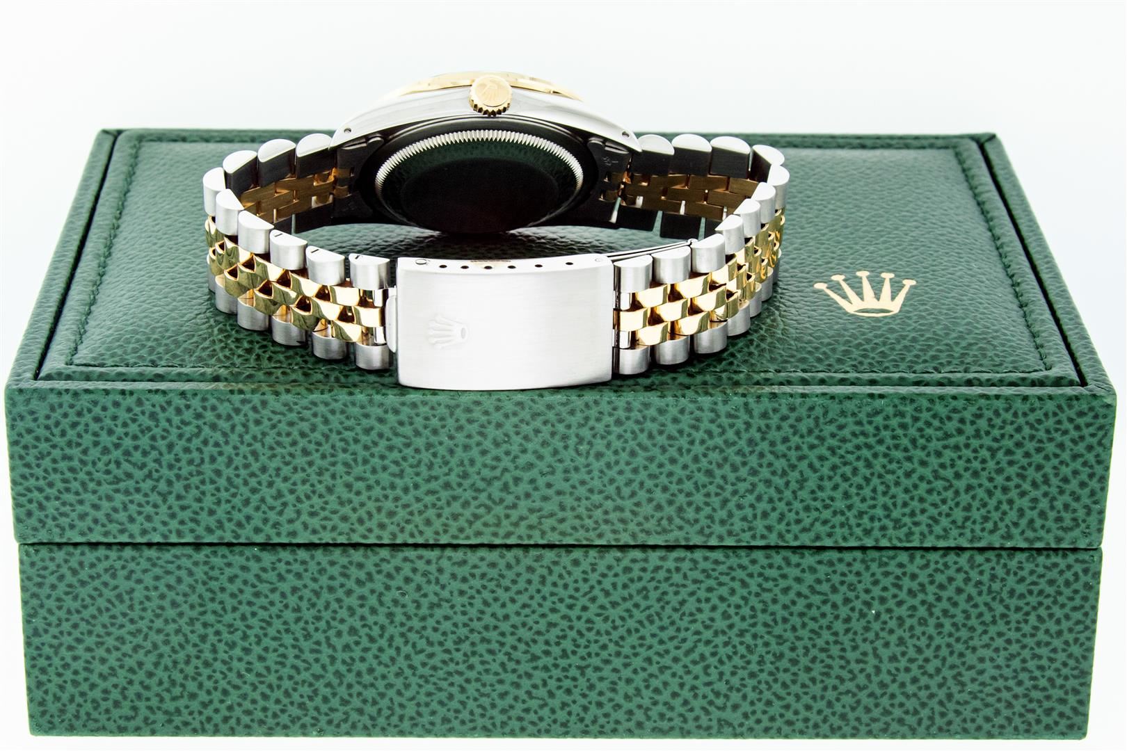 One Men's Pre Owned Yellow Gold Two Tone Rolex Datejust Polished, Serviced & Electronically Tested, Rolex Yellow Gold & Stainless Steel Case: 36mm, Rolex 14K Yellow Gold Crown, Custom Bezel: New 18K Yellow Gold Pyramid Diamond Bezel, Diamond Count: 24 Diamonds, Total Weight .75 Carat, Clarity: SI-VS, Color: G to H. Custom Crystal: New Sapphire With Magnified Date Window. Custom Hands: New Luminescent Hands. Rolex Movement: Automatic Winding Movement. Rolex Dial: Champagne Jubilee Dial With Index Hour Markers and Small Track With Lumi Dots. Date Window: 3 O'clock Position Date Display, Quickset, Model: Datejust. Condition: G-6 Extra Fine. Rolex Bracelet: Two Tone Yellow Gold & Stainless Steel Jubilee Band. Bright Polish. 7.0 Inch Length, Adjustable. Standard Clasp, With Rolex Logo. This Pre Owned Watch Has Been Serviced Time Tested And Is In Excellent Condition It Is Free Of All Scratches And Dents. This Watch Comes With A Rolex Box.