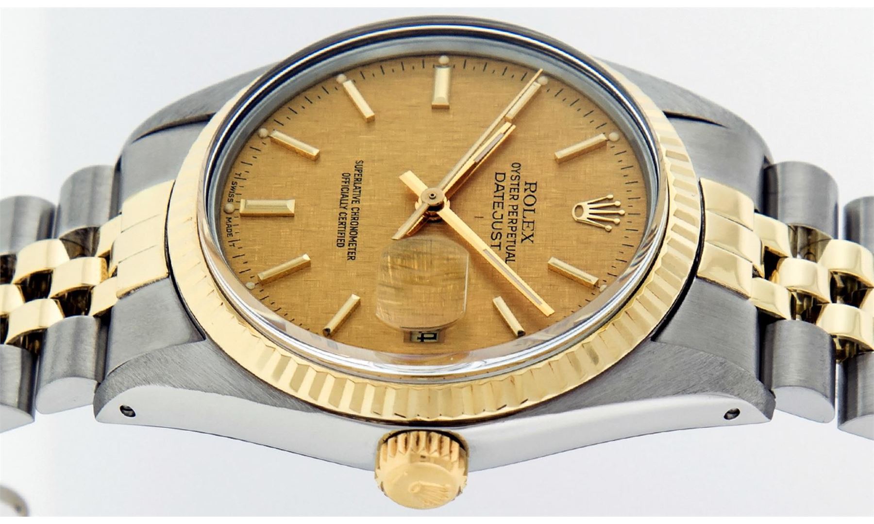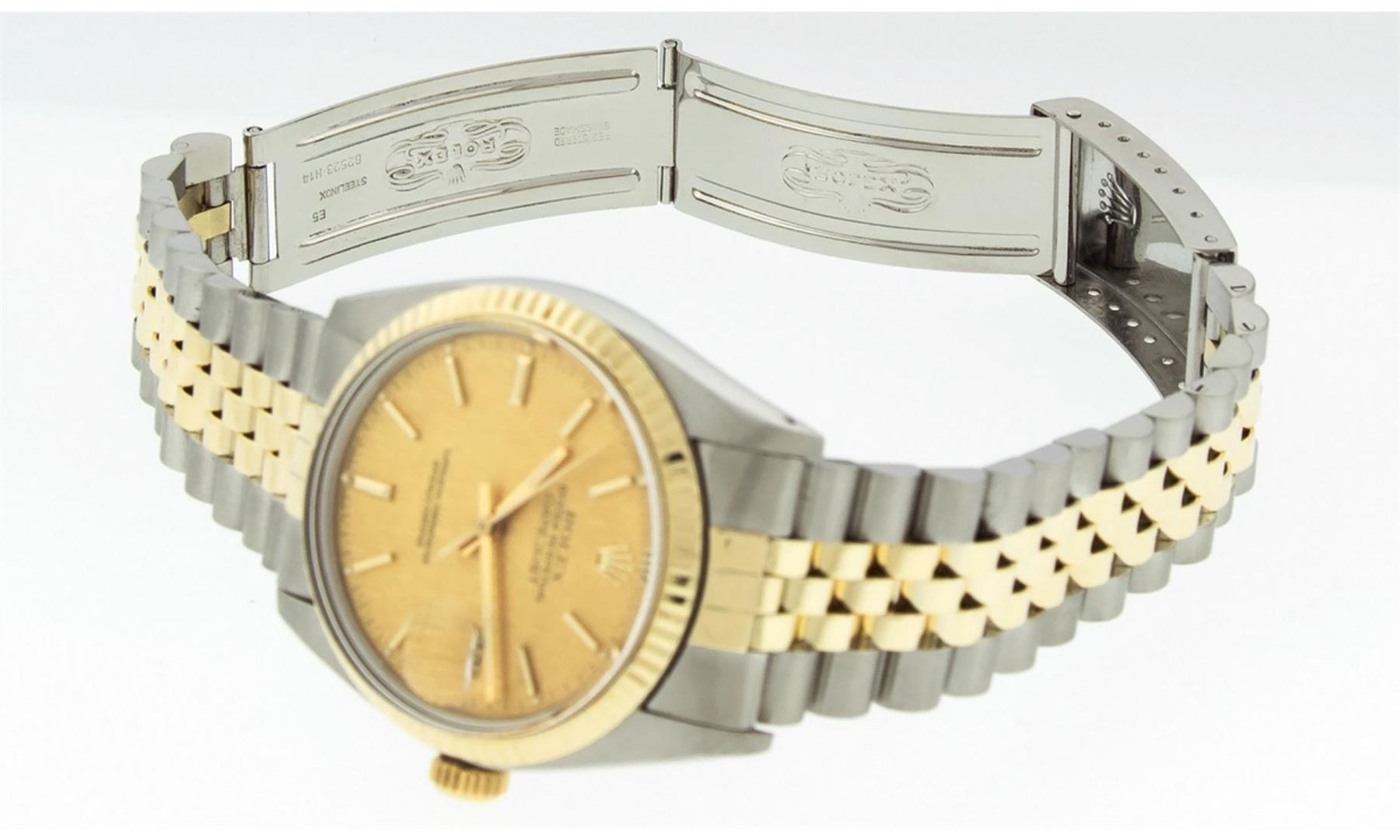One Men's Rolex Pre Owned Quickset Two Tone 14K Yellow Gold And Stainless Steel Datejust Polished, Serviced & Electronically Tested, Yellow Gold & Stainless Steel Case: 36mm, Yellow Gold Crown, Rolex Bezel: 14K Yellow Gold Fluted Bezel. Custom Crystal: New Acrylic With Magnified Date Window. Hands: Luminescent Hands. Rolex Movement: Automatic Winding Movement 3035. Rolex Dial: Champagne Linen Dial With Index Hour Markers and Small Track With Lumi Dots. Date Window: 3 O'Clock Position Date Display, Quickset, Model: Datejust. Condition: G-6 Extra Fine. Rolex Bracelet: Two Tone 14K Yellow Gold & Stainless Steel Jubilee Band. Bright Polish. 7.0 Inch Length, Adjustable. Standard Clasp, With Rolex Logo. This Watch Has Been Serviced Time Tested And Is In Excellent Condition It Is Free Of All Scratches And Dents.