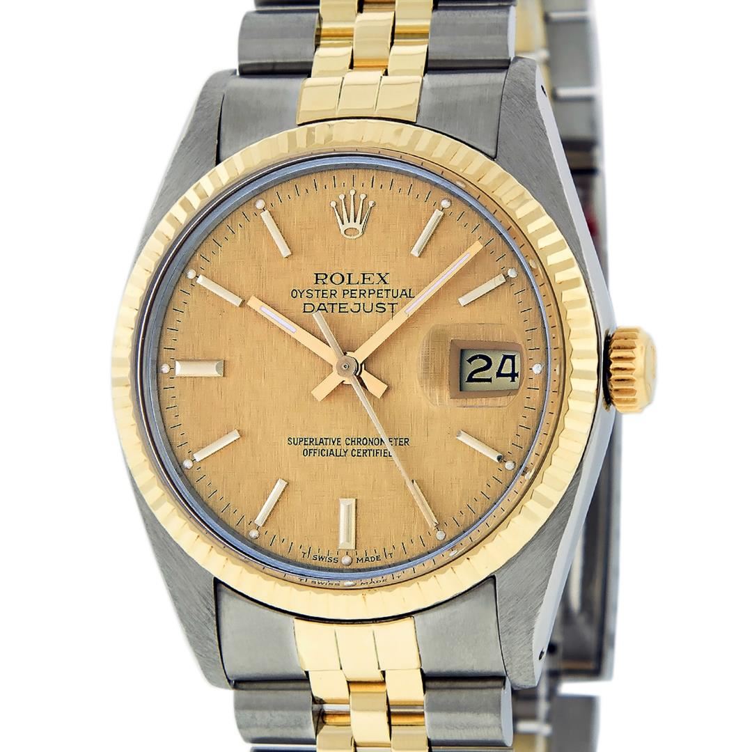 One Men's Pre Owned Quickset Two Tone 14K Yellow Gold And Stainless Steel Datejust Polished, Serviced & Electronically Tested, Yellow Gold & Stainless Steel Case: 36mm, Yellow Gold Crown, Rolex Bezel: 14K Yellow Gold Fluted Bezel. Custom Crystal: New Acrylic With Magnified Date Window. Hands: Luminescent Hands. Rolex Movement: Automatic Winding Movement 3035. Rolex Dial: Champagne Linen Dial With Index Hour Markers and Small Track With Lumi Dots. Date Window: 3 O'Clock Position Date Display, Quickset, Model: Datejust. Condition: G-6 Extra Fine. Rolex Bracelet: Two Tone 14K Yellow Gold & Stainless Steel Jubilee Band. Bright Polish. 7.0 Inch Length, Adjustable. Standard Clasp, With Rolex Logo. This Watch Has Been Serviced Time Tested And Is In Excellent Condition It Is Free Of All Scratches And Dents.