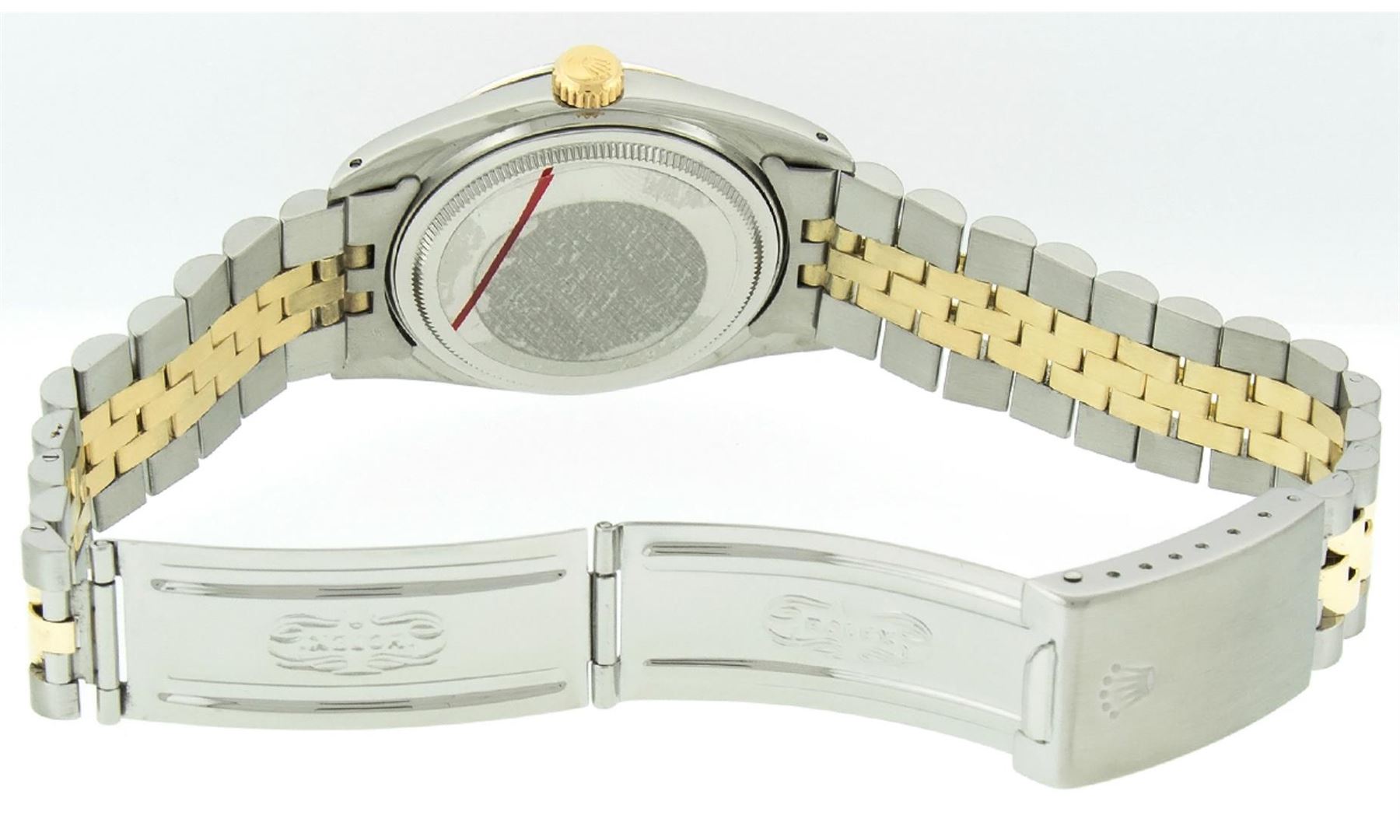 One Men's Rolex Pre Owned Quickset Two Tone 14K Yellow Gold And Stainless Steel Datejust Polished, Serviced & Electronically Tested, Yellow Gold & Stainless Steel Case: 36mm, Yellow Gold Crown, Rolex Bezel: 14K Yellow Gold Fluted Bezel. Custom Crystal: New Acrylic With Magnified Date Window. Hands: Luminescent Hands. Rolex Movement: Automatic Winding Movement 3035. Rolex Dial: Champagne Linen Dial With Index Hour Markers and Small Track With Lumi Dots. Date Window: 3 O'Clock Position Date Display, Quickset, Model: Datejust. Condition: G-6 Extra Fine. Rolex Bracelet: Two Tone 14K Yellow Gold & Stainless Steel Jubilee Band. Bright Polish. 7.0 Inch Length, Adjustable. Standard Clasp, With Rolex Logo. This Watch Has Been Serviced Time Tested And Is In Excellent Condition It Is Free Of All Scratches And Dents.