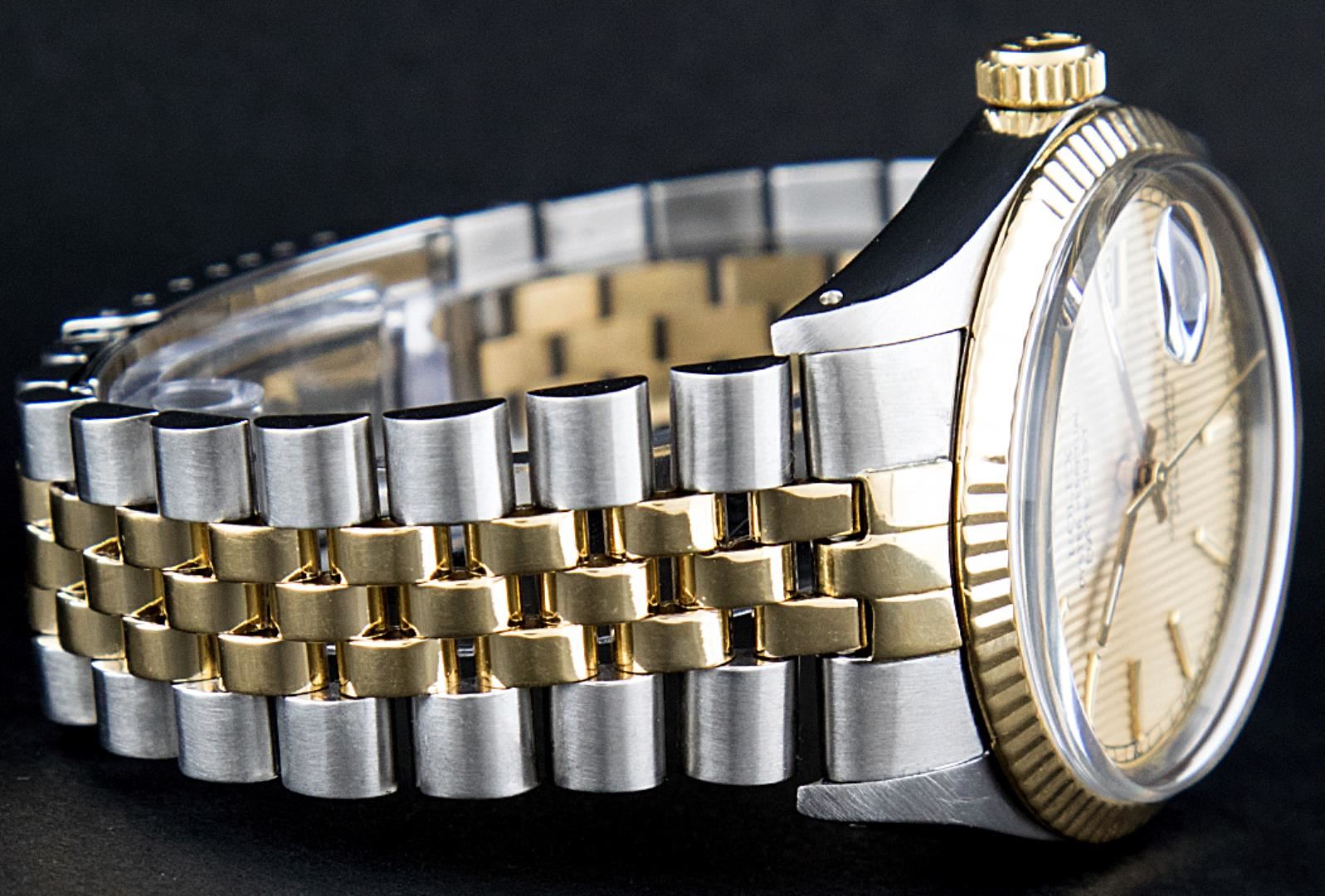 One Men's Rolex Pre Owned 14K Two Tone Yellow Gold And Stainless Steel Datejust Polished, Serviced & Electronically Tested, Rolex Yellow Gold & Stainless Steel Case: 36mm, Rolex Yellow Gold Crown, Rolex Bezel: 14K Yellow Gold Fluted Bezel. Custom Crystal: New Acrylic With Magnified Date Window. Custom Hands: New Luminescent Hands. Rolex Movement: Automatic Winding Movement 3035. Rolex Dial: Champagne Tapestry Index Dial With Roman Square Track. Date Window: 3 O'Clock Position Date Display, Quickset, Model: Datejust. Condition: G-6 Extra Fine. Rolex Bracelet: Two Tone 14K Yellow Gold & Stainless Steel Jubilee Band. Bright Polish. 7.0 Inch Length, Adjustable. Standard Clasp, With Rolex Logo. This Watch Has Been Serviced Time Tested And Is In Excellent Condition It Is Free Of All Scratches And Dents.