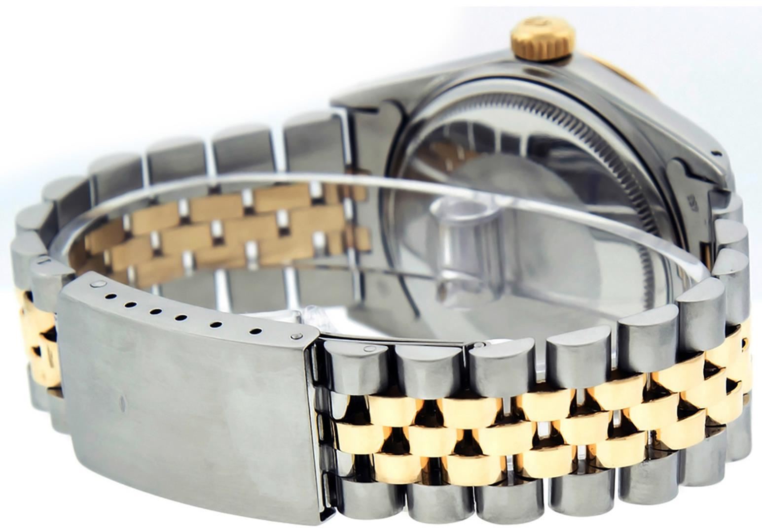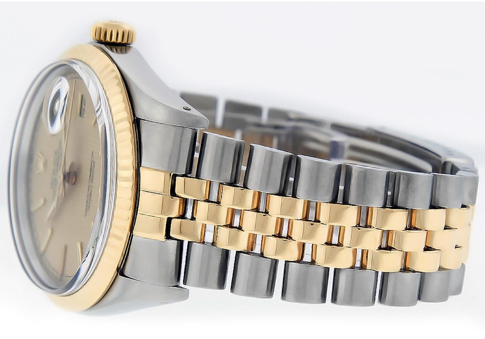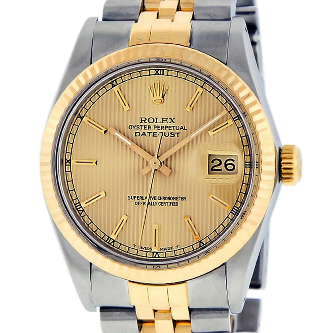 One Men's Rolex Pre Owned 14K Two Tone Yellow Gold And Stainless Steel Datejust Polished, Serviced & Electronically Tested, Rolex Yellow Gold & Stainless Steel Case: 36mm, Rolex Yellow Gold Crown, Rolex Bezel: 14K Yellow Gold Fluted Bezel. Custom Crystal: New Acrylic With Magnified Date Window. Custom Hands: New Luminescent Hands. Rolex Movement: Automatic Winding Movement 3035. Rolex Dial: Champagne Tapestry Index Dial With Roman Square Track. Date Window: 3 O'Clock Position Date Display, Quickset, Model: Datejust. Condition: G-6 Extra Fine. Rolex Bracelet: Two Tone 14K Yellow Gold & Stainless Steel Jubilee Band. Bright Polish. 7.0 Inch Length, Adjustable. Standard Clasp, With Rolex Logo. This Watch Has Been Serviced Time Tested And Is In Excellent Condition It Is Free Of All Scratches And Dents.