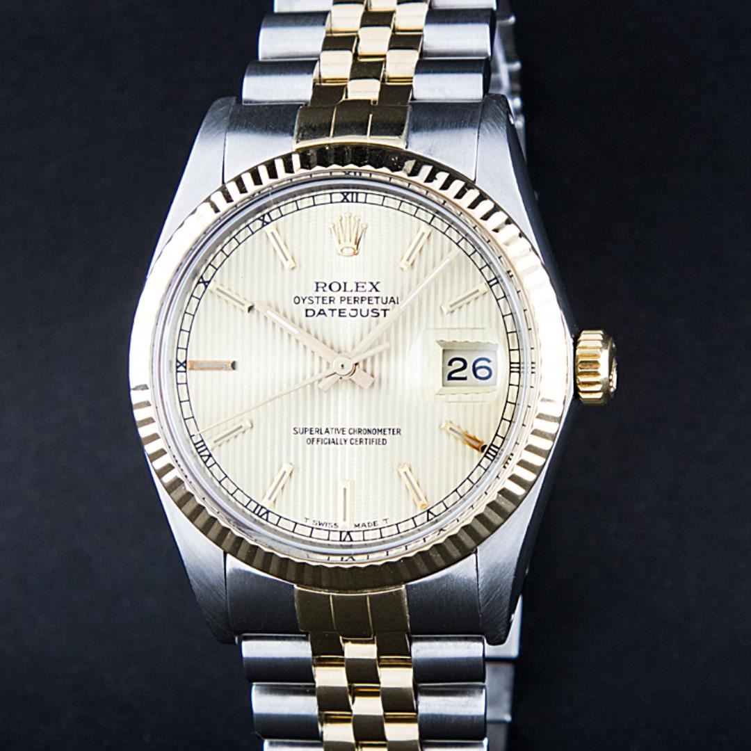 One Men's Rolex Pre Owned 14K Two Tone Yellow Gold And Stainless Steel Datejust Polished, Serviced & Electronically Tested, Rolex Yellow Gold & Stainless Steel Case: 36mm, Rolex Yellow Gold Crown, Rolex Bezel: 14K Yellow Gold Fluted Bezel. Custom Crystal: New Acrylic With Magnified Date Window. Custom Hands: New Luminescent Hands. Rolex Movement: Automatic Winding Movement 3035. Rolex Dial: Champagne Tapestry Index Dial With Roman Square Track. Date Window: 3 O'Clock Position Date Display, Quickset, Model: Datejust. Condition: G-6 Extra Fine. Rolex Bracelet: Two Tone 14K Yellow Gold & Stainless Steel Jubilee Band. Bright Polish. 7.0 Inch Length, Adjustable. Standard Clasp, With Rolex Logo. This Watch Has Been Serviced Time Tested And Is In Excellent Condition It Is Free Of All Scratches And Dents.