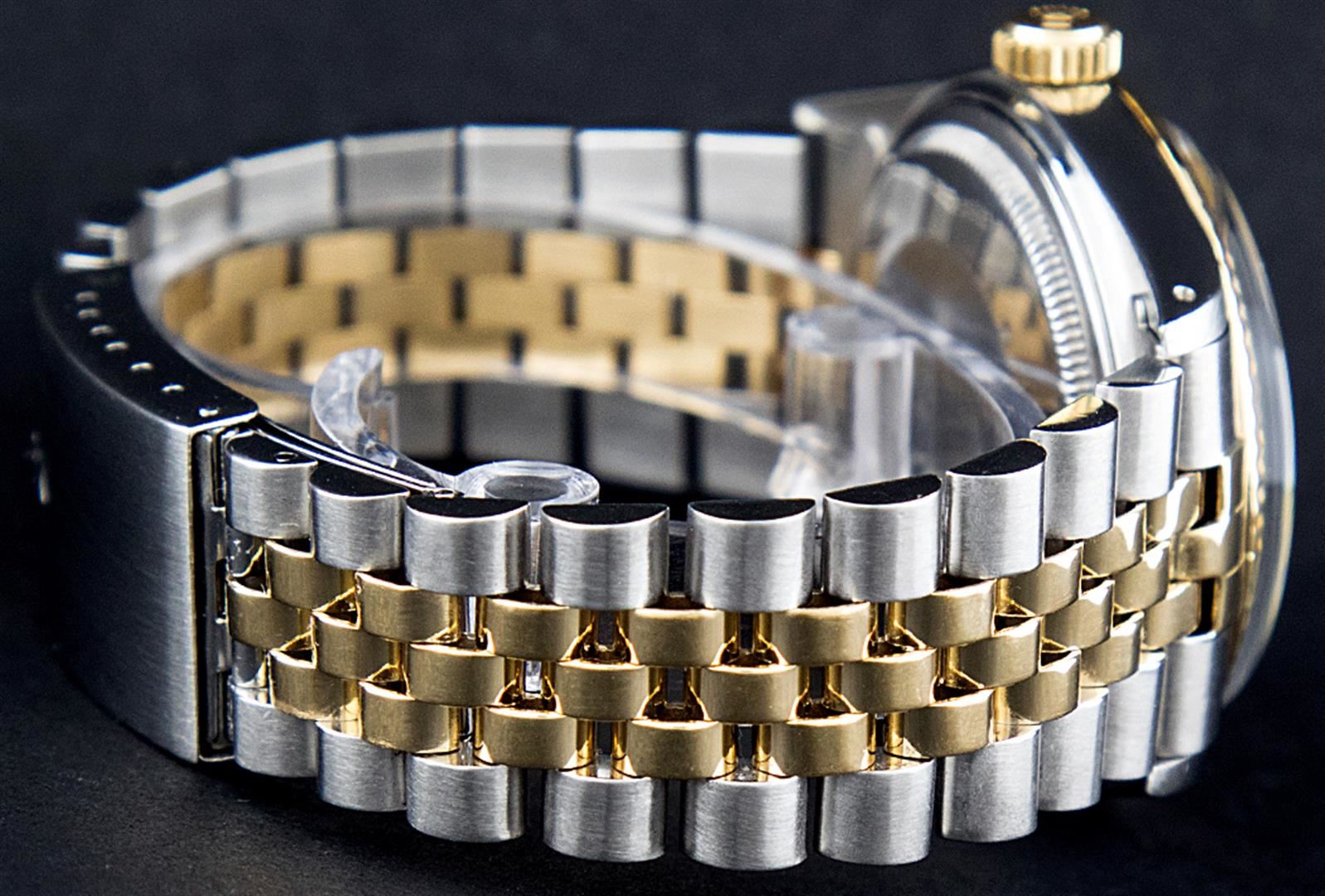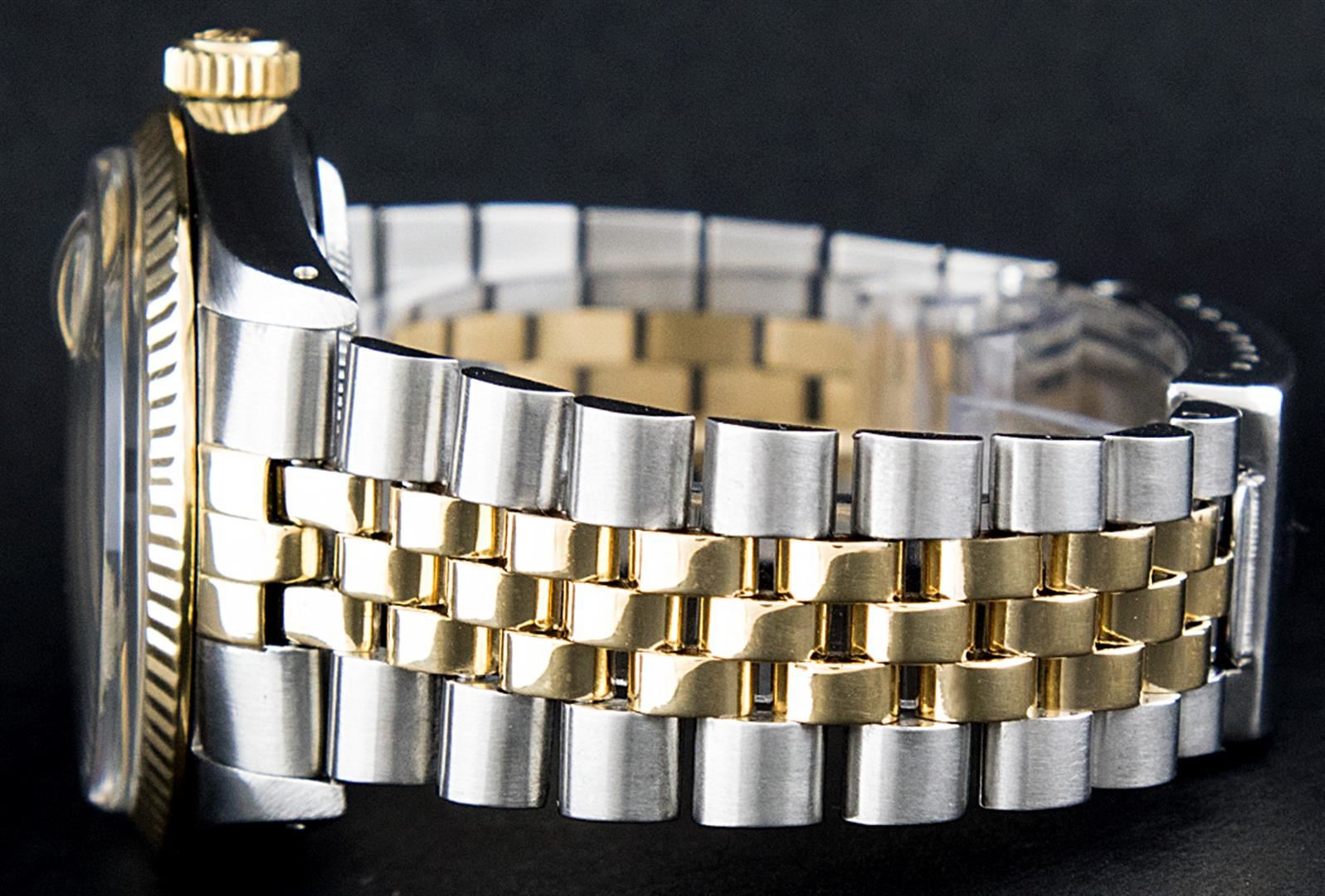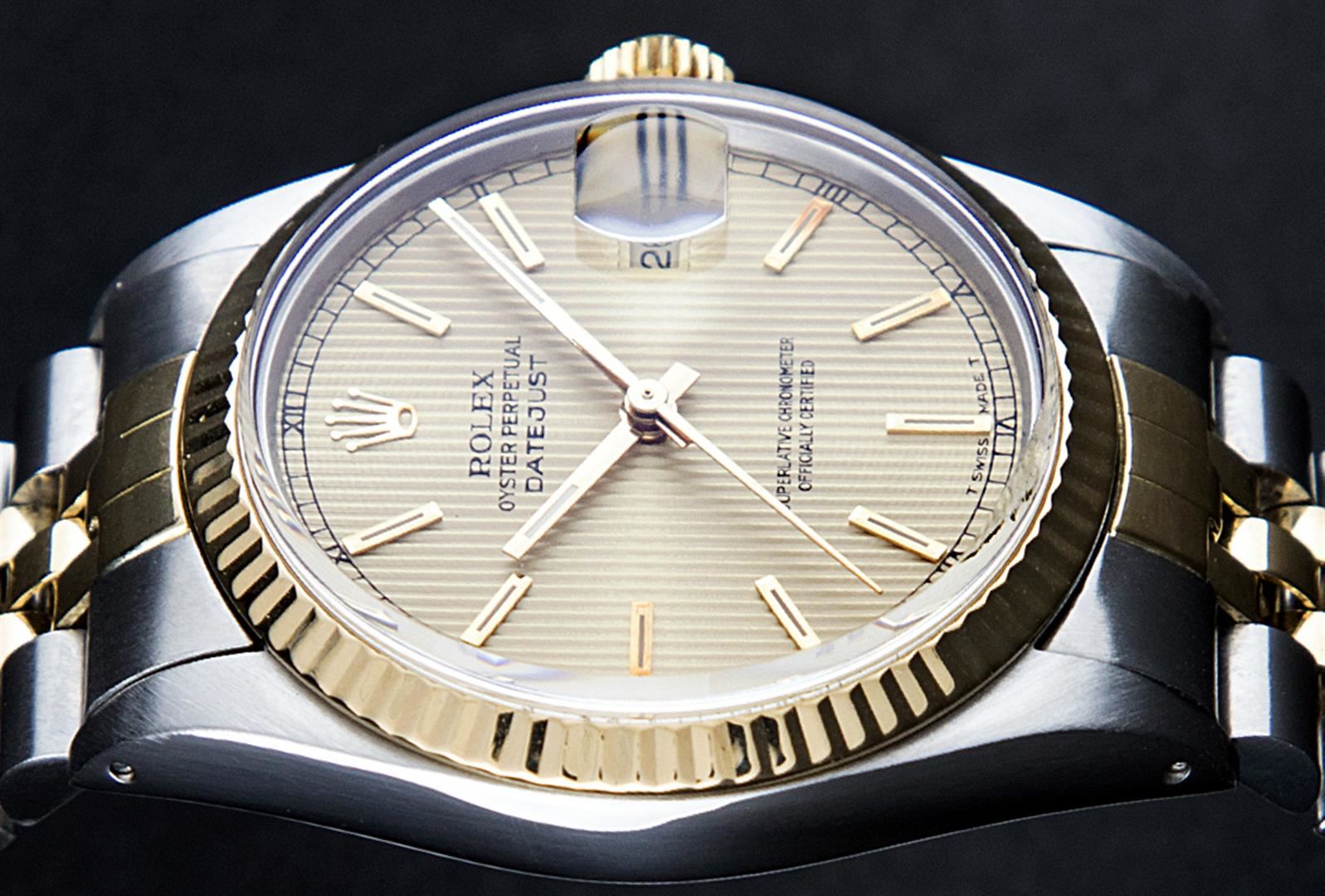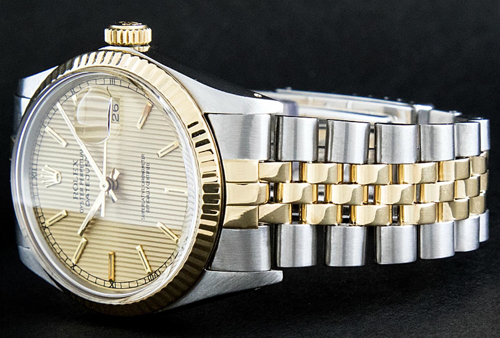 One Men's Pre Owned Yellow Gold Two Tone Rolex Datejust Polished, Serviced & Electronically Tested, Rolex Yellow Gold & Stainless Steel Case: 36mm, Rolex Yellow Gold Crown, Rolex Bezel: Yellow Gold Fluted Bezel. Custom Crystal: New Acrylic Cyclops Lens. Hands: Luminescent Hands. Rolex Movement: Automatic Winding Movement. Dial: Champagne Tapestry Index Dial With Roman Square Track. Date Window: 3 O'Clock Position Date Display, Quickset, Model: Datejust. Condition: G-6 Extra Fine. Rolex Bracelet: Two Tone Yellow Gold & Stainless Steel Jubilee Band. Bright Polish. 7.0 Inch Length, Adjustable. Standard Clasp, With Rolex Logo. This Watch Has Been Serviced Time Tested And Is In Excellent Condition It Is Free Of All Scratches And Dents.