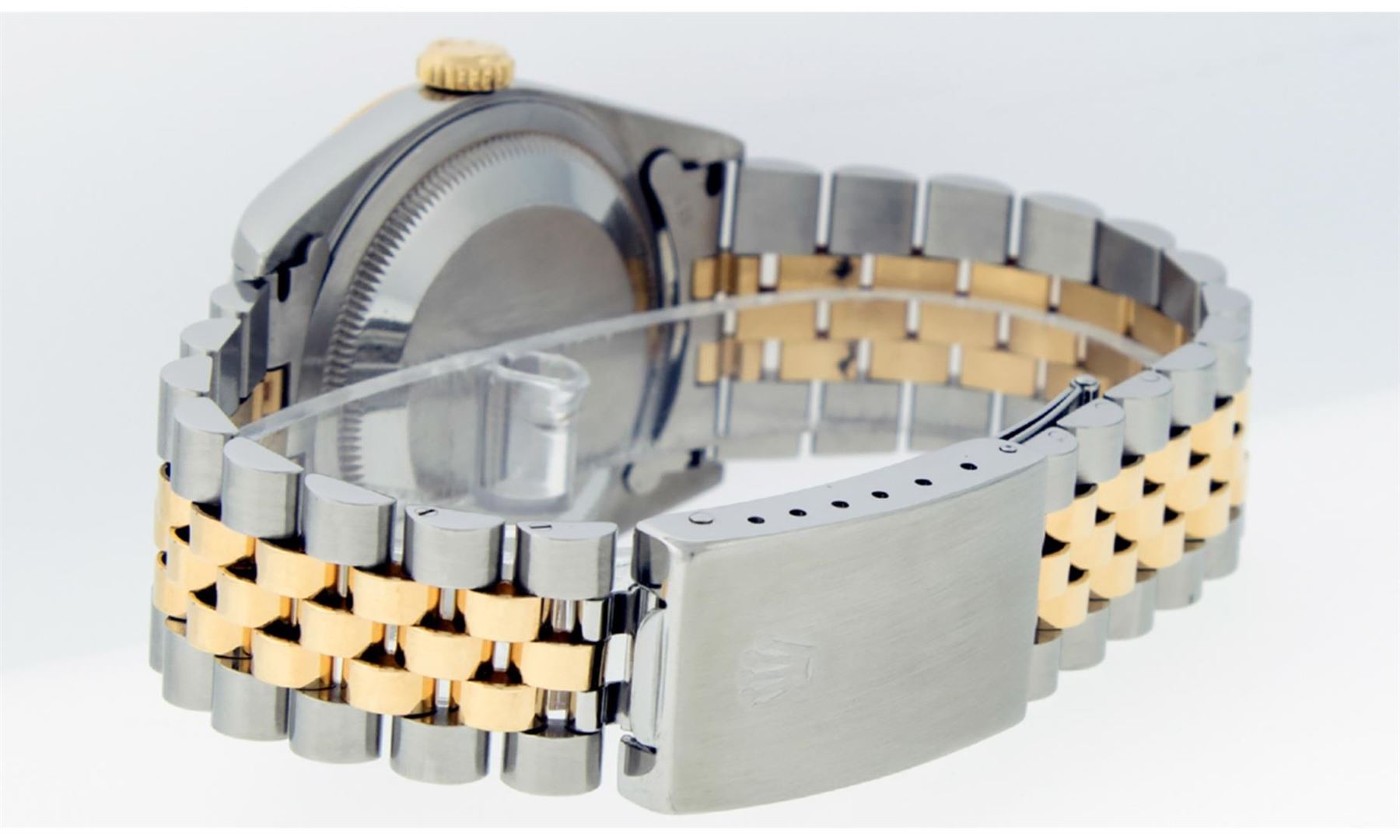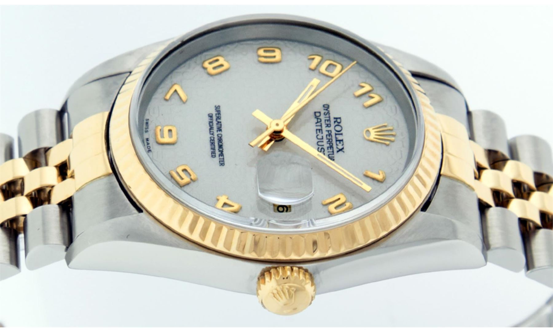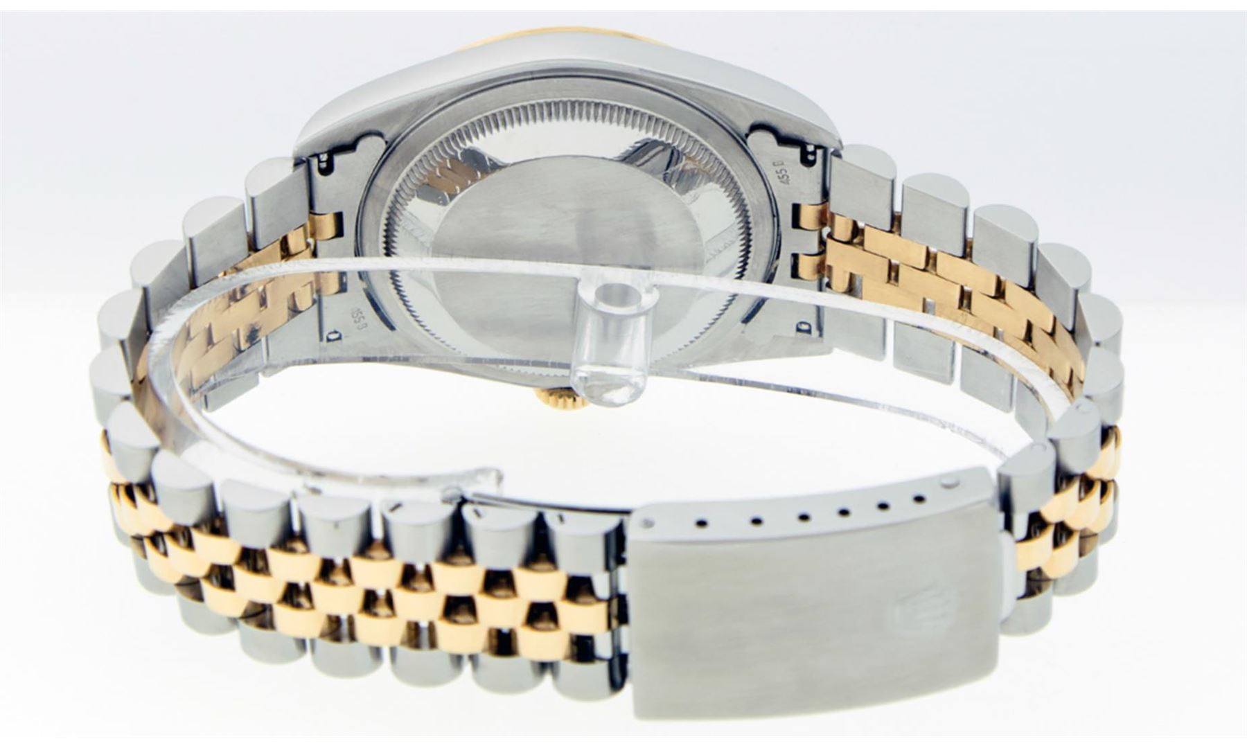 One Men's Rolex Two Tone 18K Yellow Gold And Stainless Steel Datejust Polished, Serviced & Electronically Tested, Yellow Gold & Stainless Steel Case: 36mm, 18K Yellow Gold Crown, Rolex Bezel: 18K Yellow Gold Fluted Bezel. Crystal: Sapphire With Magnified Date Window. Custom Hands: New Luminescent Hands. Rolex Movement: Automatic Winding Movement 3135. Rolex Dial: Cream Jubilee Dial With Arabic Hour Markers. Date Window: 3 O'Clock Position Date Display, Quickset, Model: Datejust. Condition: G-6 Extra Fine. Rolex Bracelet: Two Tone 18K Yellow Gold & Stainless Steel Jubilee Band. Bright Polish. 7.0 Inch Length, Adjustable. Standard Clasp, With Rolex Logo. This Watch Has Been Serviced Time Tested And Is In Excellent Condition It Is Free Of All Scratches And Dents.